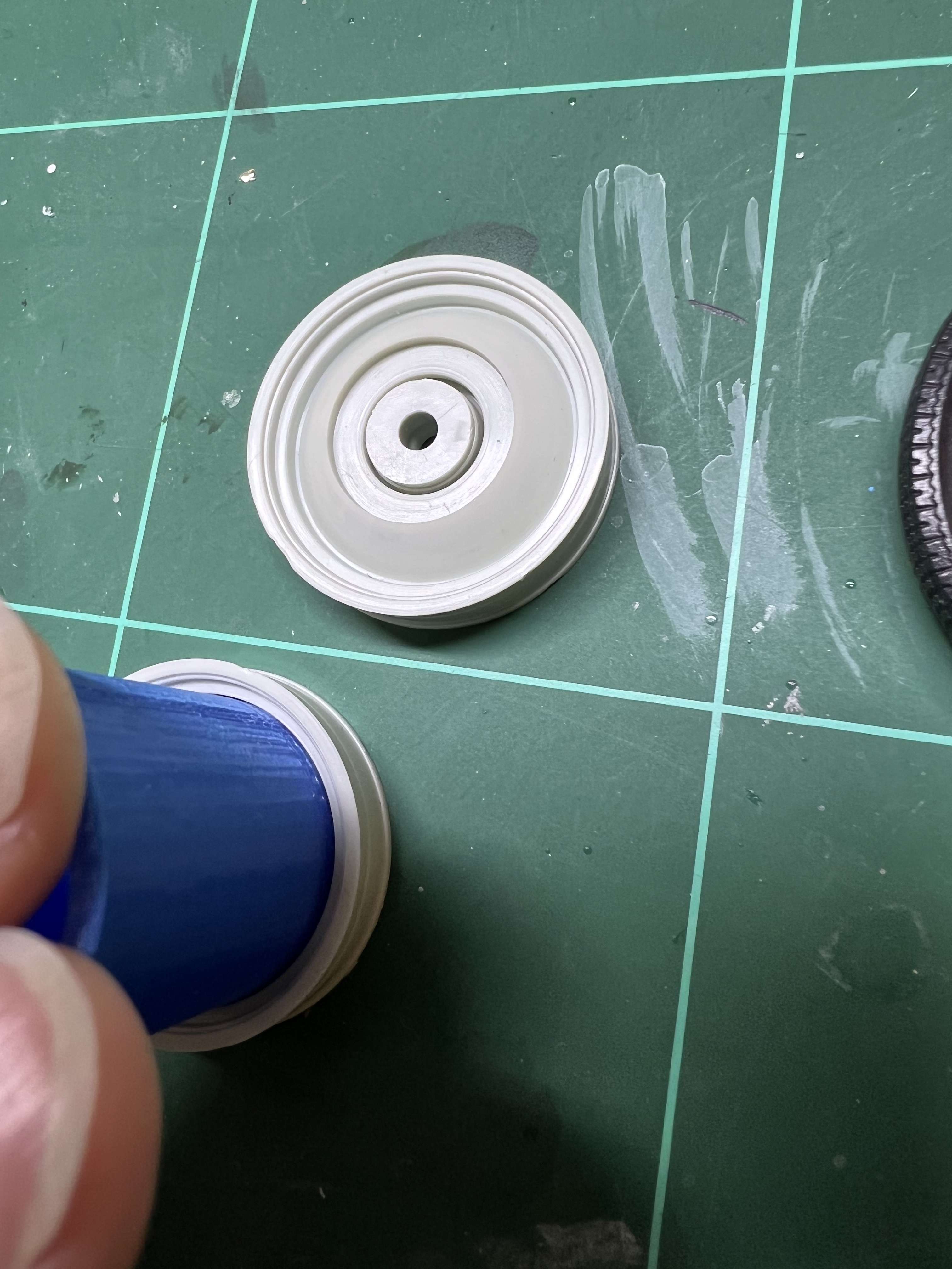 Ich habe mir mit meinem 3D-Drucker ein paar Hülsen gedruckt, die genau über die Mitte der Felge passen, so kann ich gut drumherum lackieren.