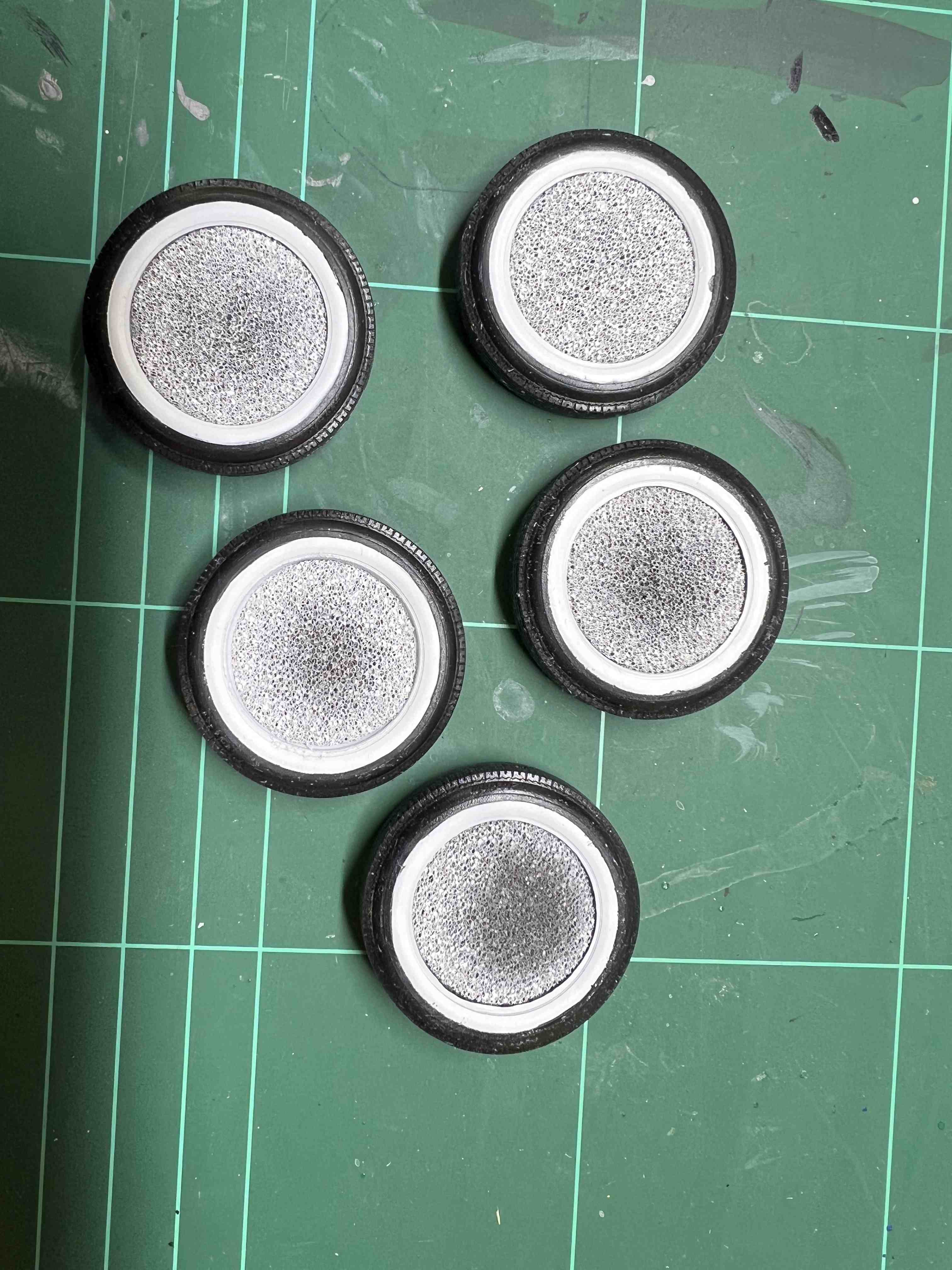 In die Gummireifen habe ich dann noch ein Stück Schaumstoff geklemmt, so dass ich ohne viel Umstände lackieren kann.