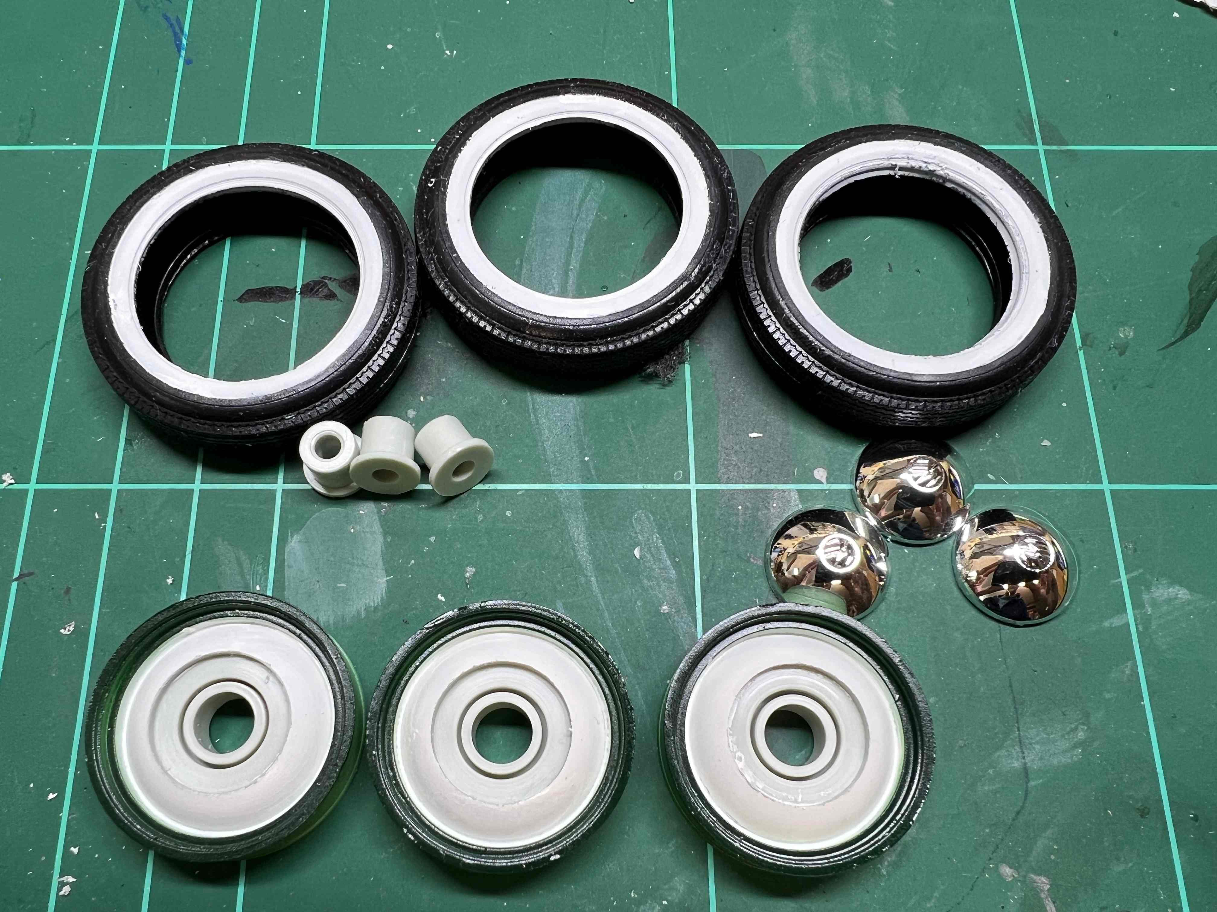 Ich habe mich im nächsten Schritt den Felgen und Reifen gewidmet. Das ganze ist recht unspektakulär, denn die Räder bestehen aus den Felgen, Gummireifen und verchromte Radkappen.
