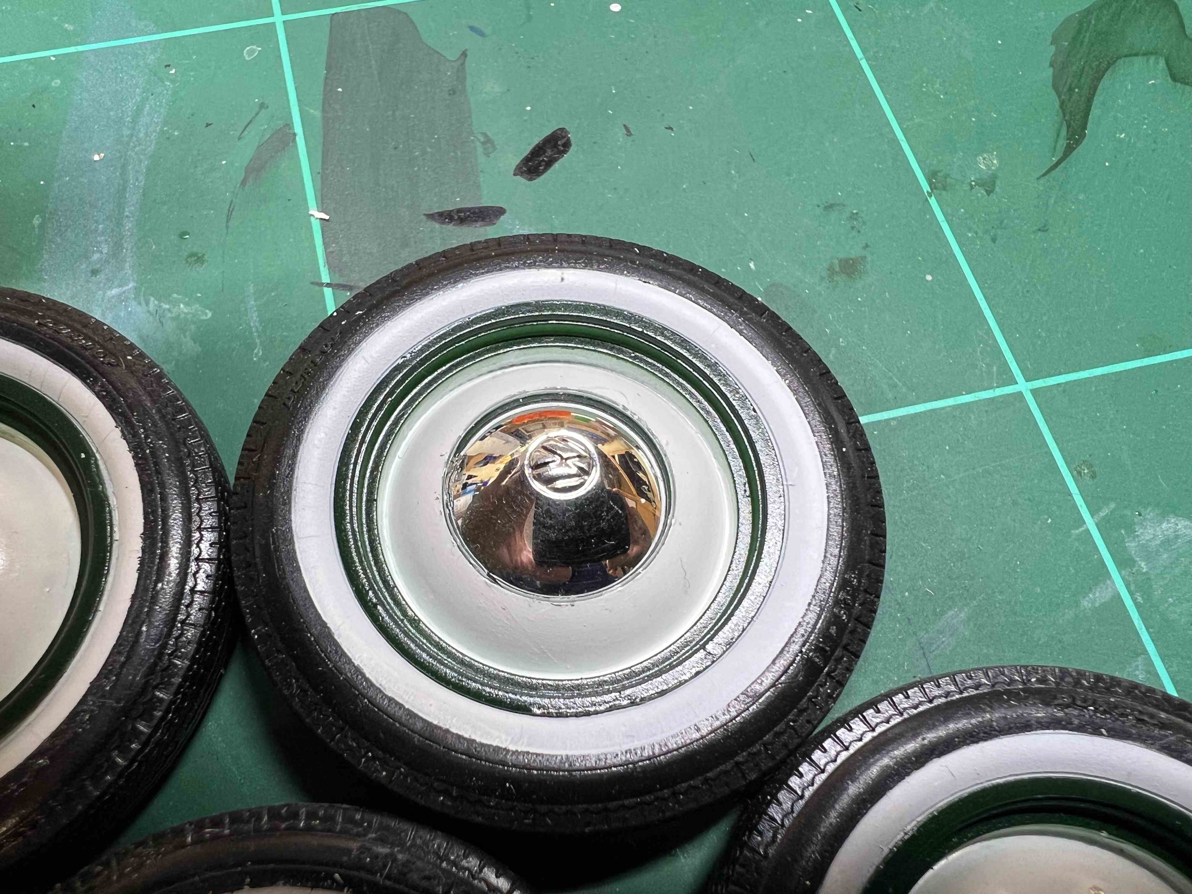Das Ergebnis ist ganz gut geworden und ich kann mich im nächsten Schritt auf die Reifen stürzen. Die Reifen sind nämlich bim Karmann Ghia oft Weißwand-Reifen gewesen.