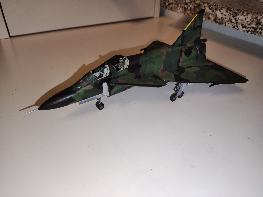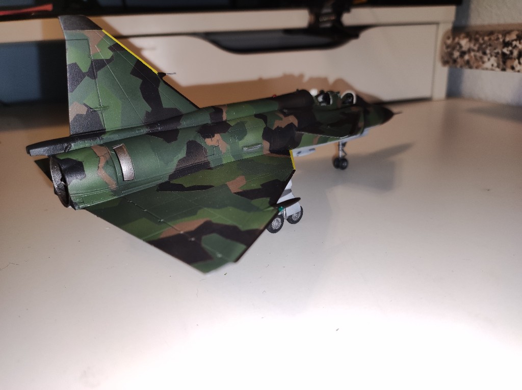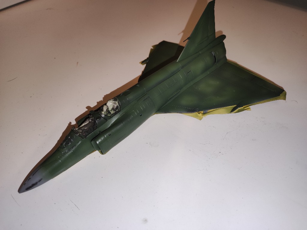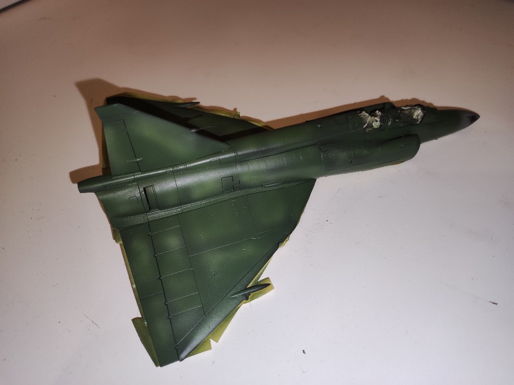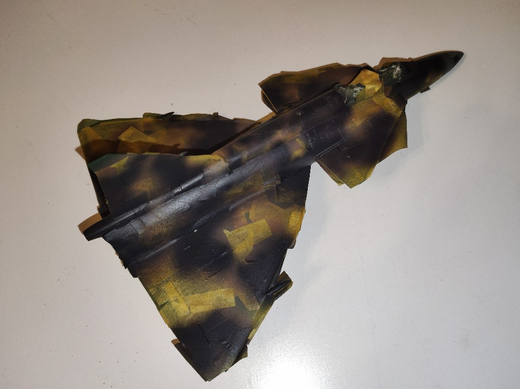 Nach vielen Abkleben war es nun soweit die letzte Farbe "Nato-Schwarz" kam auf den Flieger. Mittlerweile lässt sich das Ergebnis kaum noch abtasten. Das werde ich dann alles morgen erst sehen, wenn ich das ganze abziehe.