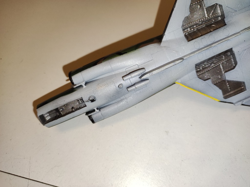 Insgesamt ist das aber auch nicht schlimm, da ich sowieso noch einige Stellen lackieren muss, wie die vorderen Flügelkanten, die Nase oder die Turbine bzw der Lufteinlass. Also nochmal alles abkleben, dieses Mal etwas ausmessen, dass es auch gerade Linien werden und dann sind wir hier soweit