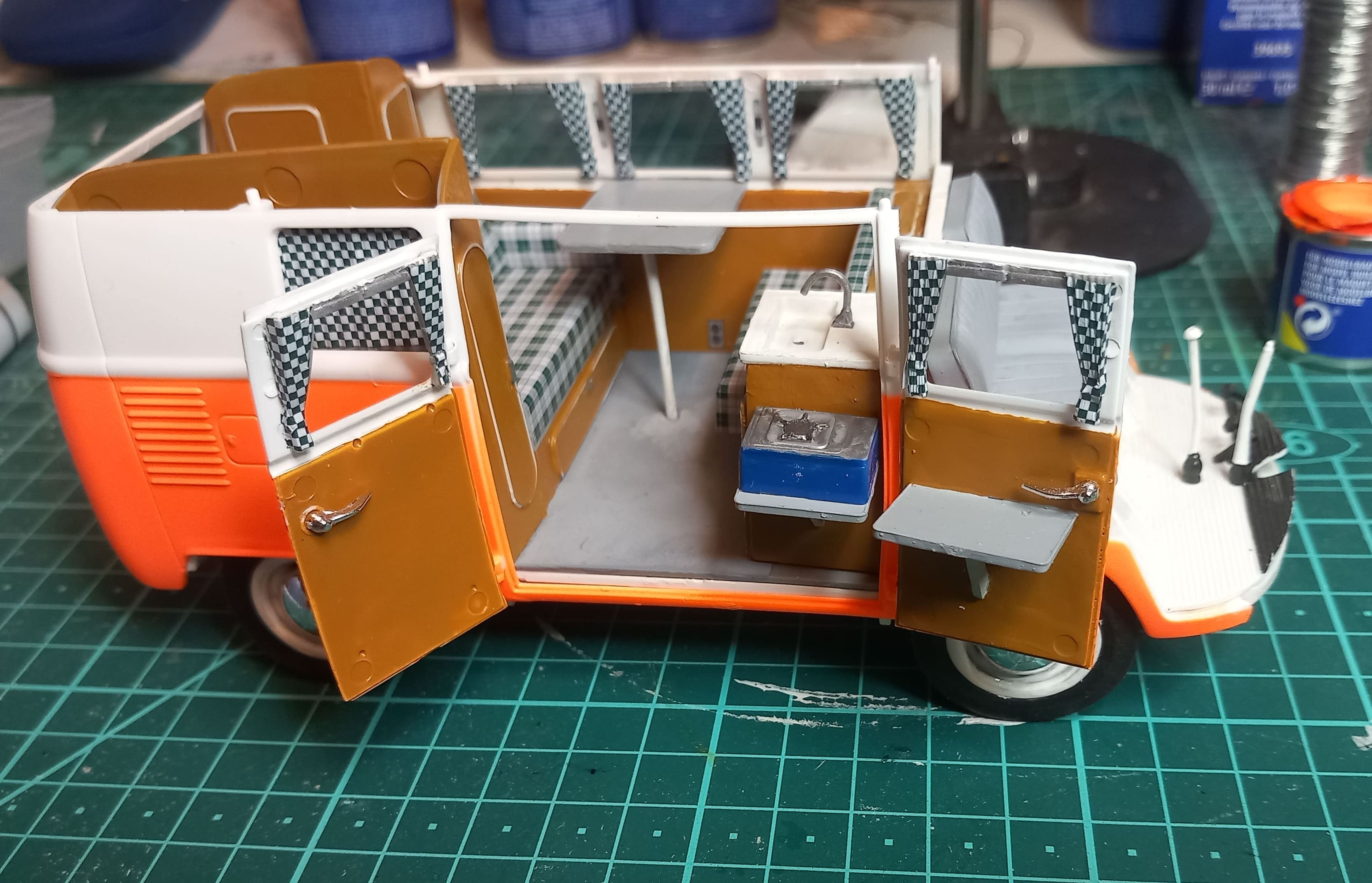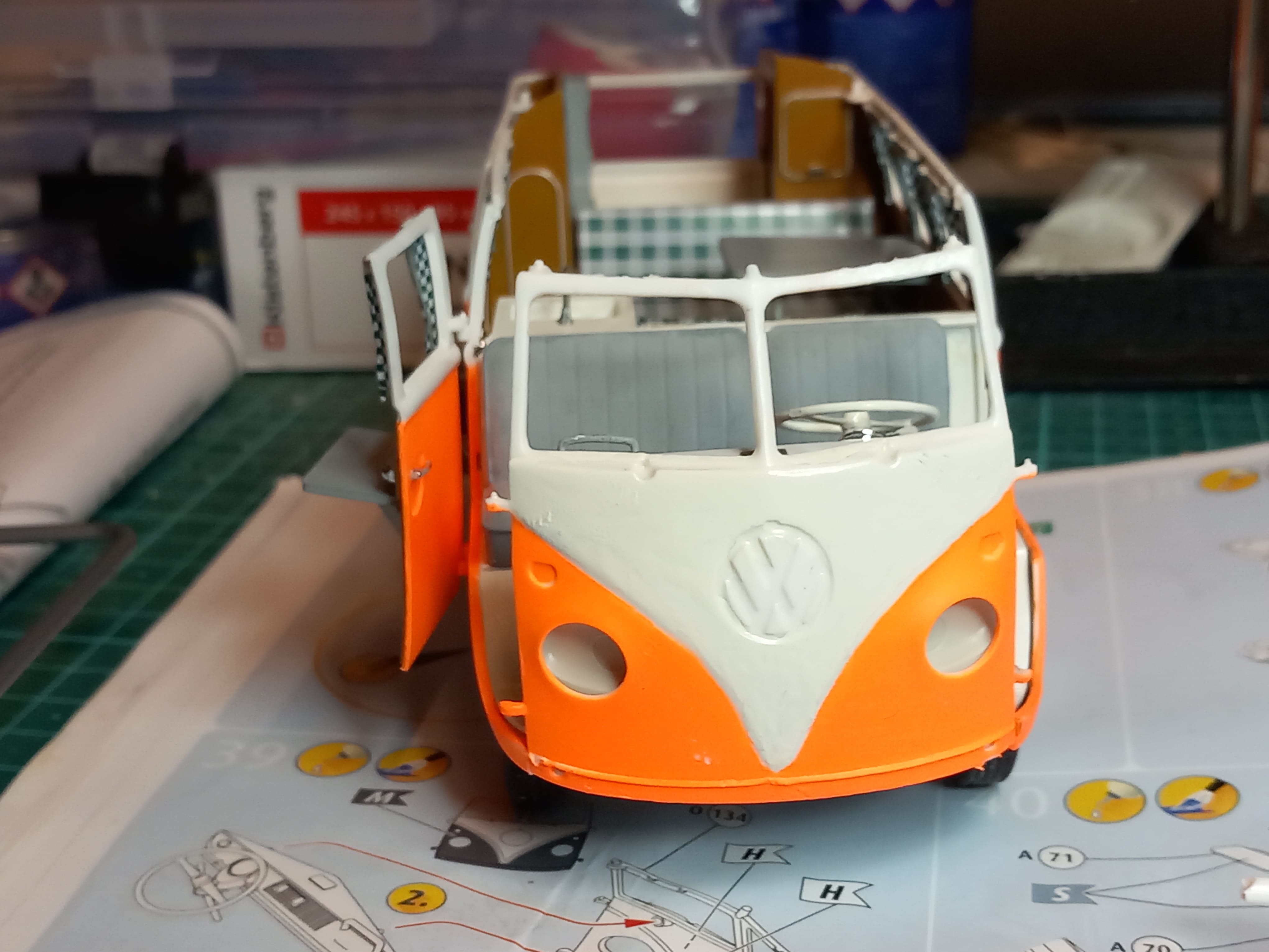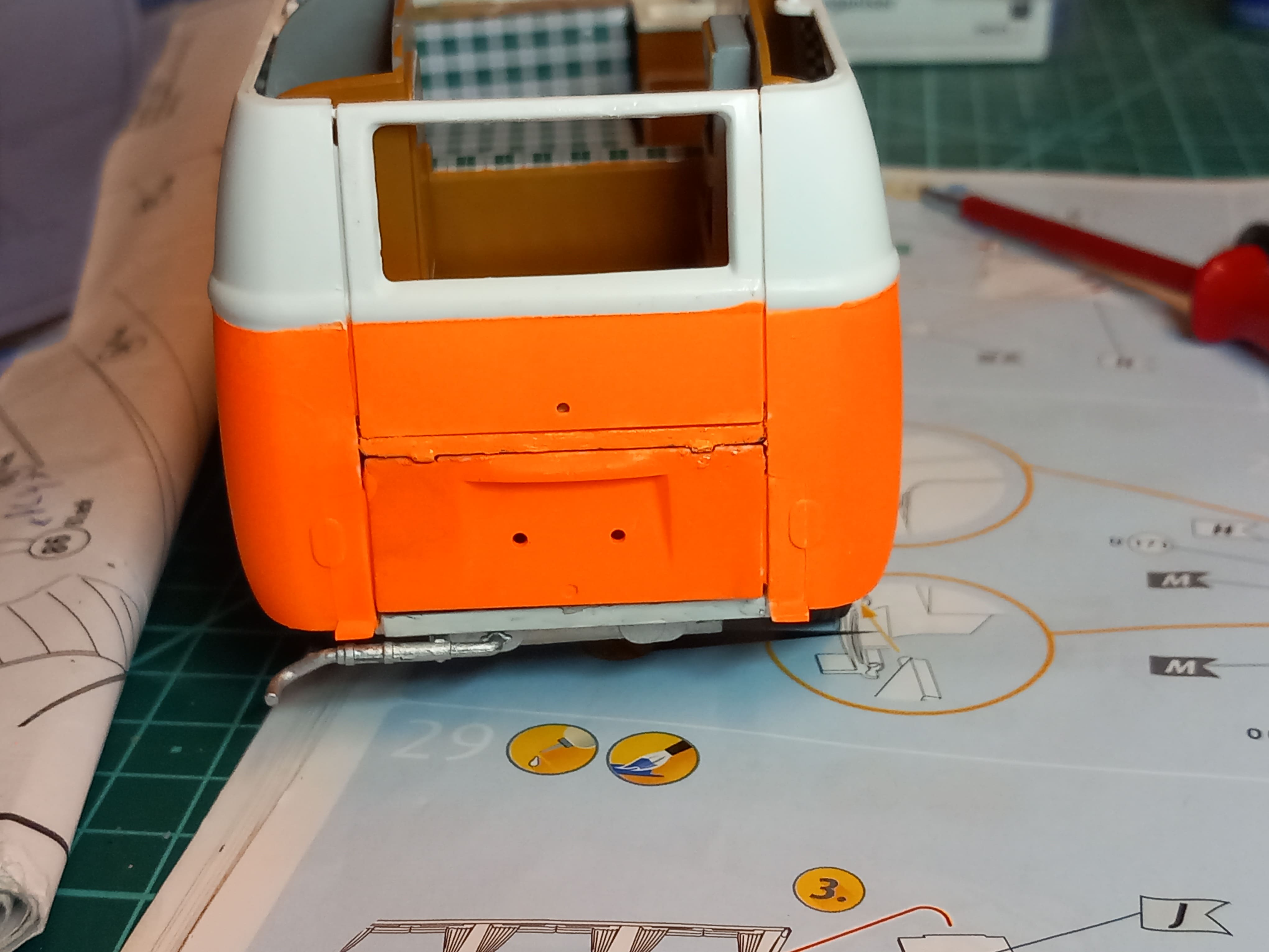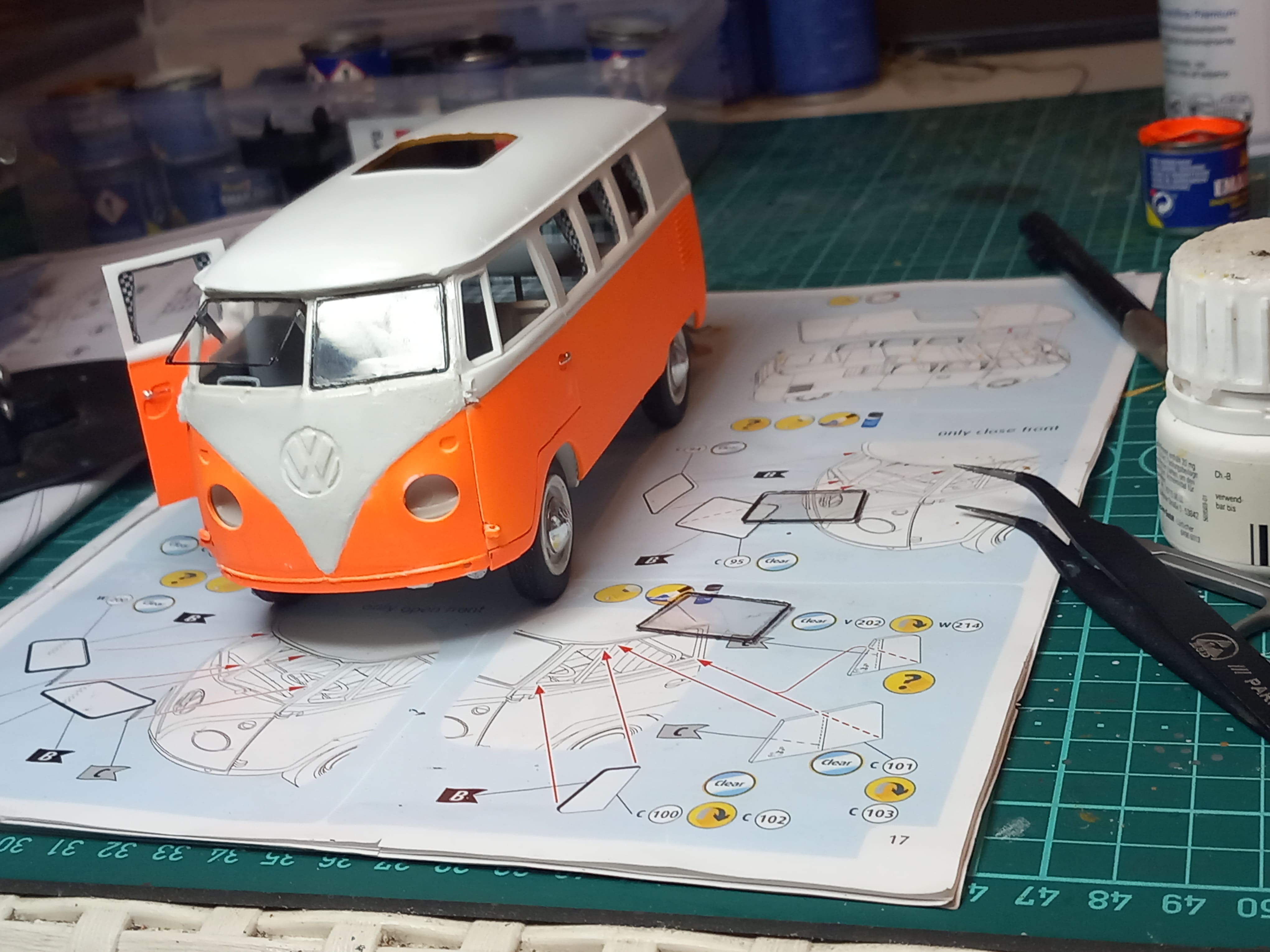 Auch die rechte Seite vom Camper ist vorbereitet. Das Aufsetzen der beiden Seiten auf das Chassis ist alles andere als einfach weil gleichzeitig die Heckklappe und die Motorklappe eingesetzt werden sollen. Beim ersten Versuch knickte ein Pin an der Motorklappe ab. Mühselig mit doppelter Lupenbrille und Spezialkleber repariert und dann 4-5 Versuche, tiefem Durchatmen und einer Menge Glück, ehe die Pins der Klappen in die dafür vorgesehenen Öffnungen eingeführt waren. Alles kurz davor daß da noch mehr abbricht. Gut, es hat geklappt, aber eine dritte Hand (zusätzliche Person) die die Klappen dahin führt, wo sie hinsollen, wäre absolut von Vorteil.Die beiden Seitenteile vom Bulli passen aber astrein auf das Unterteil.