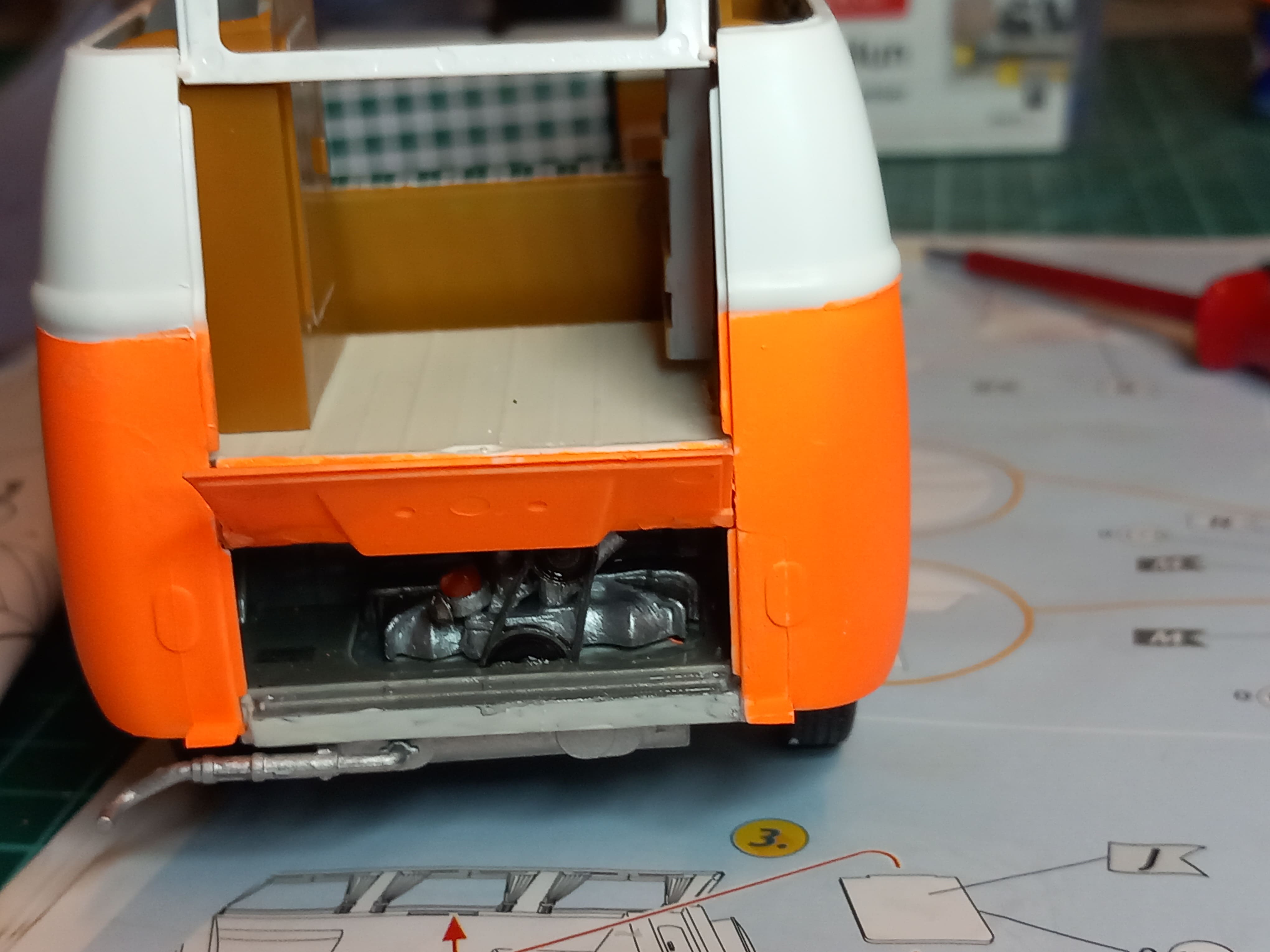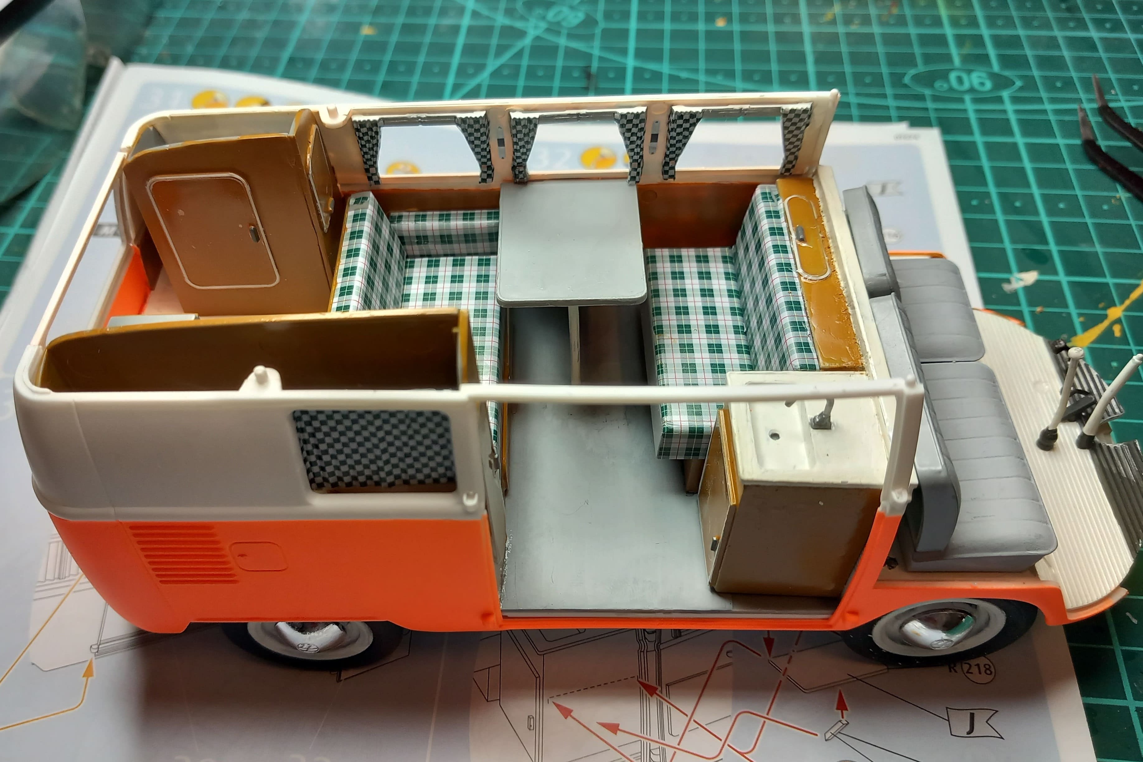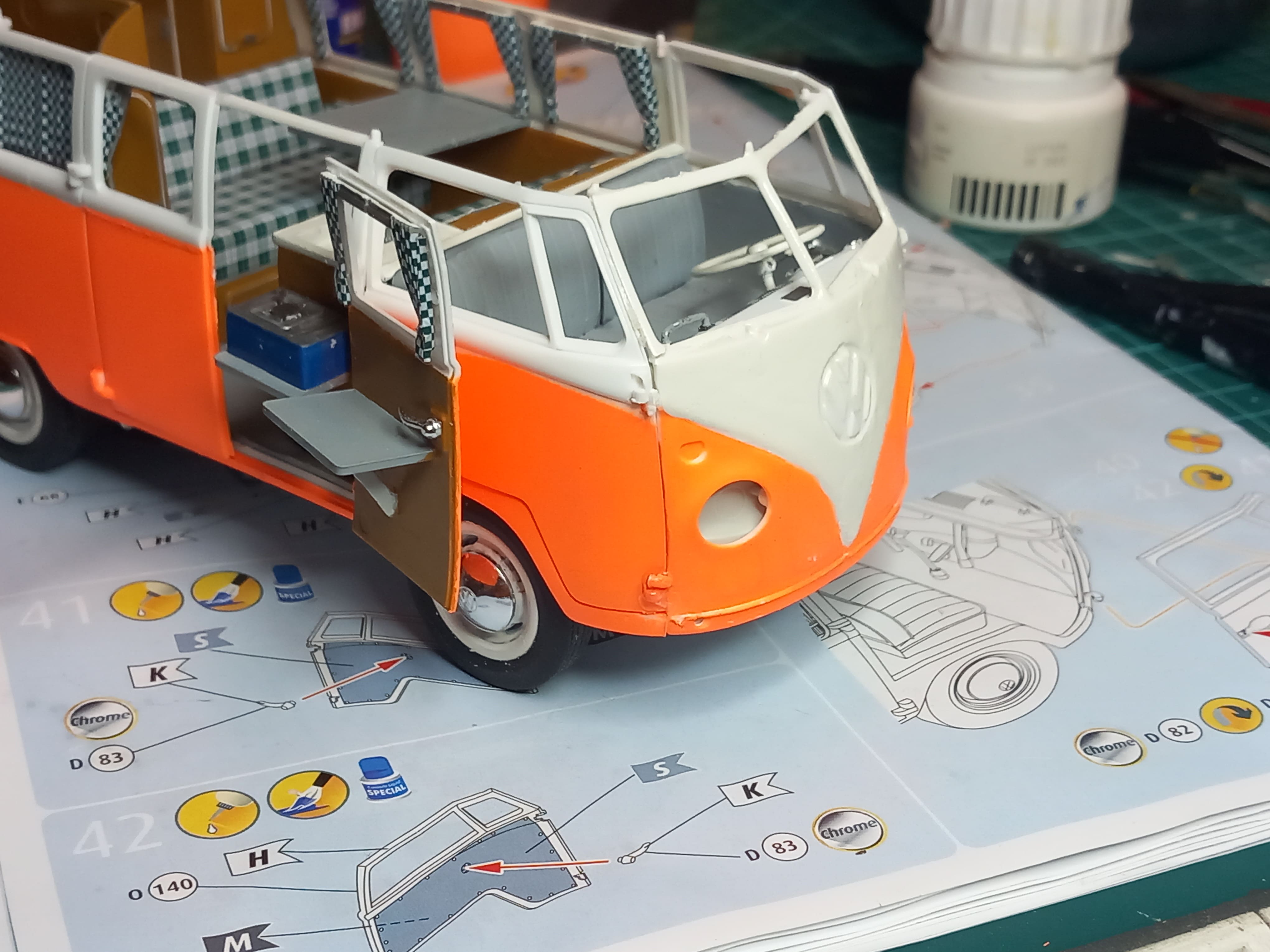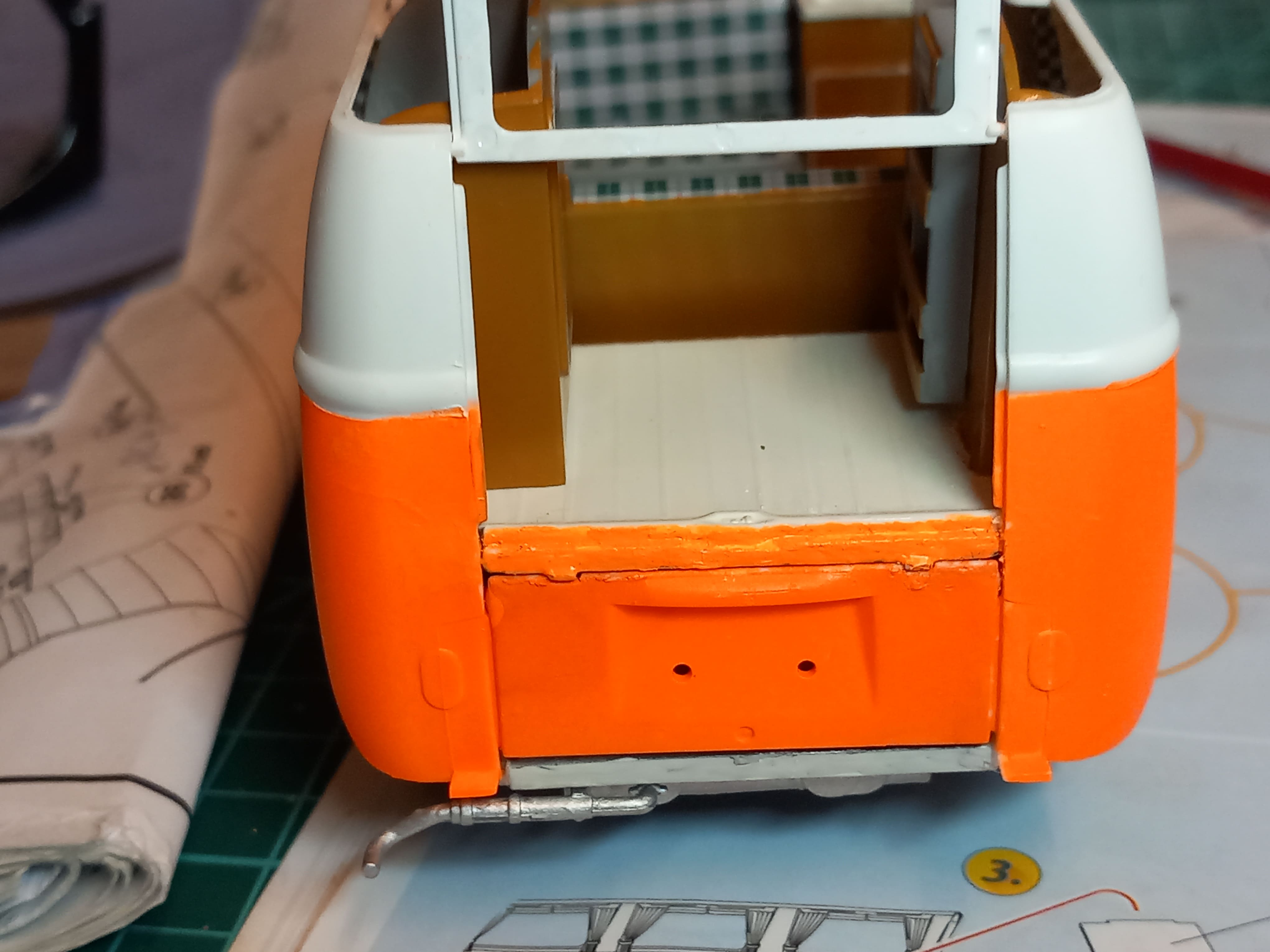 Auch die rechte Seite vom Camper ist vorbereitet. Das Aufsetzen der beiden Seiten auf das Chassis ist alles andere als einfach weil gleichzeitig die Heckklappe und die Motorklappe eingesetzt werden sollen. Beim ersten Versuch knickte ein Pin an der Motorklappe ab. Mühselig mit doppelter Lupenbrille und Spezialkleber repariert und dann 4-5 Versuche, tiefem Durchatmen und einer Menge Glück, ehe die Pins der Klappen in die dafür vorgesehenen Öffnungen eingeführt waren. Alles kurz davor daß da noch mehr abbricht. Gut, es hat geklappt, aber eine dritte Hand (zusätzliche Person) die die Klappen dahin führt, wo sie hinsollen, wäre absolut von Vorteil.Die beiden Seitenteile vom Bulli passen aber astrein auf das Unterteil.