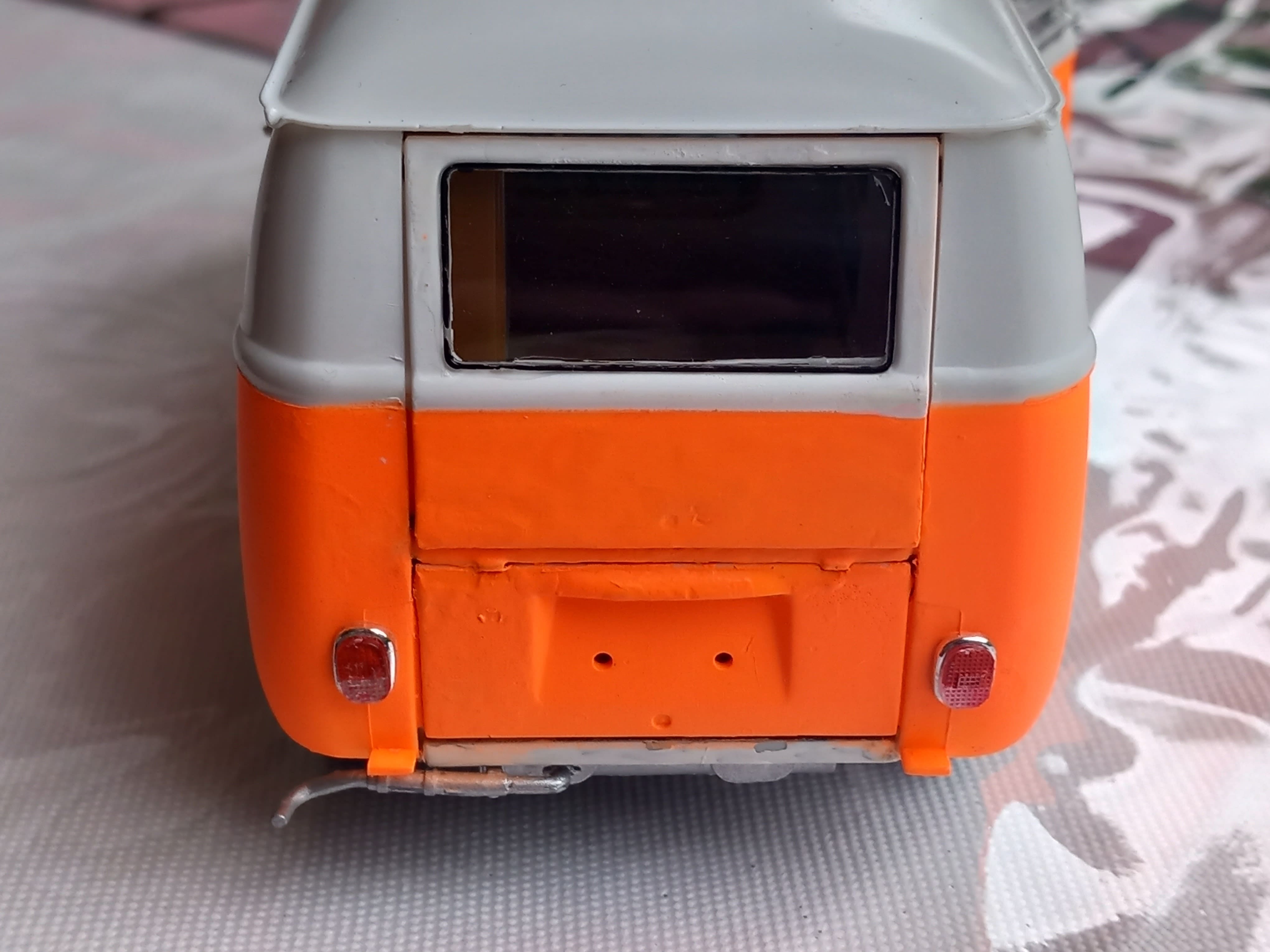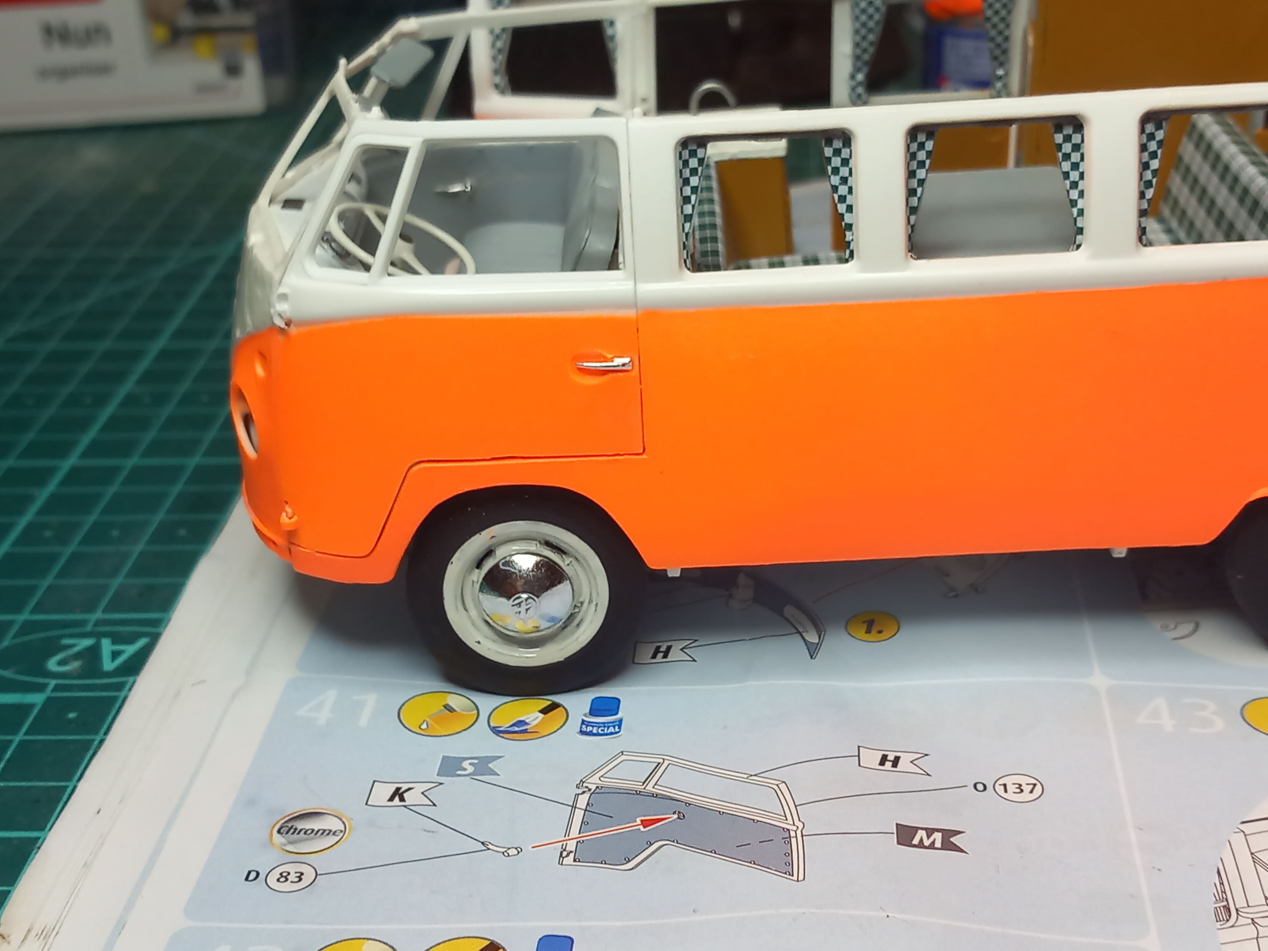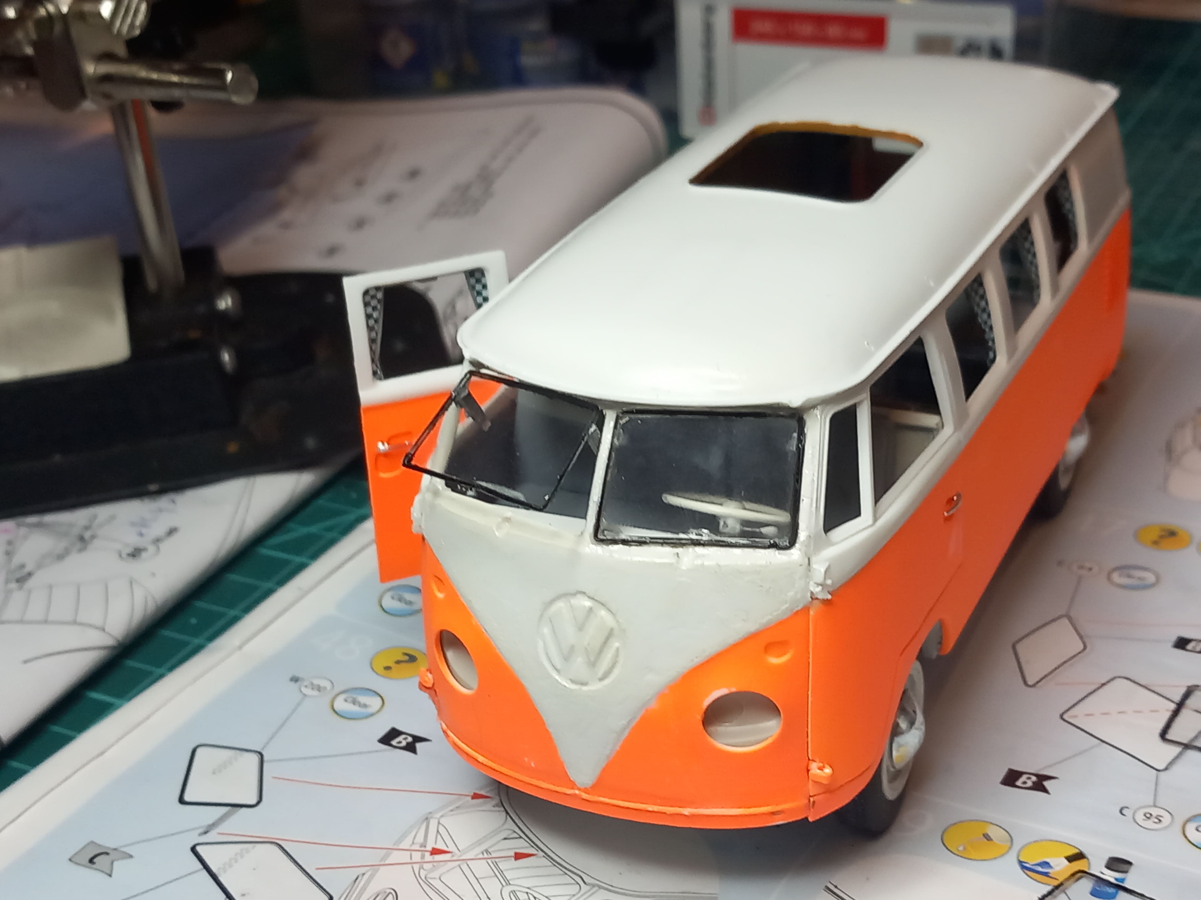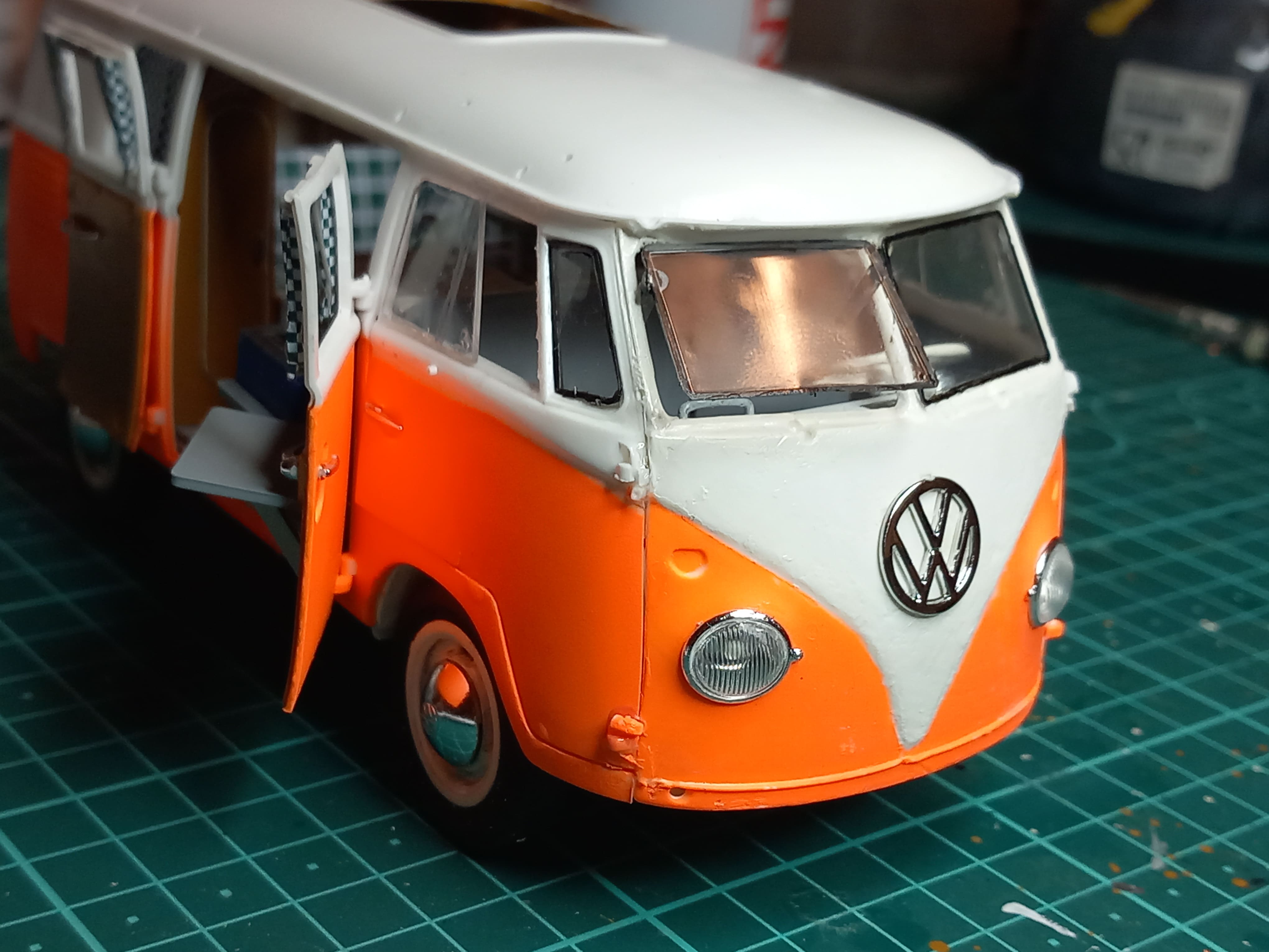 Auch die rechte Seite vom Camper ist vorbereitet. Das Aufsetzen der beiden Seiten auf das Chassis ist alles andere als einfach weil gleichzeitig die Heckklappe und die Motorklappe eingesetzt werden sollen. Beim ersten Versuch knickte ein Pin an der Motorklappe ab. Mühselig mit doppelter Lupenbrille und Spezialkleber repariert und dann 4-5 Versuche, tiefem Durchatmen und einer Menge Glück, ehe die Pins der Klappen in die dafür vorgesehenen Öffnungen eingeführt waren. Alles kurz davor daß da noch mehr abbricht. Gut, es hat geklappt, aber eine dritte Hand (zusätzliche Person) die die Klappen dahin führt, wo sie hinsollen, wäre absolut von Vorteil.Die beiden Seitenteile vom Bulli passen aber astrein auf das Unterteil.