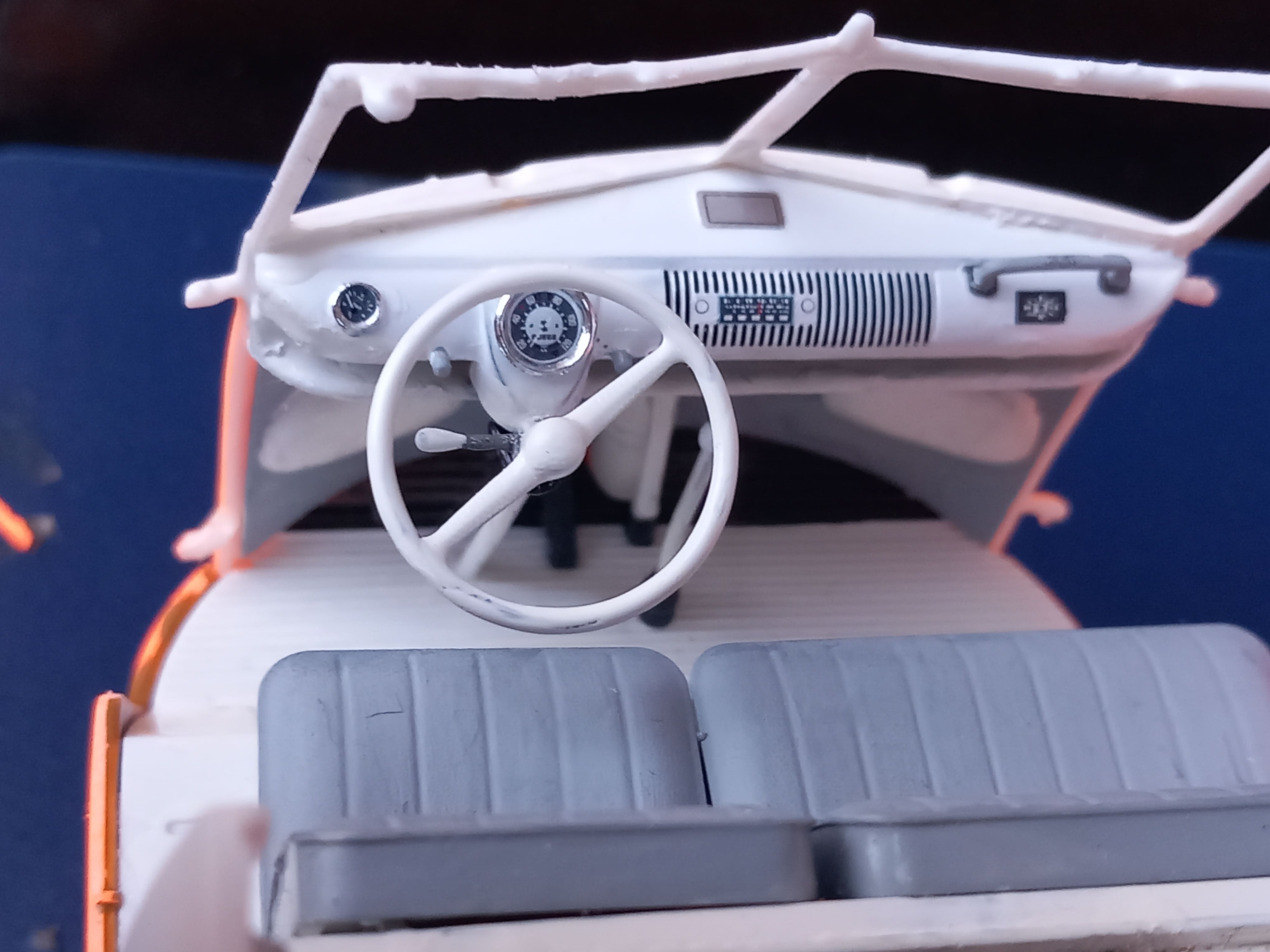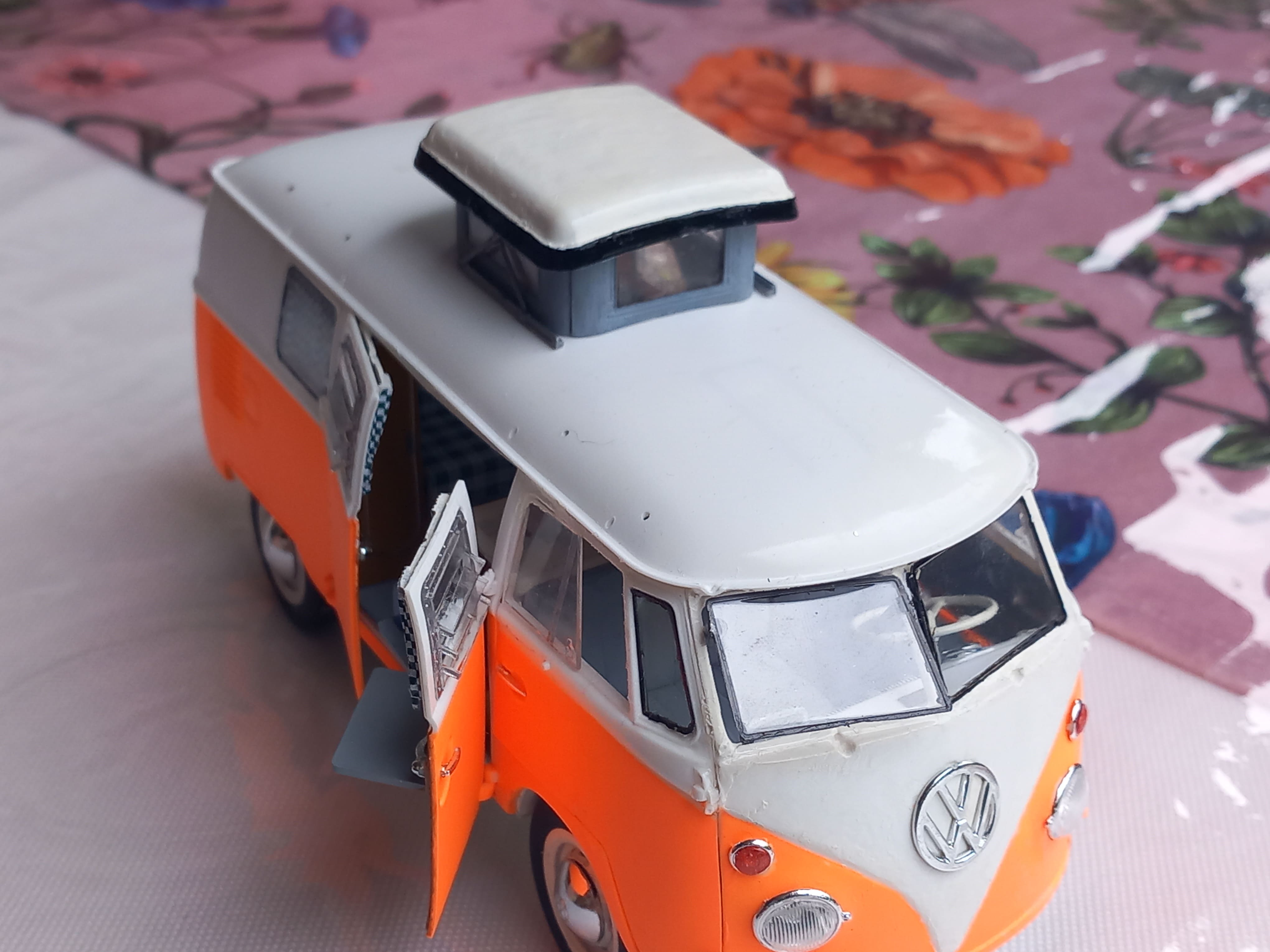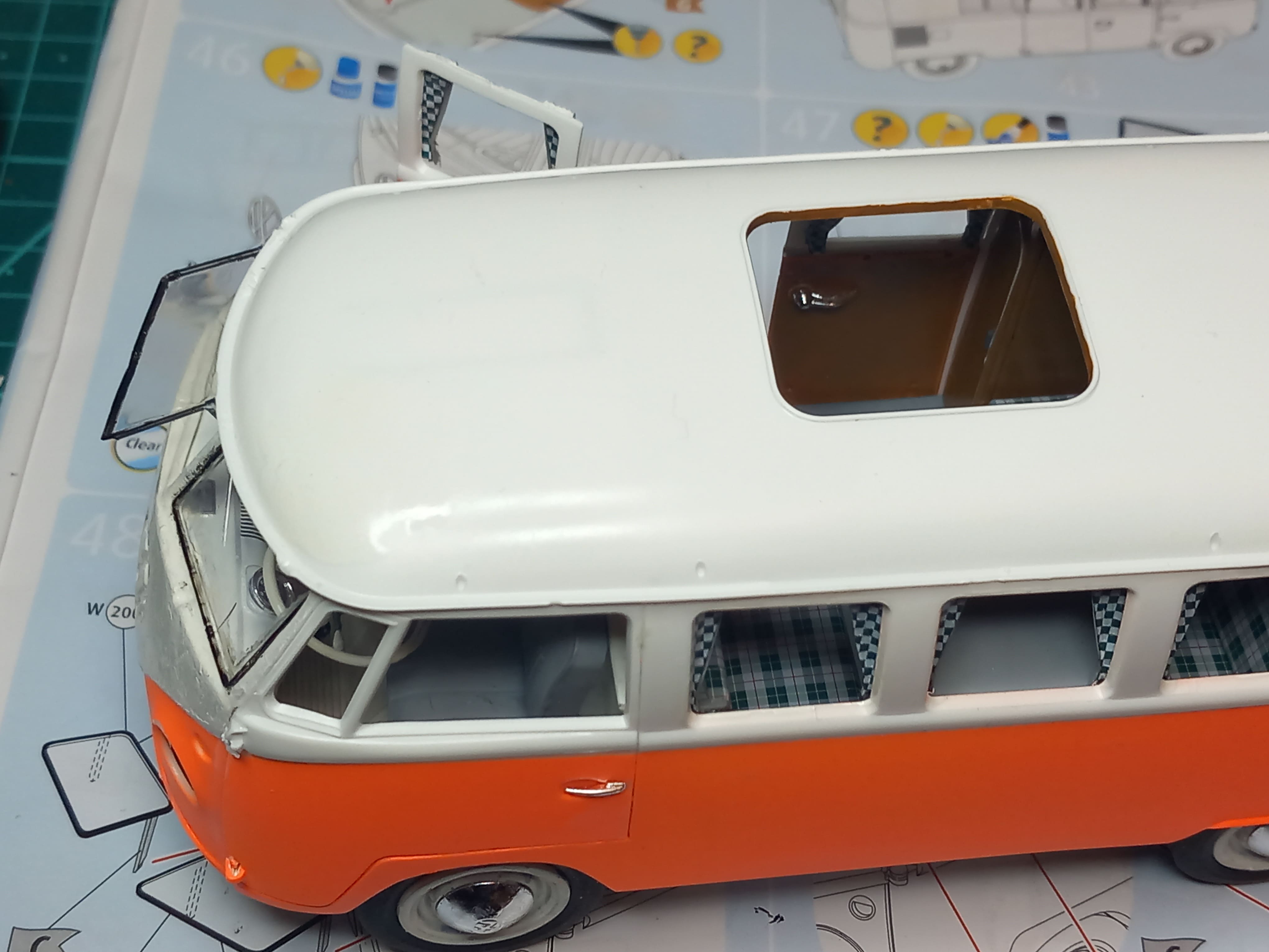 Das Dach ist drauf. Passte alles 100 %ig. Ich brauchte nichts abschleifen. Auch die Frontfenster sind angebracht. Das Beifahrerfenster lasse ich aufgeklappt. Bei diesen Bullis war das Öffnen der Frontscheiben wohl noch möglich. Gruß Ingo