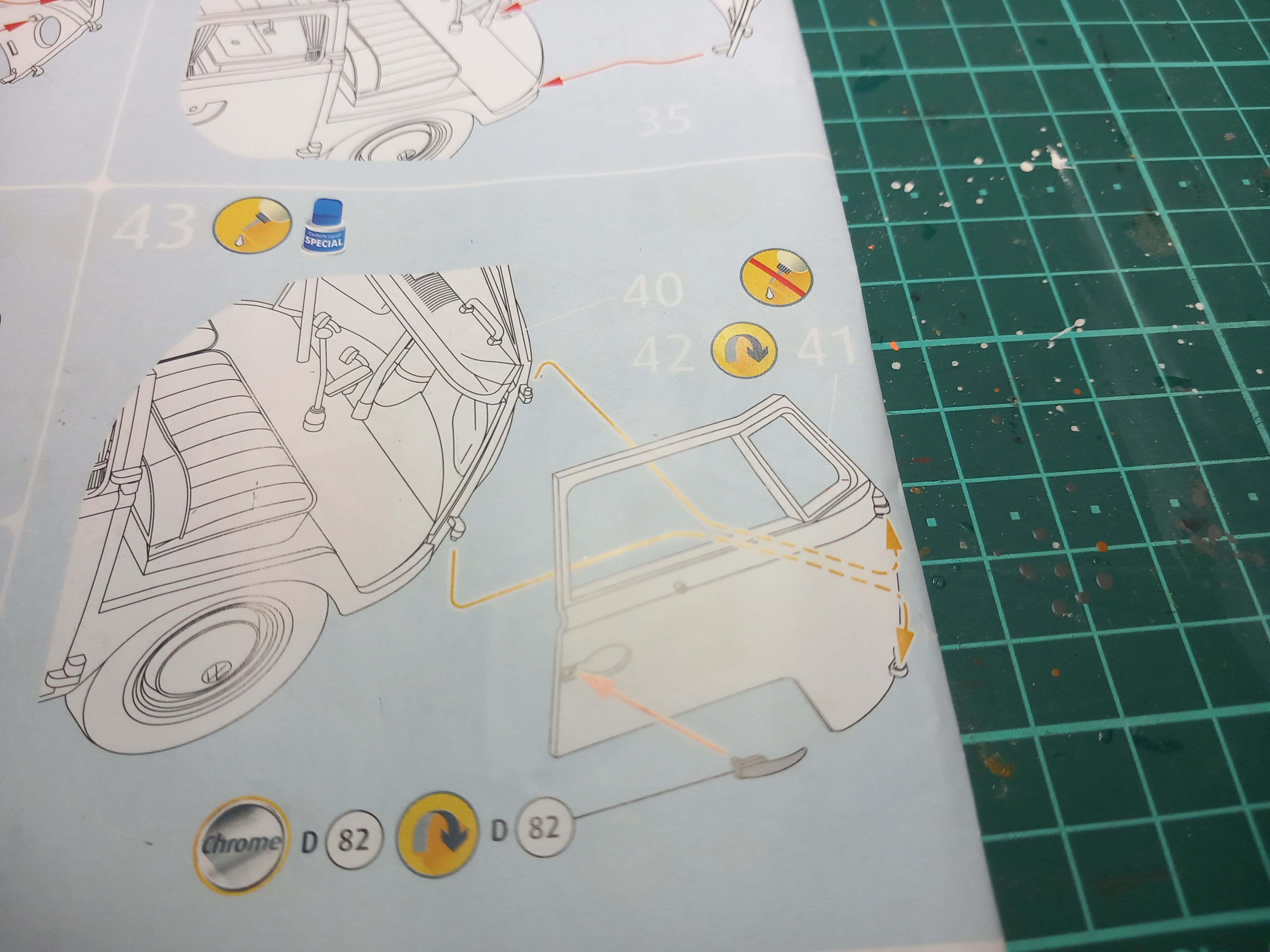 Trotz Lupenbrille und Pinzette sind mir bei beiden Türen die Pins abgebrochen, die in die Aussparung der Türen greifen sollen. (Vielleicht bin ich zu ungeschickt dazu). Jedenfalls habe ich beide Türen fest eingeklebt. Die Beifahrertür kann ich eeh nicht offen darstellen und bei der Fahrertür ist es auch nicht sooo schlimm.