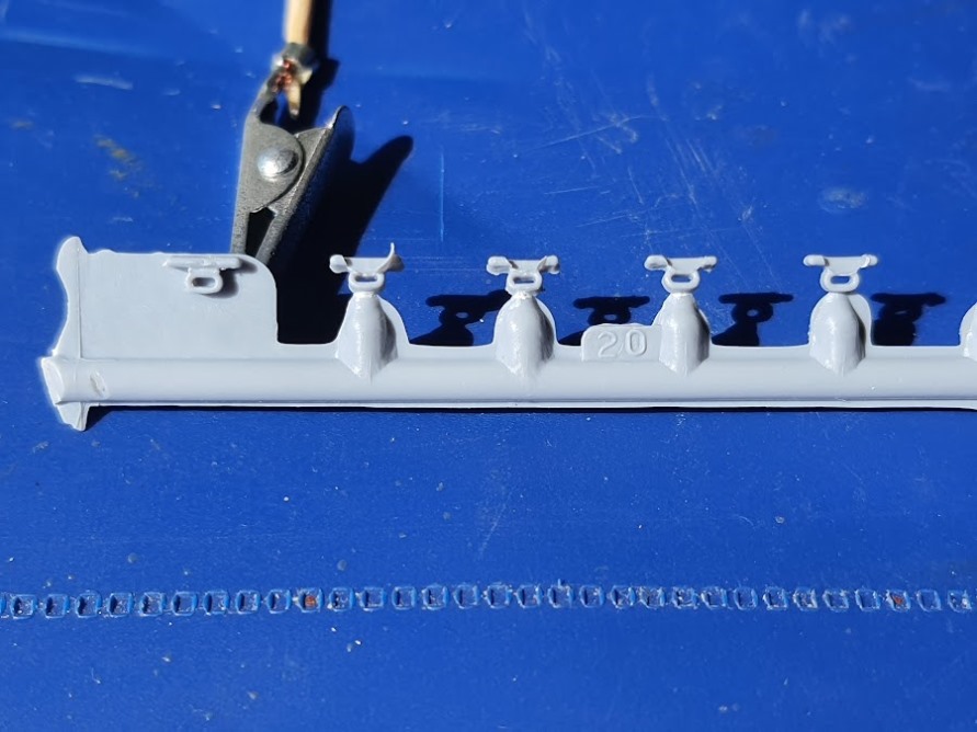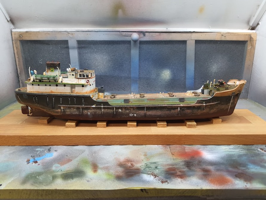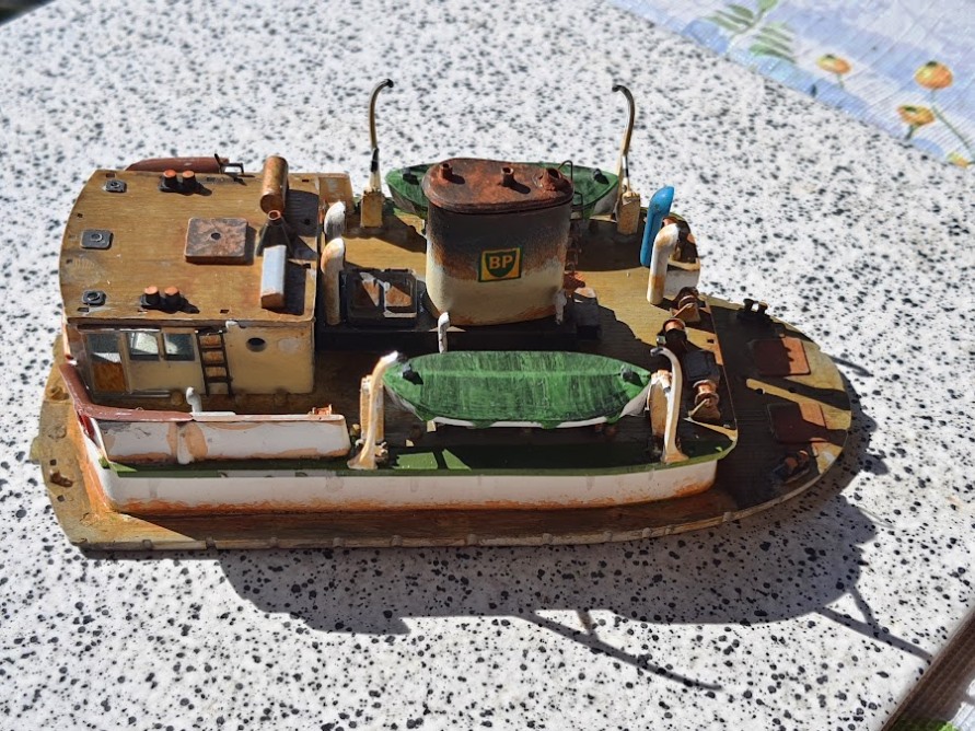 Die aufgedruckten Leitern, links und rechts, wurden Abgeschliffen und durch „richtige“ Leitern ersetzt. Der Trinkwassertank wurde, stahlfarben, lackiert bekam einen leichten Rostauftrag und konnte montiert werden.