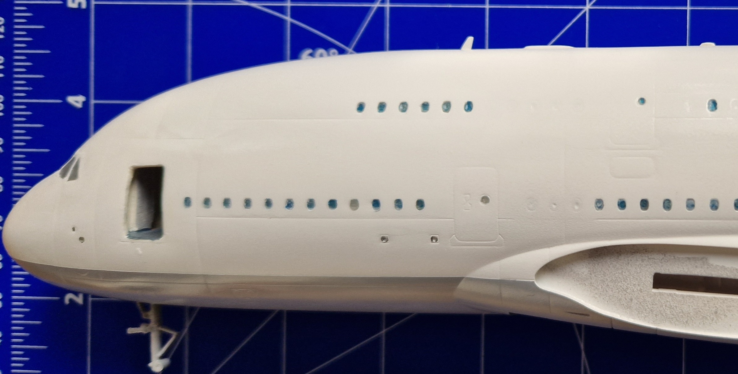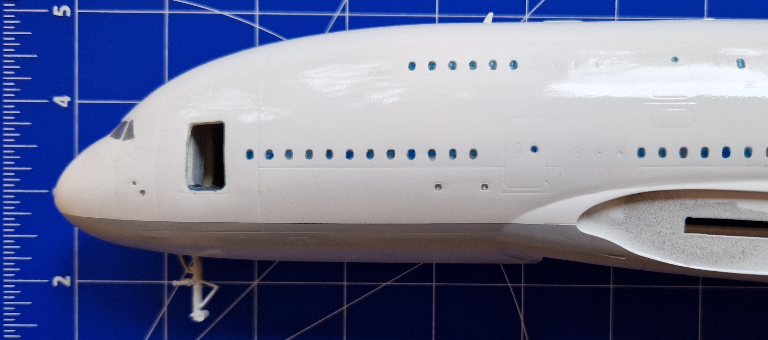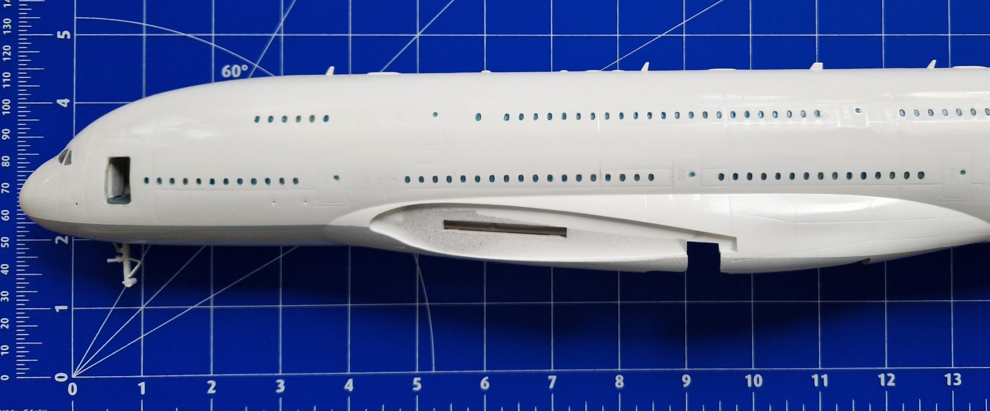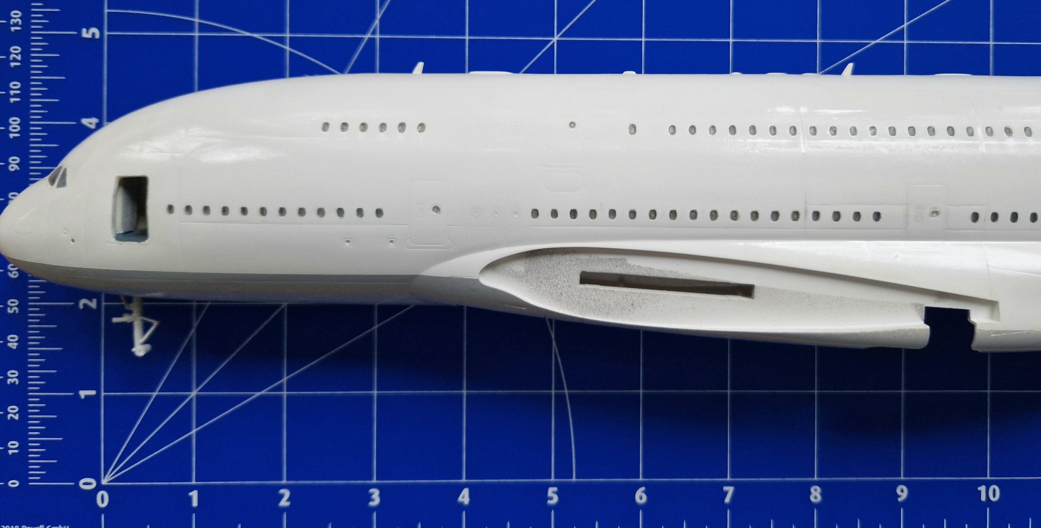 Ich entschied mich dafür die Rumpfunterseite grau zu lackieren. Das Fahrwerk ist momentan noch nicht eingebaut. Es fehlen noch sehr viele Details aber auch größere Bauteile.