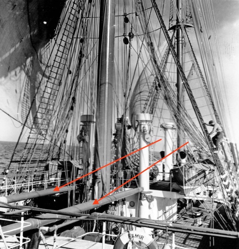 Ich möchte dich darauf hinweisen, dass die Ladebäume abgelegt und festgezurrt gefahren wurden, was bei der ständigen Bewegung eines Seglers auch verständlich ist. Ein loser Baum, das weiss jeder Segler, ist eine sehr gefährliche Angelegenheit!