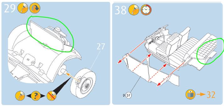 Am Polizeikäfer ging es wenig weiter. Die Innenausstattung ist soweit fertig. Entgegen der Bauanleitung habe ich den Telefonhörer braun bemalt anstatt schwarz. Nach der Montage sehe ich jetzt, sieht man ihn bei fertigem Modell wahrscheinlich eh nicht mehr :( So kann ich überlegen, ob ich den Hörer nicht seitlich befestige, wo das Radio seinen Platz hätte. Bei der Version 2+4 ist das so - jedoch nicht mit dem Zusatzgerät unten am Armaturenbrett sondern mit einem Decal als Handschuhfacheinsatz. Nachdem ich mich eh kaum an die Anleitung halte, werde ich das vermutlich noch ändern.