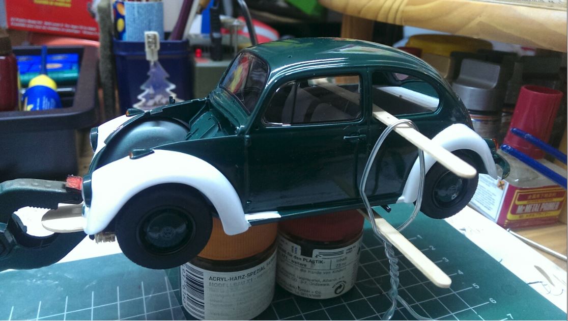 Die Decals an der Karosserie habe ich dran gemacht. Eigentlich bekäme der Käfer nur auf dem Kofferraumdeckel (vorne :D) einen Schriftzug. Seitlich habe ich noch kein Wappen vorgesehen. Ich habe nun hinten auch einen Schriftzug drauf gemacht. Sieht cool aus :ugeek: