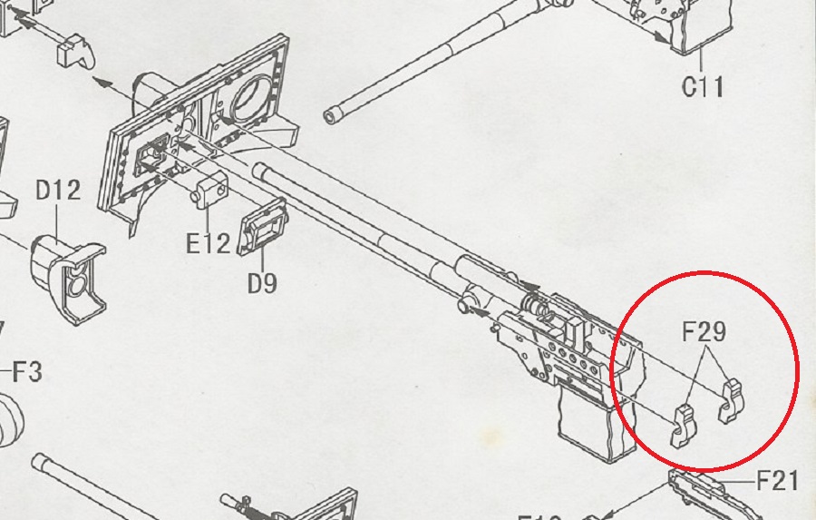 Hier mußte ich das erste Mal etwas ändern. Das dünnerer Teil vorn am Zielfernrohr war zu kurz und passte nicht bis in die Blende.