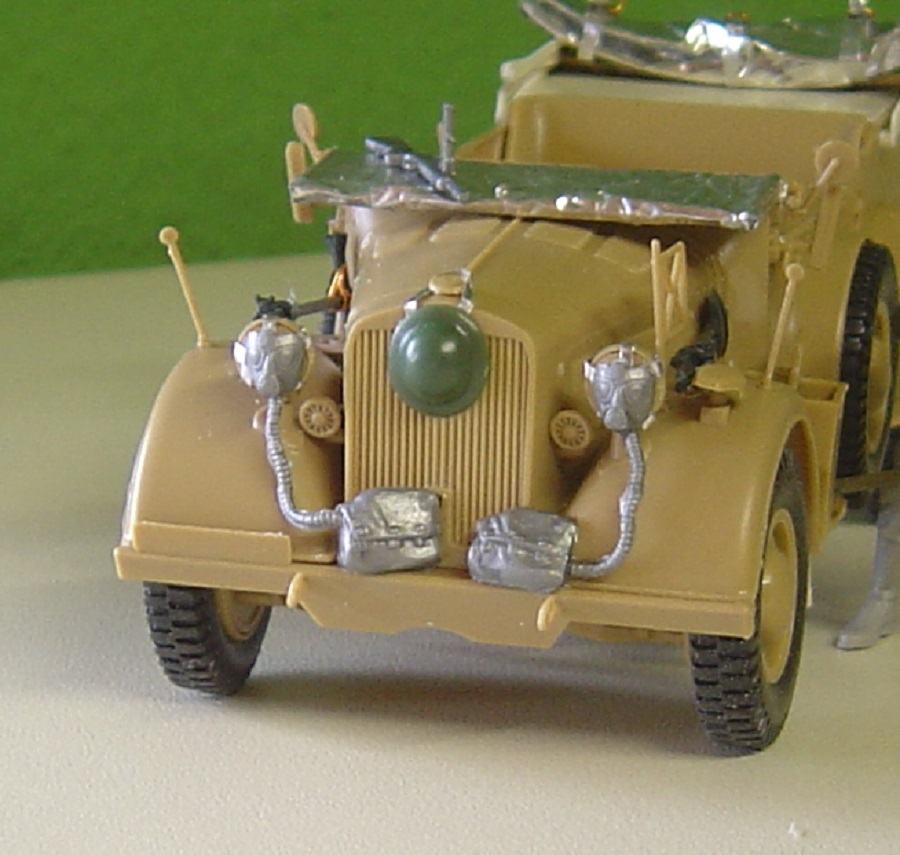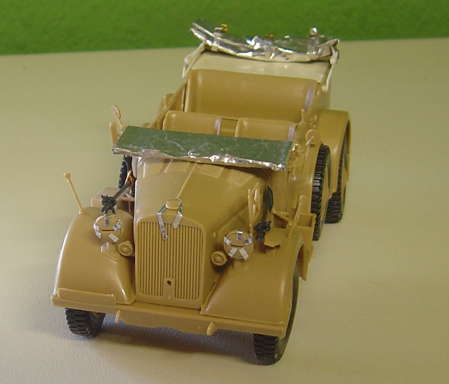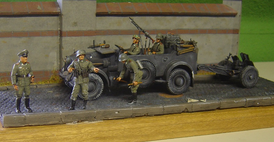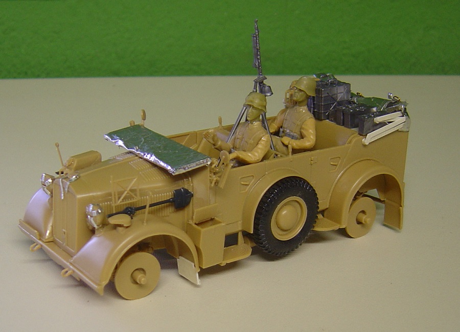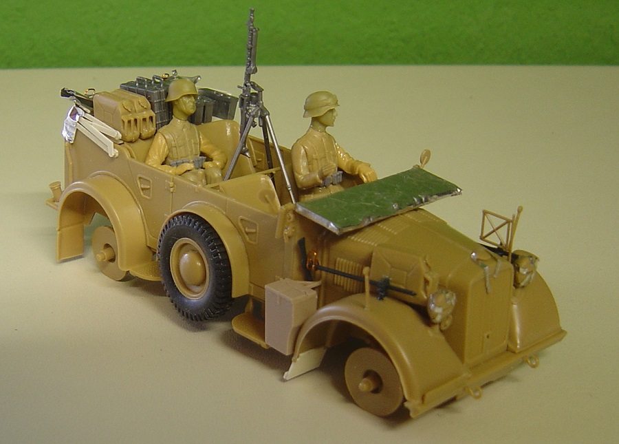 Benzinkanister vom Horch Bausatz. MG 34 mit Trommelmagazin auf Fliegerdreibein, zwei Handgranatenkisten , Trommelmagazinträger mit zwei Trommelmagazinen, und drei MG-Munitionskisten.. Ein Beifahrer vom Opel Blitz mit anderen Armen und Verlinden-Kopf gibts auch noch.