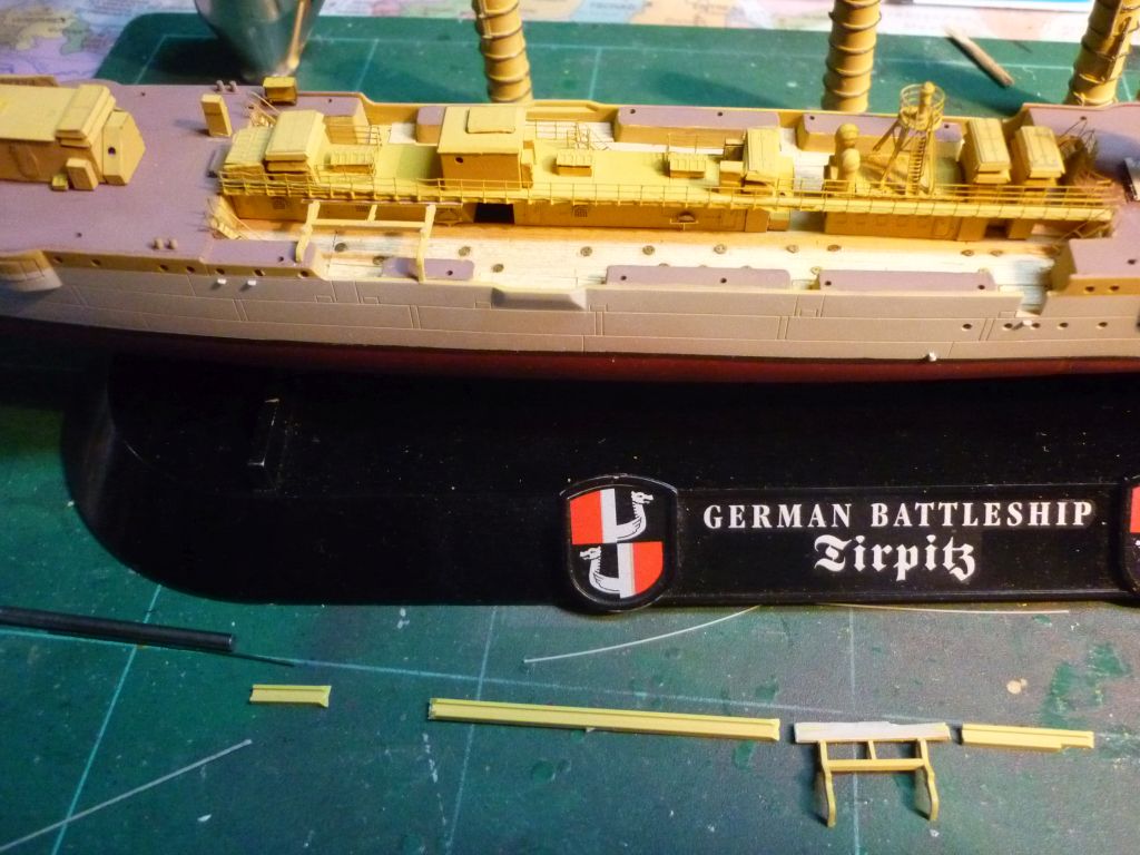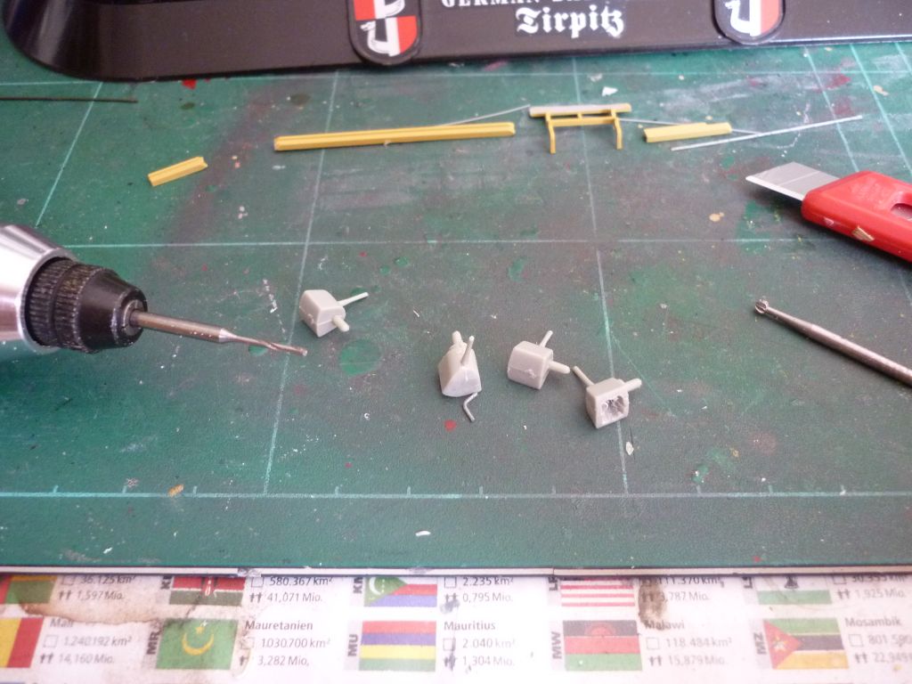 So weiter gehts, nun gilt es die Plastikteile (Revell) mit den Metallteilen (Eduard) zu verbinden, hier die z.B Tragegestelle der Rettungsboote . Weiterhin beginne ich die Geschütze zu bauen und zu verbessern.[attachment=2]P1030049k.jpg