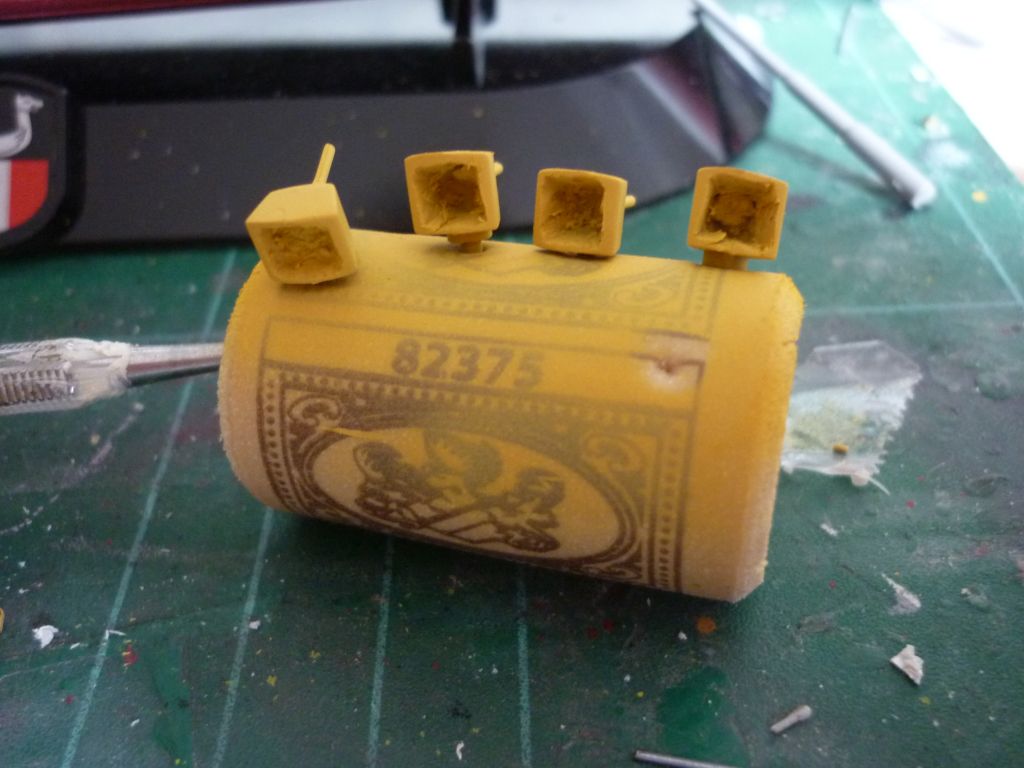 mit tief gezogenen Gußast befestigt.Weiterhin wurden die Geschütze aufgefräst und lackiert.Ich werde versuchen die Verschlüsse