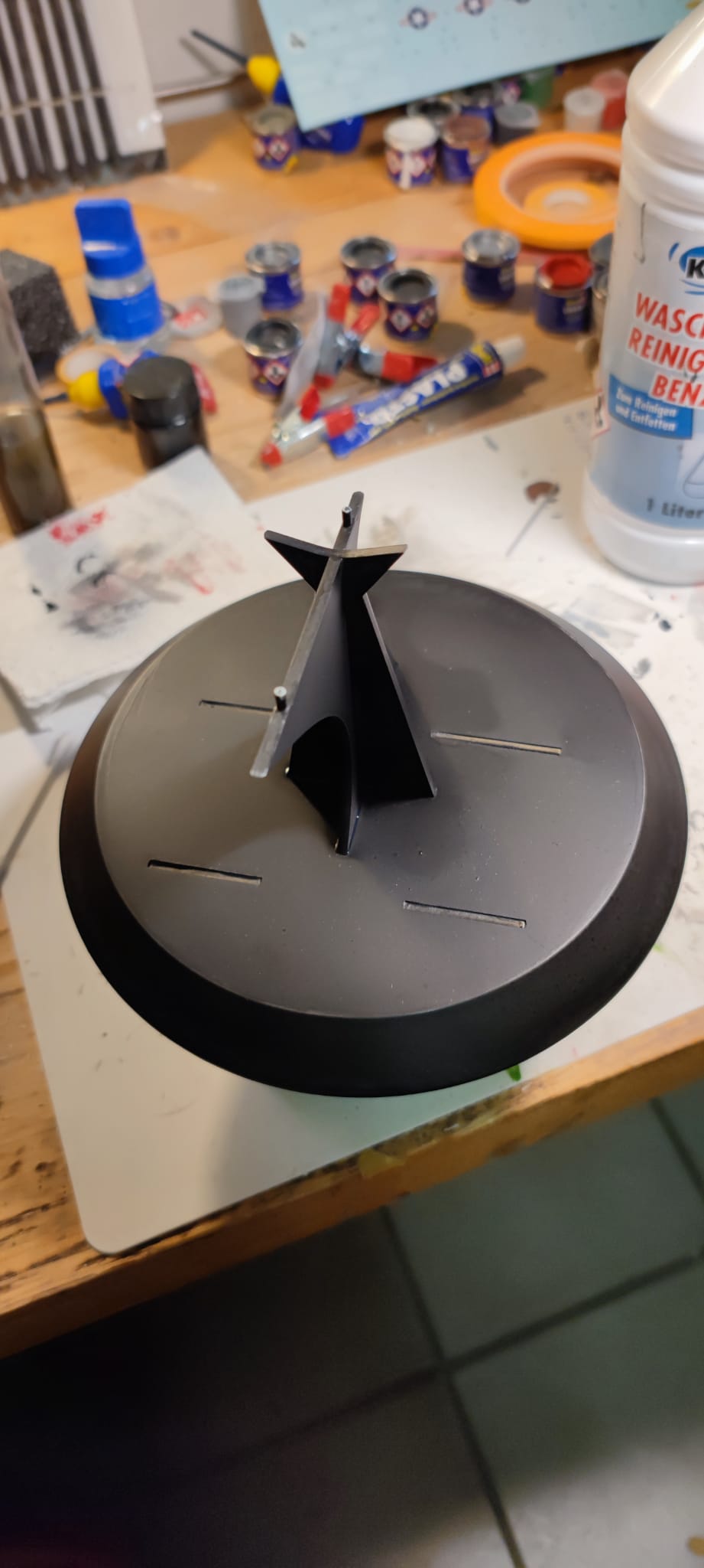 Nachdem ich heute viel Zeit mit schleifen verbracht habe ( gut, dass mir vorher niemand gesagt hat, wie langweilig das ist 😂😂😂😂😂), habe ich den Ständer schon mal grundiert…. Dreimal, weil die airbrush gezickt hat. Na ja, das Ergebnis ist ganz ok geworden…. Nur mein Waschbenzinverbrauch ist jetzt recht hoch.