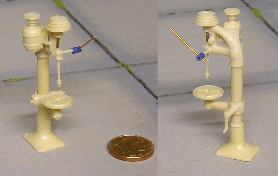 Es geht weiter mit der Standbohrmaschine. Die Welle zwischen der Keilriemenscheibe und dem Bohrwelle war nicht im Bausatz erhalten. Aus 0,5 mm Draht ersetzt. Der Handgriff ( mit dem blauen Teil ) hat eine Stärke von 0,3 mm mit einem Anguß von 0,5 mm.