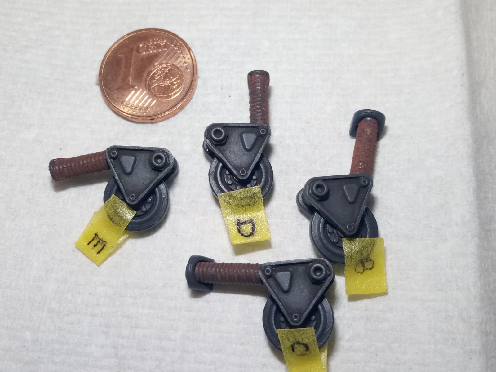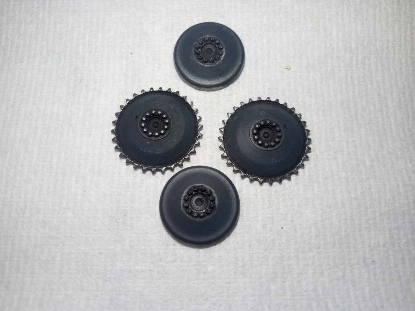 Angefangen habe ich wie immer, bei den Laufrollen (Kettenvorlauf, das grade Stück am Boden).