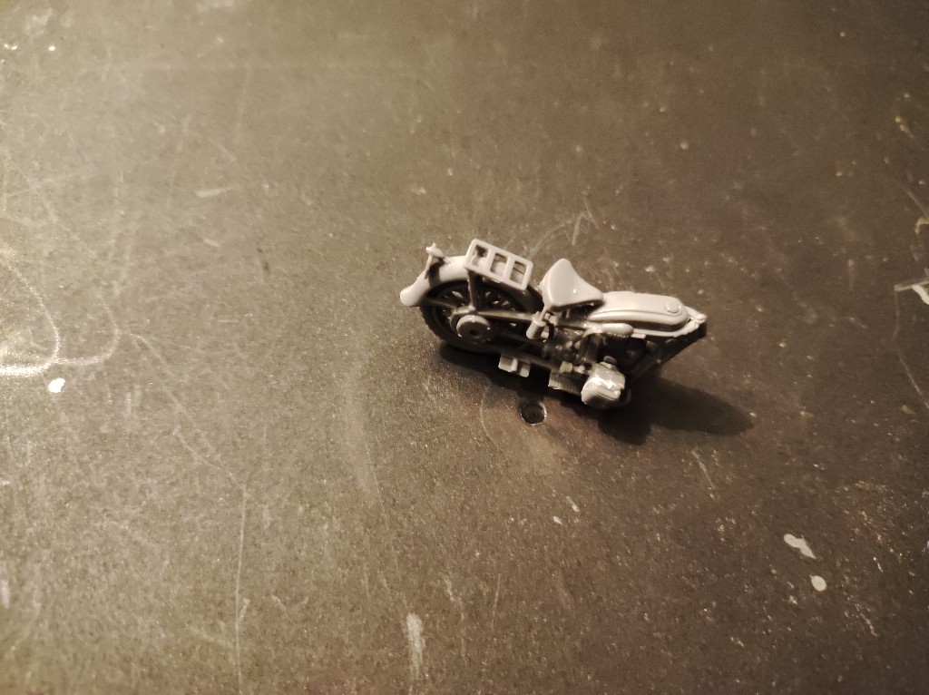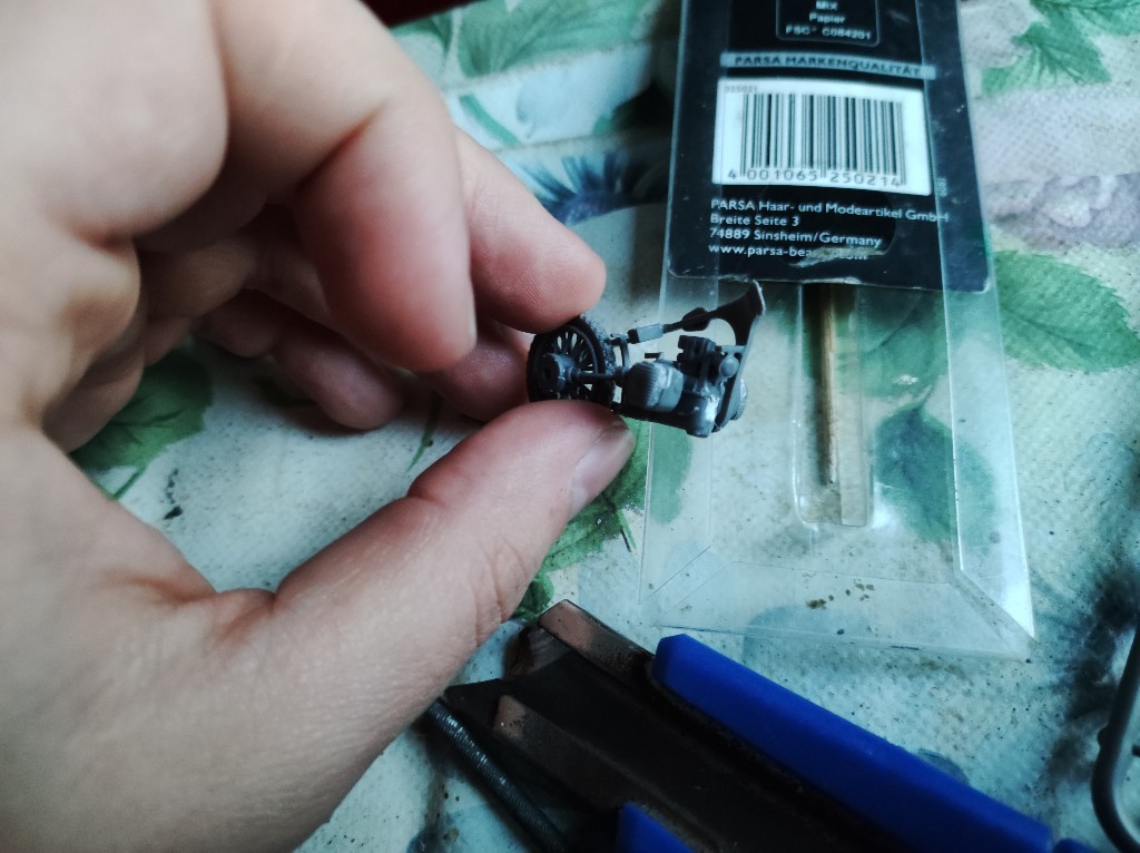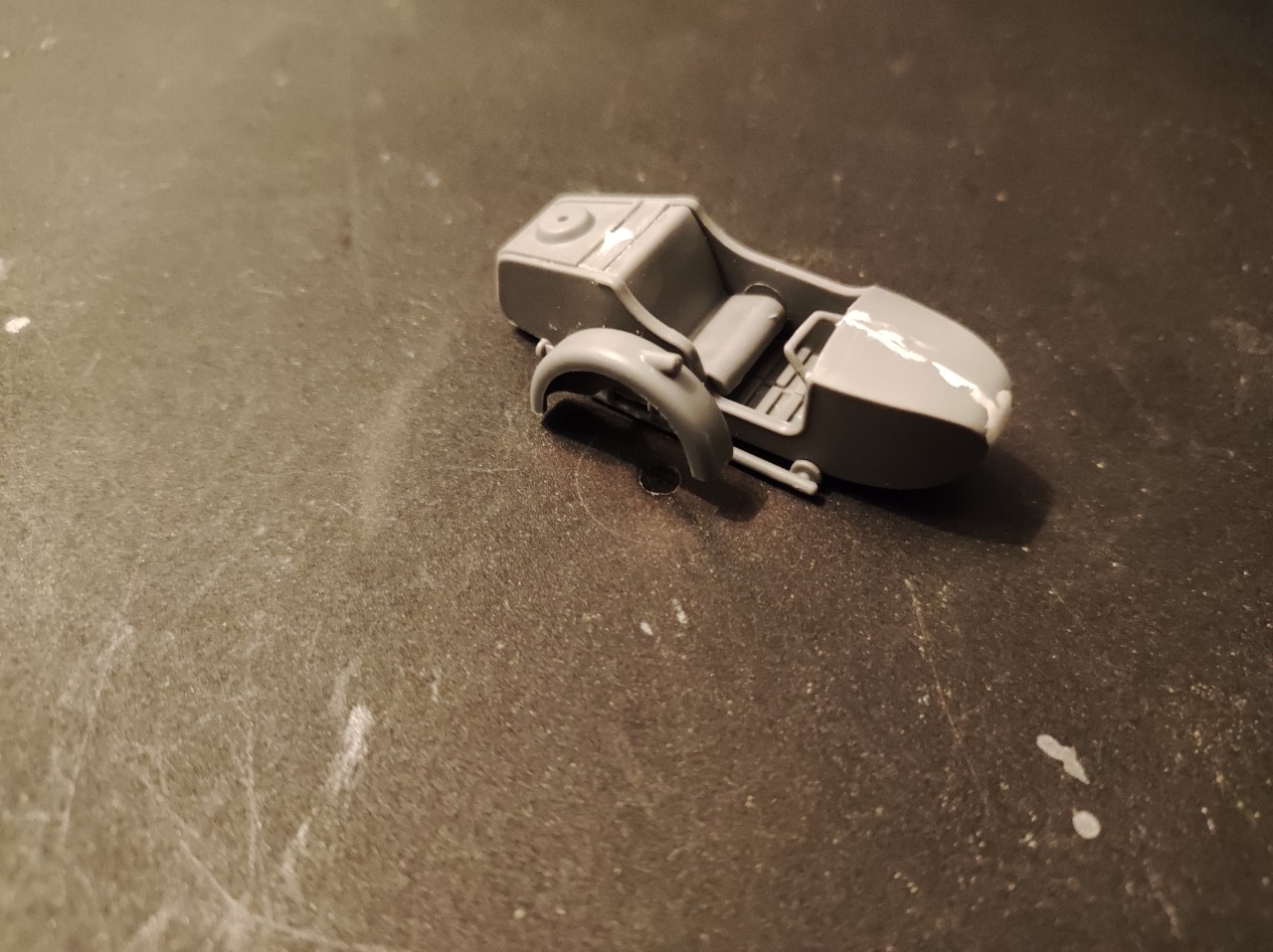 Dann kam der Radkasten an den Beiwagen, hier gibts wieder richtig kleine Teile. Bei dem Motorrad verbringe ich mehr Zeit auf dem Boden als am Basteltisch