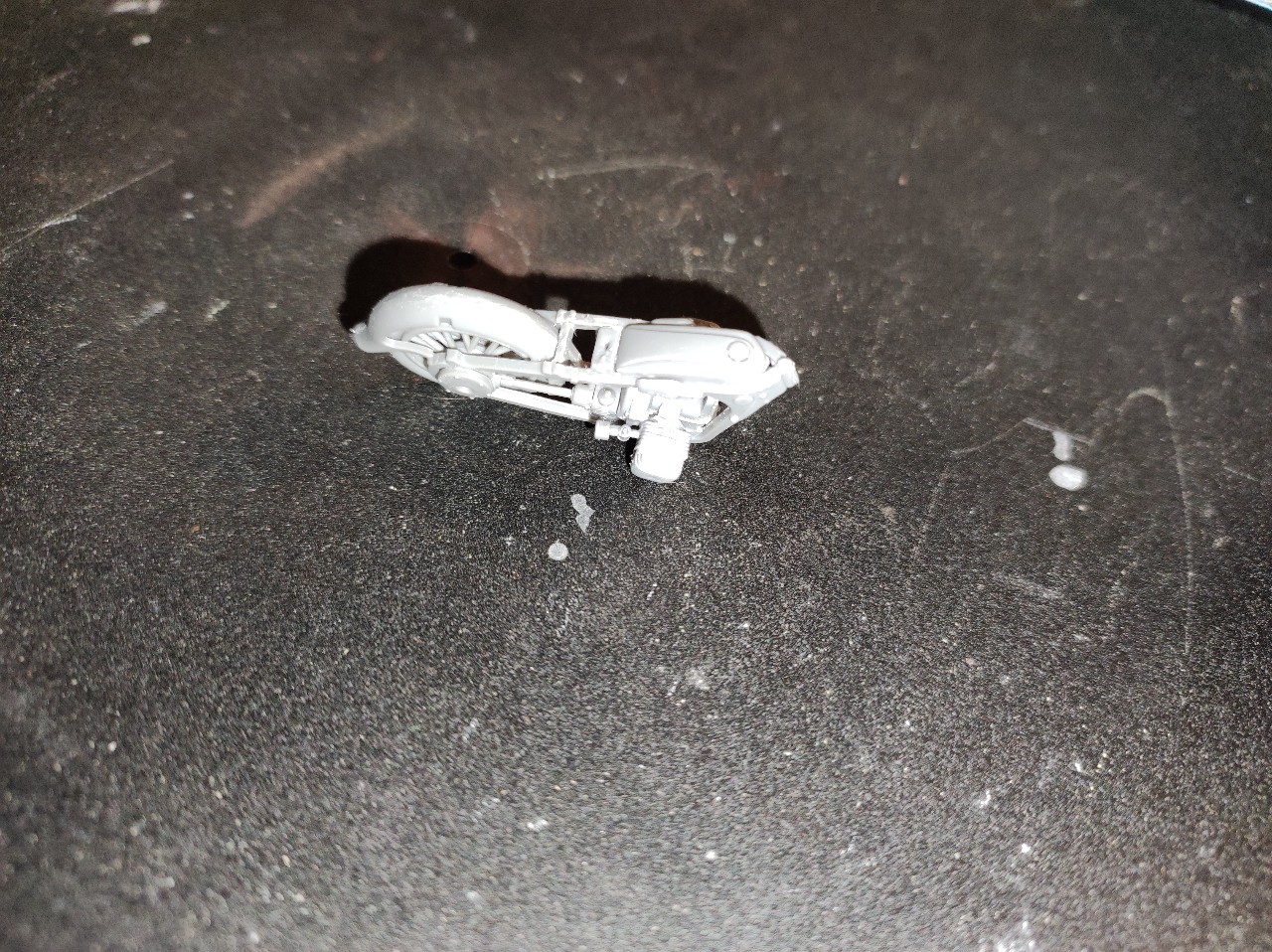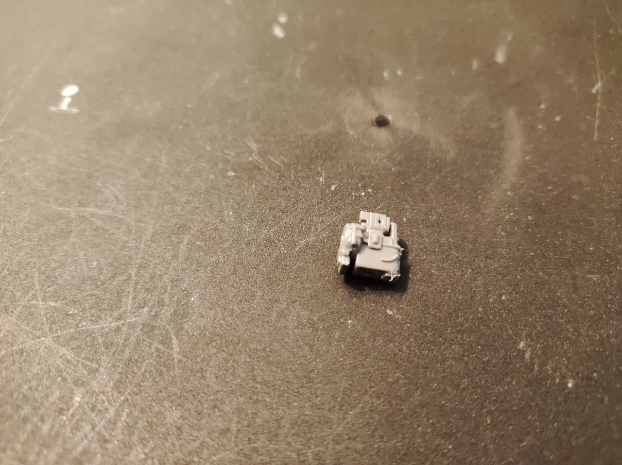 Dann der Tank, hier macht sich das Weiche Plastik erneut bemerkbar. Es reißt unschön an den Angusspunkten ein. Ab jetzt werde ich nur noch schneiden. Übrigens hier musste das Oberteil aufgesetzt werden und der Tankdecken (Durchmesser unter vielleicht gerade 1mm) extra angeklebt werden