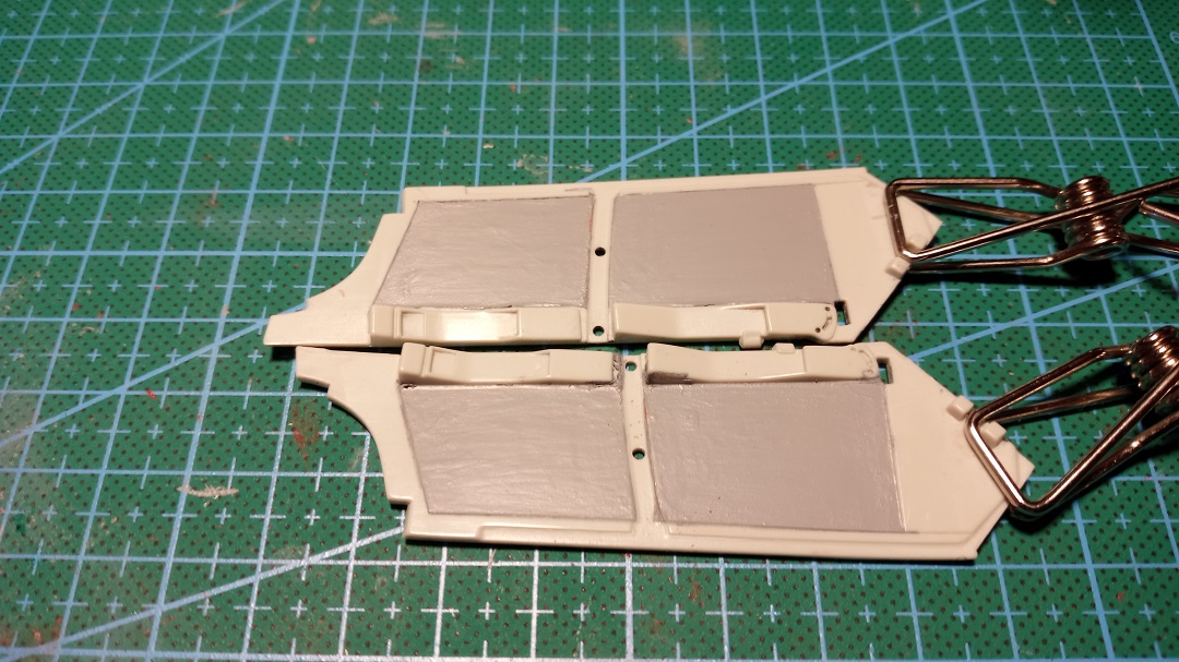 Zunächst habe ich eine dritte Farbschicht von grau 374 auf die Türinnenverkleidungen aufgetragen und über Nach trocknen lassen. Heute morgen dann die Maskiertapes entfernt. Das ist das Ergebnis: