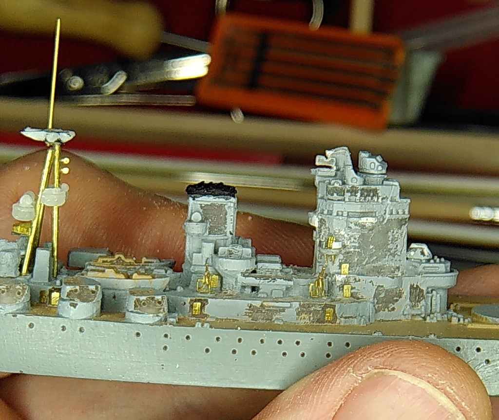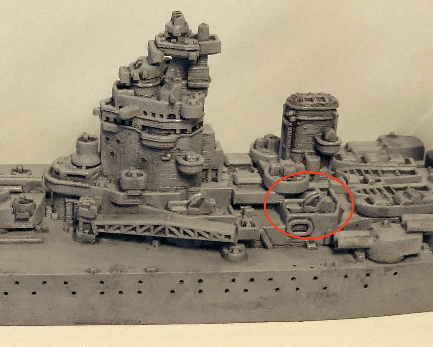 Folgende Änderungen (nicht abschliessend) stehen für die 1941er Version an: Verfeinern der schweren Artillerie (1), Verfeinern der mittleren Artillerie (2), Ersetzen des Flugzeugkrans (3), Entfernen der meisten leichten AA (4), Verfeinern der 4er PomPom-Geschütze (5), Verfeinern der 8er PomPom-Geschütze (6), Neubau der schweren AA (7), Neubau des vorderen (8) und hinteren Mastes & Antenne (9), Rückbau der Anbauten am Kommandoturm (10) - die Ende 1941 angebauten U-Boot-Ausgucke lasse ich aber dran, weil das Wegkratzen an der Struktur wohl zu grossen Schaden anrichten würde, Verfeinern des Schornsteins (11), Anpassung der Reling (12), Ersetzen der Treppenaufgänge (13), Ersetzen der Charley floats (14), Entfernen der 8er PomPom-Geschütze auf dem Achterdeck und ersetzen durch Entfernungsmesser (15), Verfeinern externer Strukturen (16), Verfeinern der Beioote (17), ...