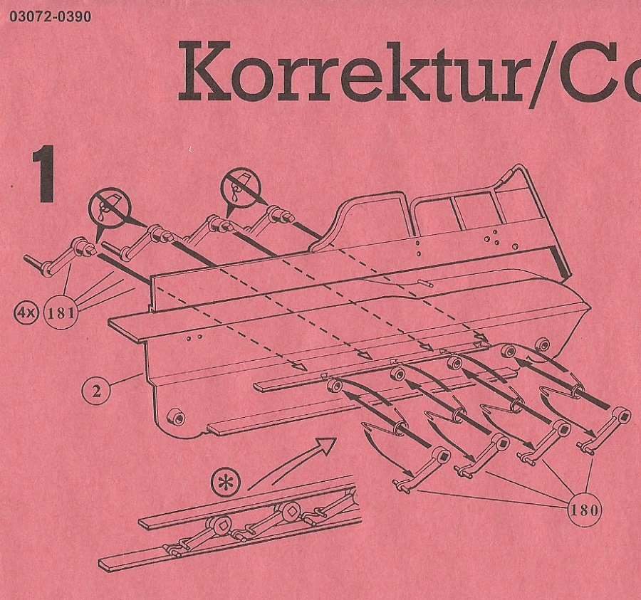 Beim Bauen des " Motorraums" muß man zuerst die Schwingarme mit Feder ( im Original mit Torsionsstäben ) einbauen. Leider ist da Revell im Bauplan ein kleine Fehler entstanden. Aber es wurde ein Rotes Korrekturblatt beigelegt.