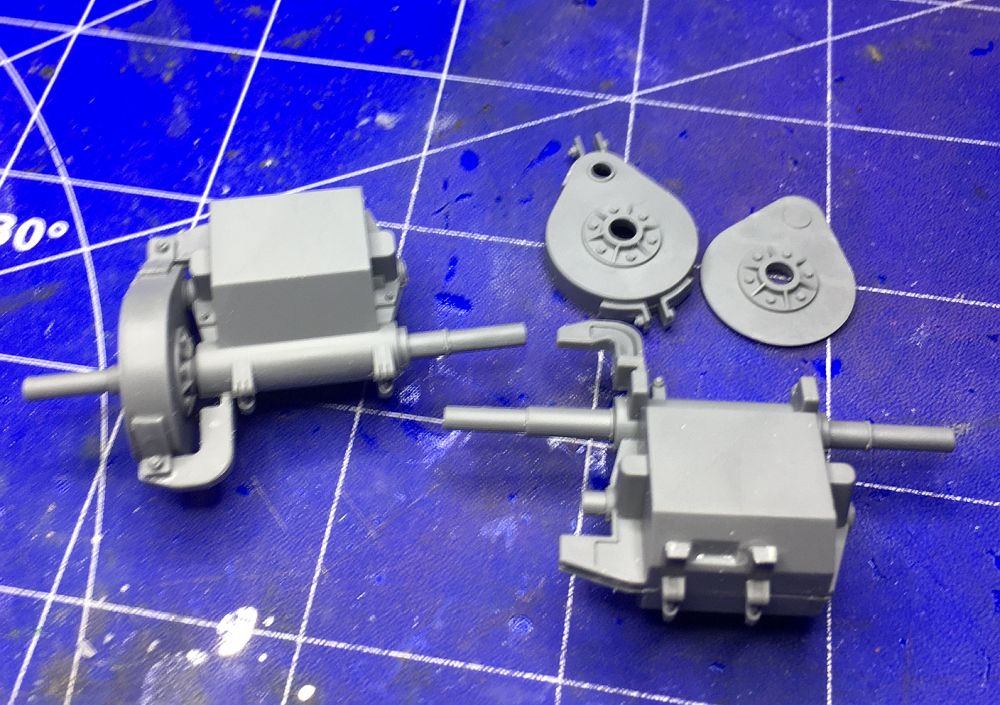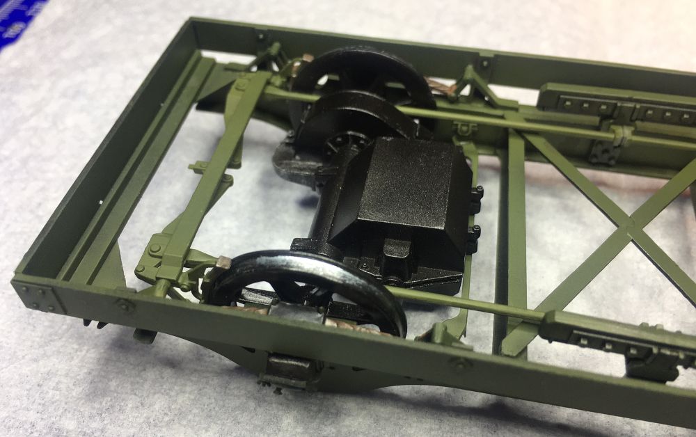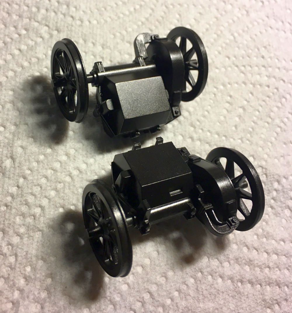 Die beiden Antriebe mit den Achsen und Rädern habe ich in Metal Black von Gunze gesprüht.