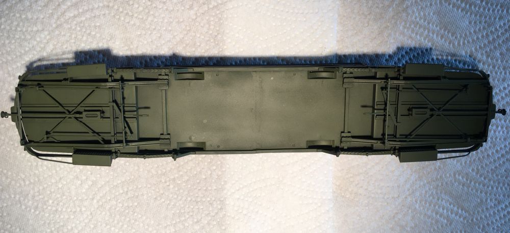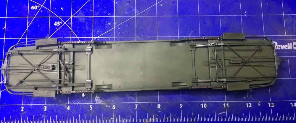 Den Fahrgestellrahmen habe ich fast fertig. Da er in der Farbe des Unterbodens lackiert werden soll, habe ich die beiden Teile noch nicht verklebt. Die Antriebseinheiten abzukleben ist mir zuviel Aufwand, so dass ich die Teile separat lackieren möchte und dann später zusammenfüge. Die Kontaktstellen habe ich teileweise abgeklebt, werde aber noch mit Maskierflüssigkeit arbeiten.