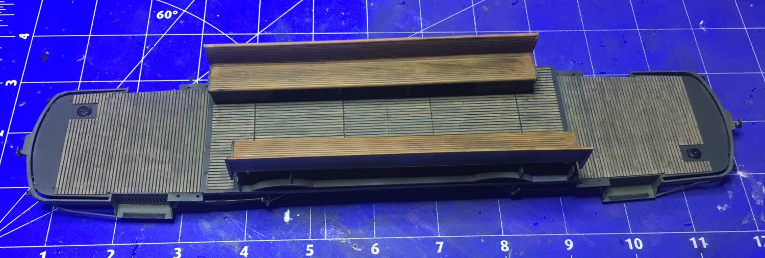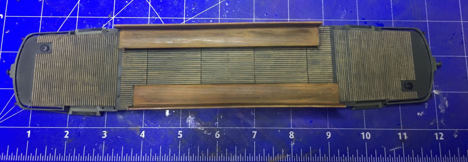 Die Sitzbänke wurden dann an ihre Positionen geklebt und der Unterboden in schwarz aus der Dose grundiert.