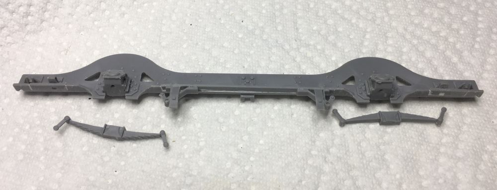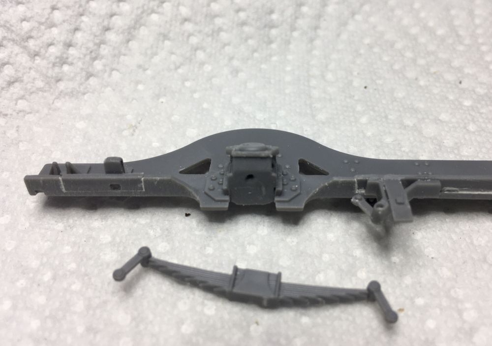 Das Seitenteil ist wiederum zweimal zu bauen und besteht wie gewohnt aus vielen Einzelteilen. Wie man anhand der Bilder erahnen kann, mussten einge Verbindungen verspachtelt werden. Mit Acylspachtel von Vallejo ging das ganz gut, da man ihn mit feuchten Wattestäbchen glatt ziehen kann. So hält sich die Schleifarbeit im Rahmen. Die Achsaufnahmen haben leider alle eine tiefe Sinkstelle. Da muss reichlich Spachtel rein. Die Blattfedern sind versäubert und warten auf den Einbau.