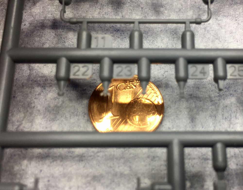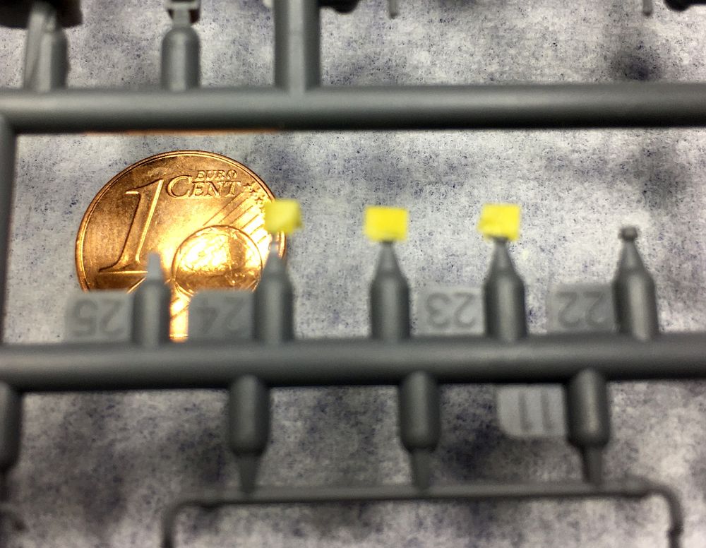 Apropo Achsaufnahmen. Diese erfreuen den Modellbauer mit einzelnen zu verklebenden Flügelmuttern. Die sind so klein, dass meine Kamera diese nicht scharf abbilden wollte. Nach etwas Grübelei habe ich Maskierbandstücke an die winzigen Dinger geklebt, damit sie beim Abtrennen nicht sofort verloren gehen.. Das hat wunderbar geklappt. Das Ankleben verlangte dann noch jeweils langes Luft anhalten mit anschließender Schnappatmung. Ob sowas wirklich sein muss, ist die Frage. Wenn es fertig ist und man eine gute Brille hat, dann sieht es allerdings klasse aus ;-) .