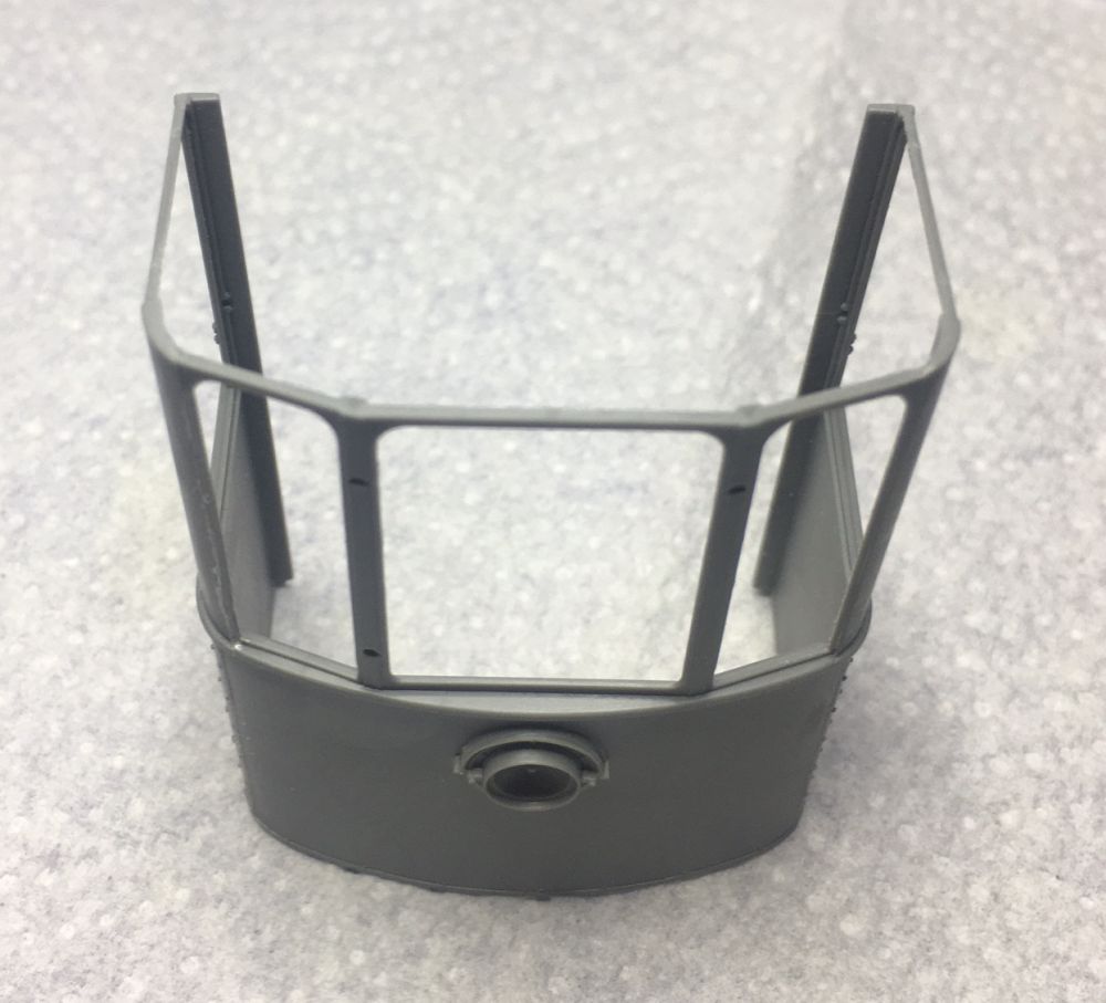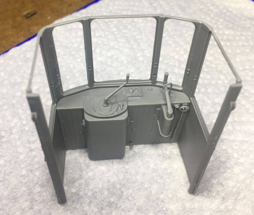 Es folgte der Zusammenbau des Kopfteils. Die 3 großen Teile fügen sich ganz gut zusammen. Ich habe etwas mit Mr. Surfacer 500 nachgebessert und muss die Verbindungen noch leicht verschleifen. Die Schaniere für die Türen setzen sich auf jeder Seite aus 5 Miniteilen zusammen. Die warten noch auf die Montage. Den Steuerstand habe ich erst mal nur zum Zeigen eingesetzt.
