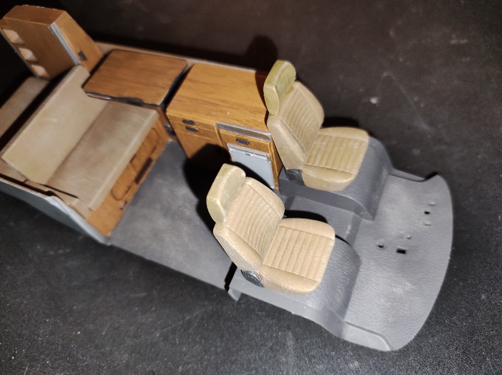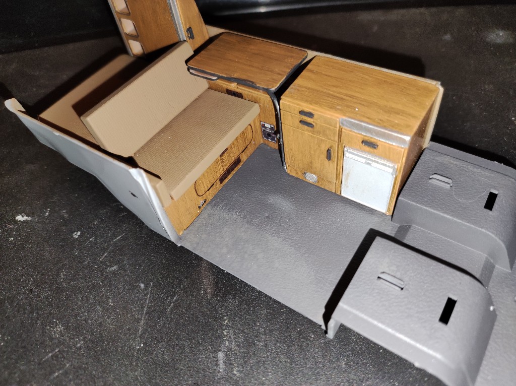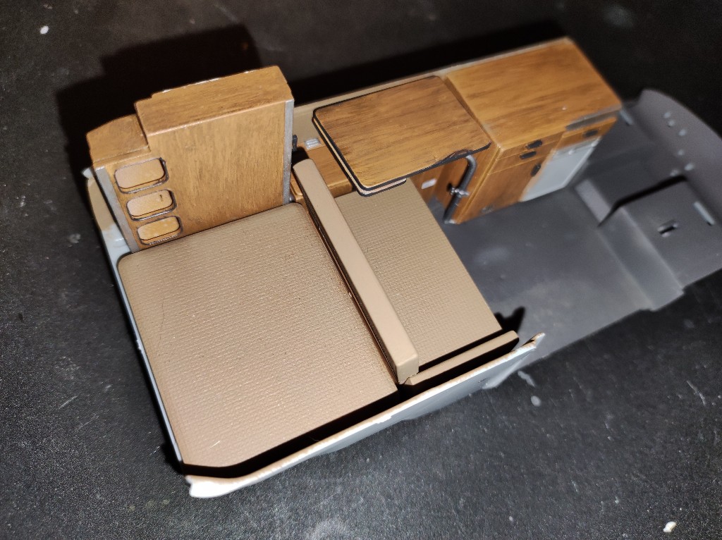 Mittlerweile kamen auch die Decals im inneren dran. Leider ist das Decal für die Betten, also das Karomuster, zerrissen beim anpassen. Deshalb habe ich diese einfach braun belassen