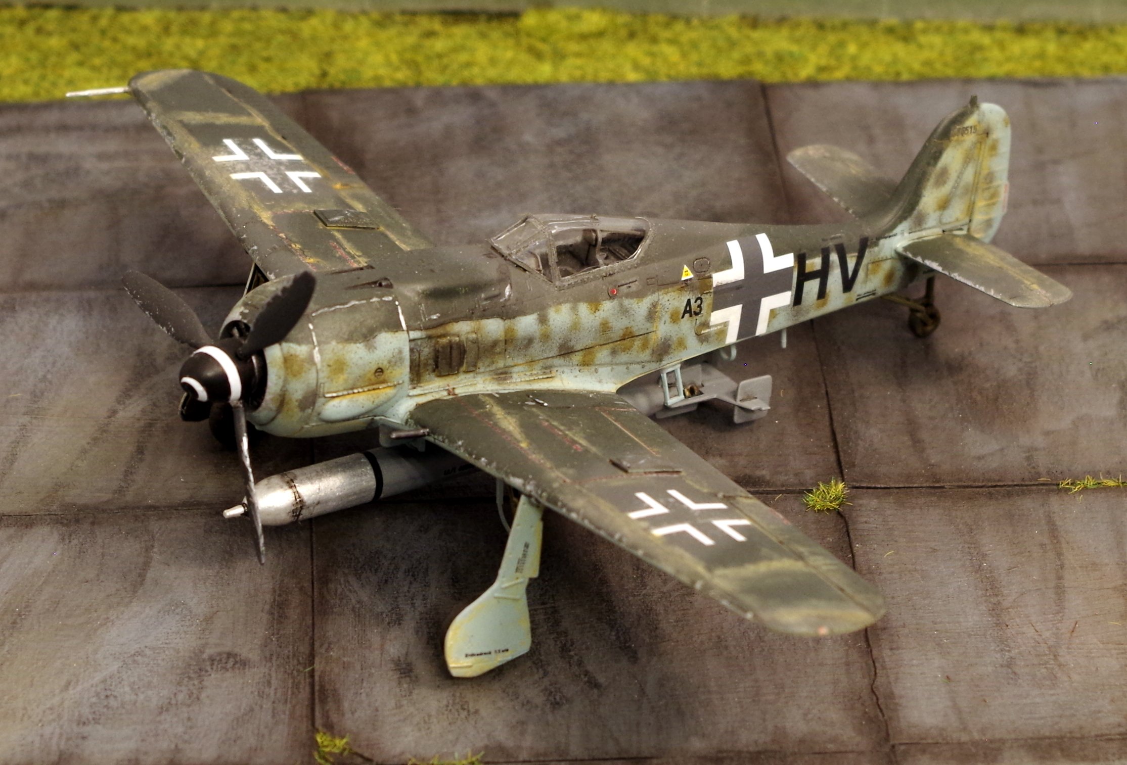 Zuerst eine Focke-Wulf Fw 190 A-8 mit der Gleitbombe BV 246 Hagelkorn. Die Gleitbombe ist zwar ein wenig fragil, sieht aber interessant aus. Die Lackierung mit der gelben Motorverkleidung und dem Seitenruder gefällt mir sehr gut.