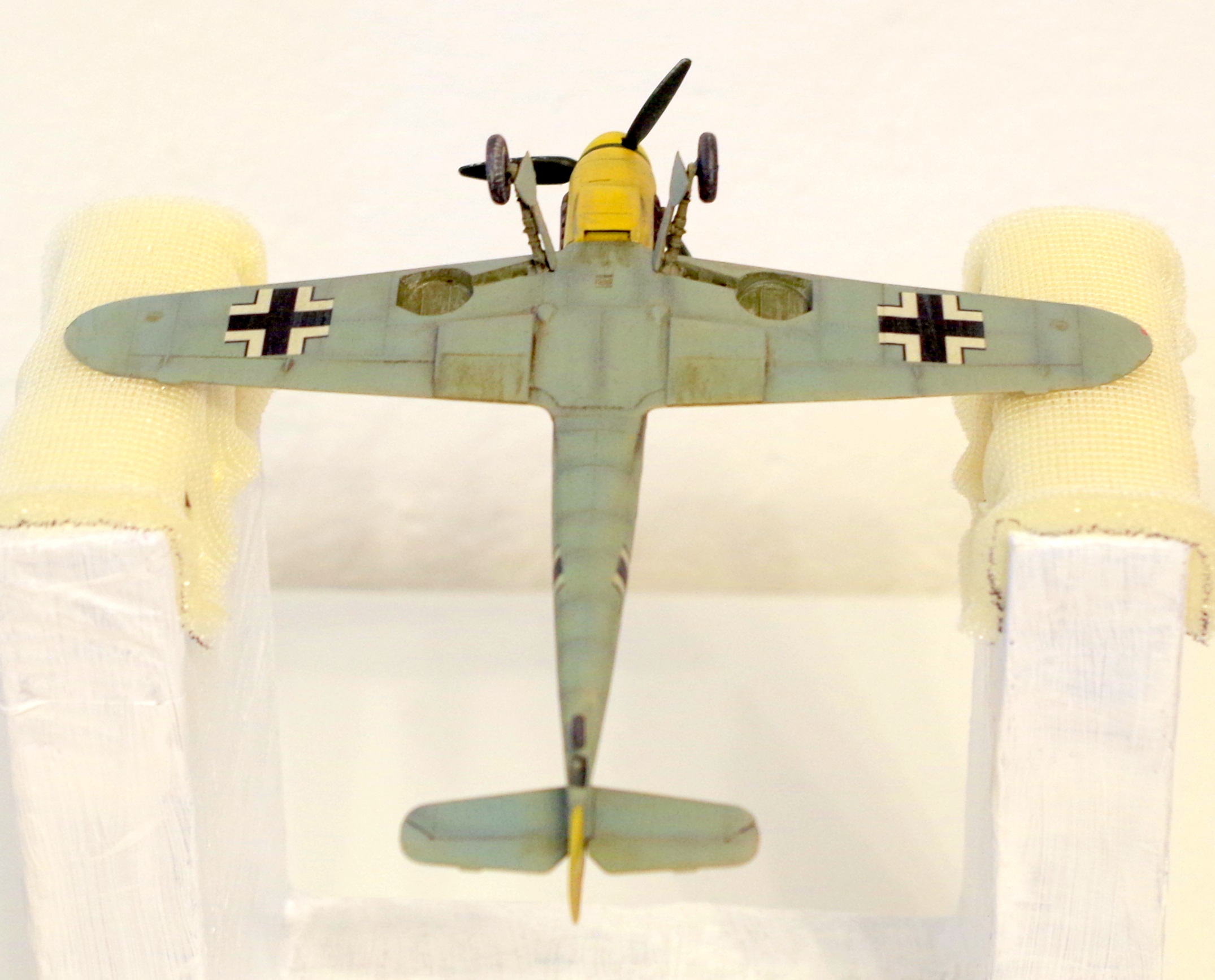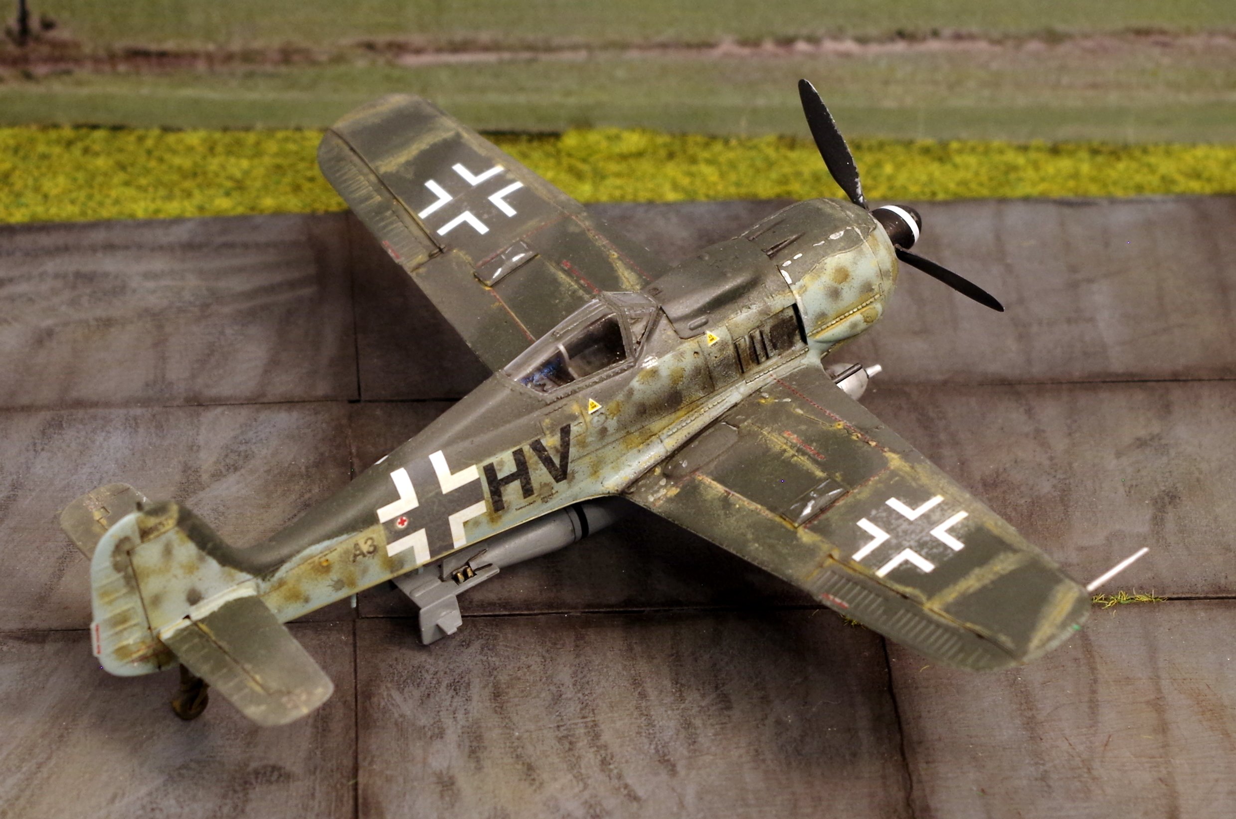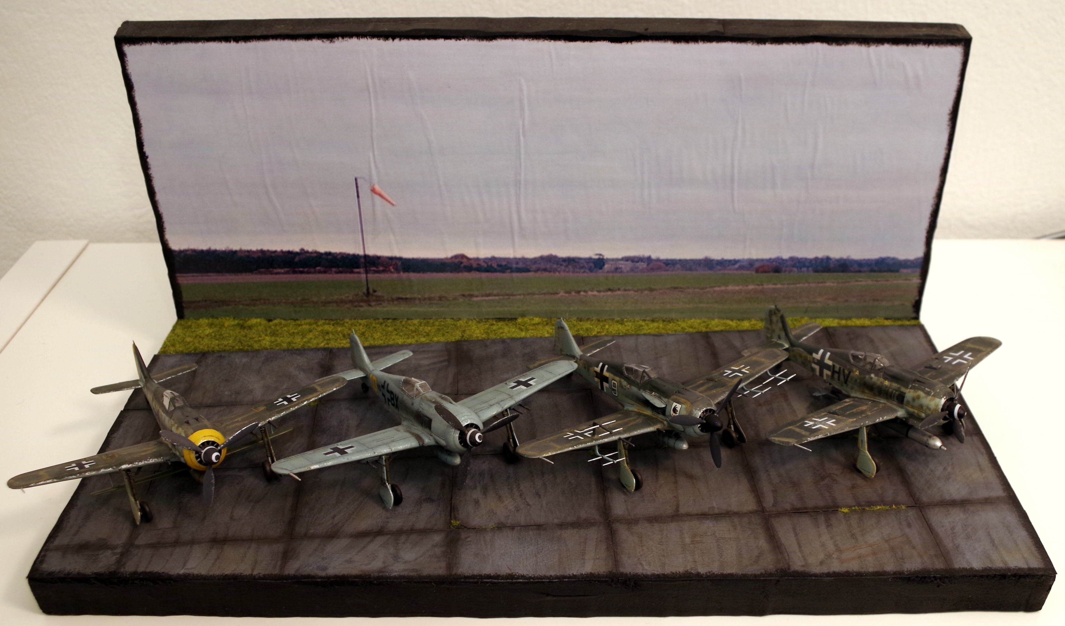 Danach eine Focke-Wulf Fw 190 A-8 R1 mit zwei Waffenbehältern mit jeweils zwei MGs. Die Lackierung ist bei dieser Variante zwar etwas eintönig (komplett in RLM 76), aber auch das hat seinen Reiz. Für die Lackierung bietet sich ein Preshading geradezu an, das noch ganz subtil durchscheint.