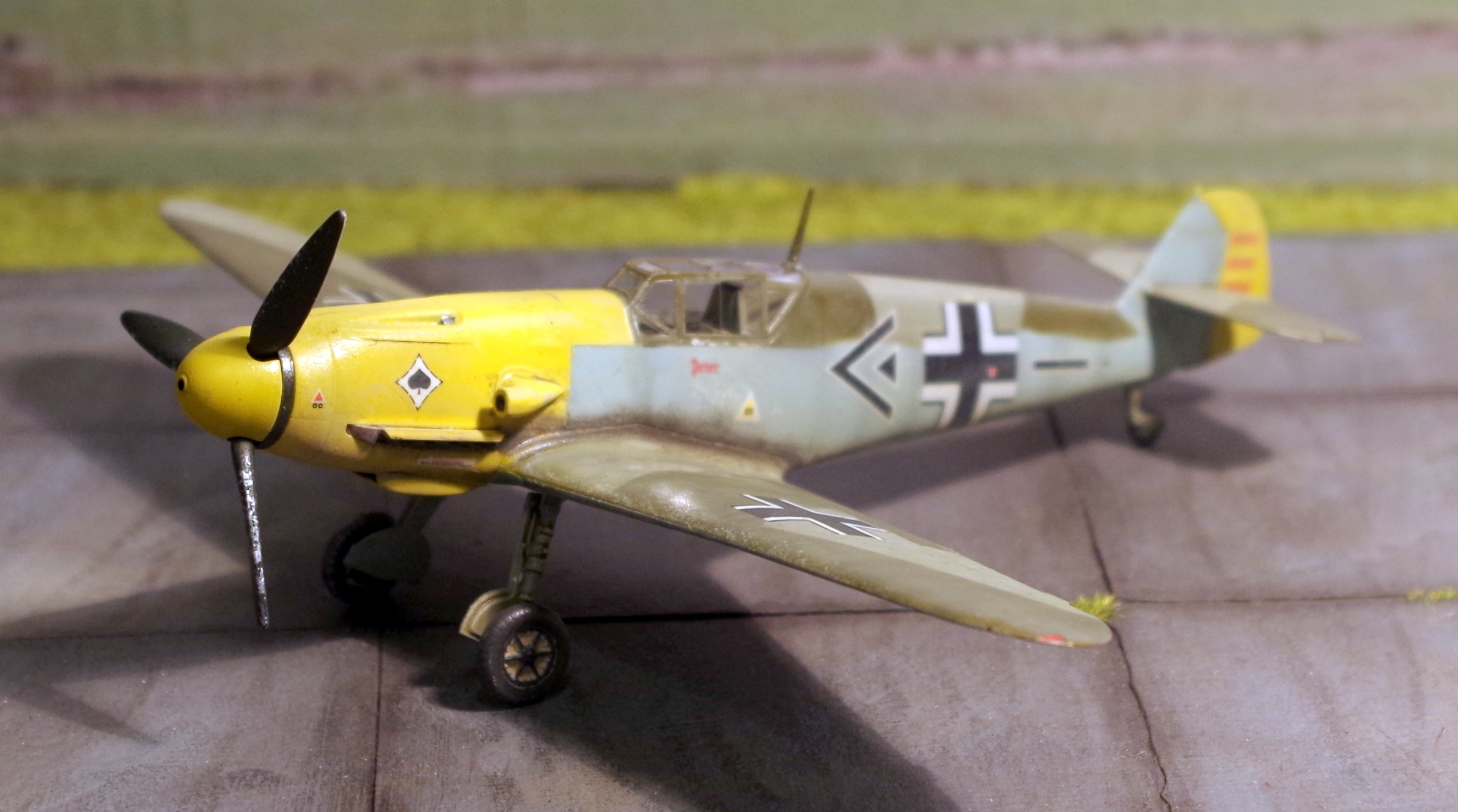 Der Bausatz ist für den kleinen Maßstab ganz ordentlich detailliert. Er ließ sich problemlos zusammenbauen. Besonders gut gefällt mir das auffällige Farbschema mit der gelben Motorverkleidung und dem gelben Seitenleitwerk.