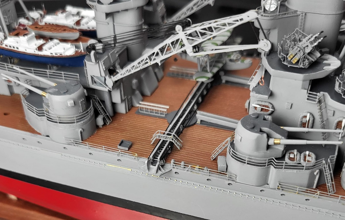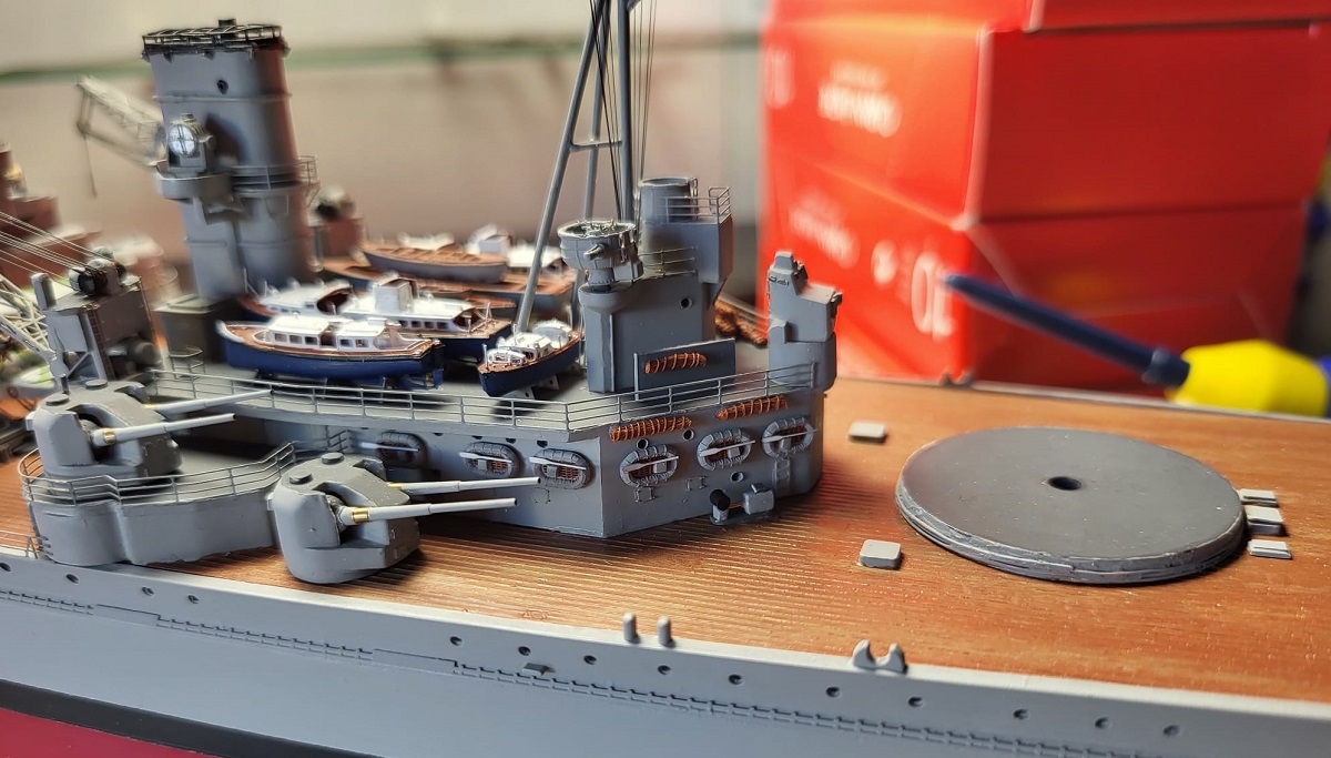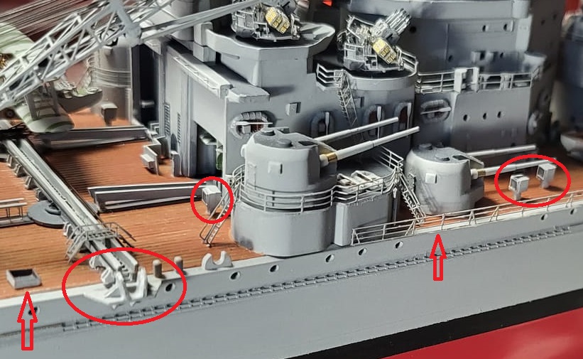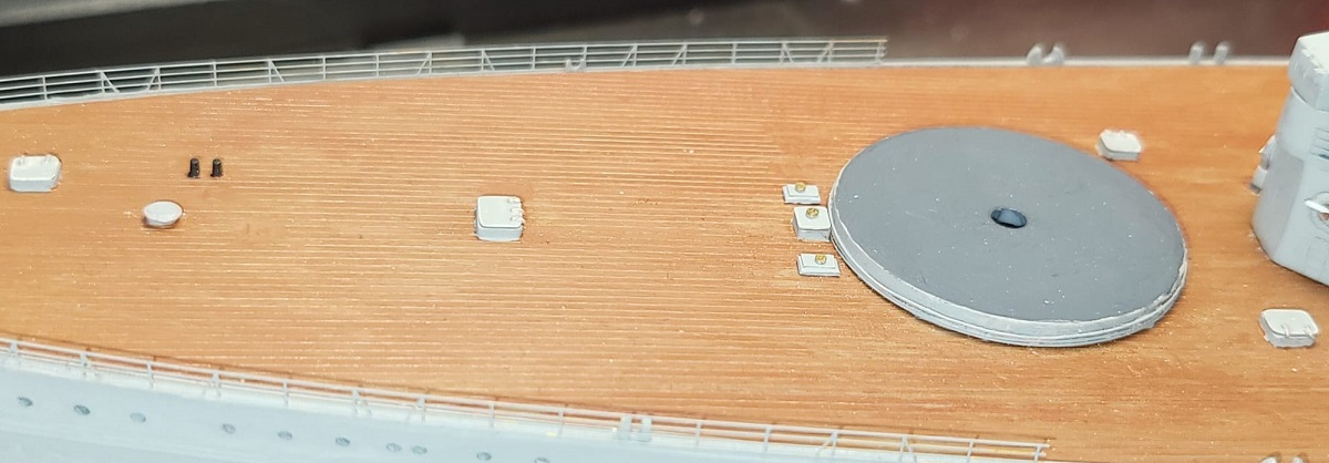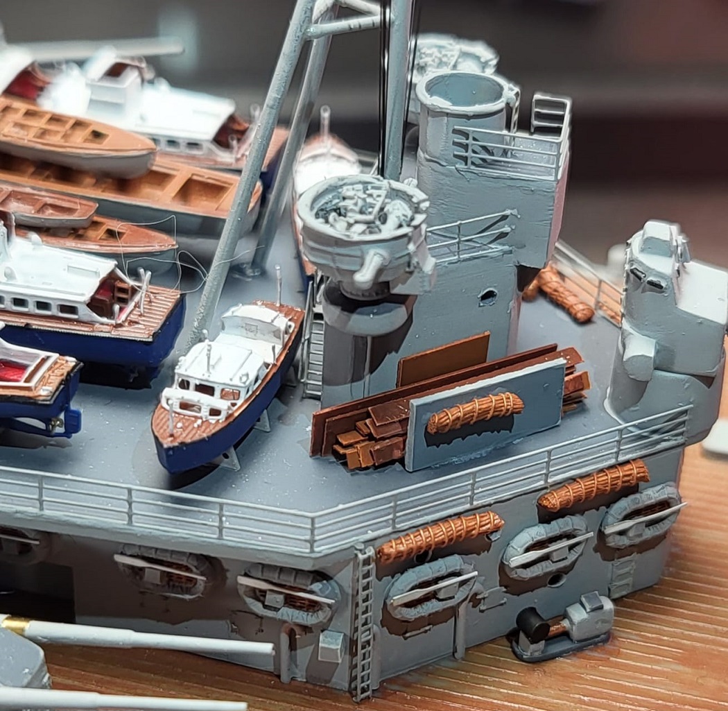 werde weiter von forne nach hinter die fehlender details anbauen und die railings werden angebracht when alle Deckdetails fur das Teil des schiffes angebracht worden sind, beide Schiffseiten sind auf gleiche höhe gebracht und da SO viele Sachen schönn da sind, habe die neue angedeutet