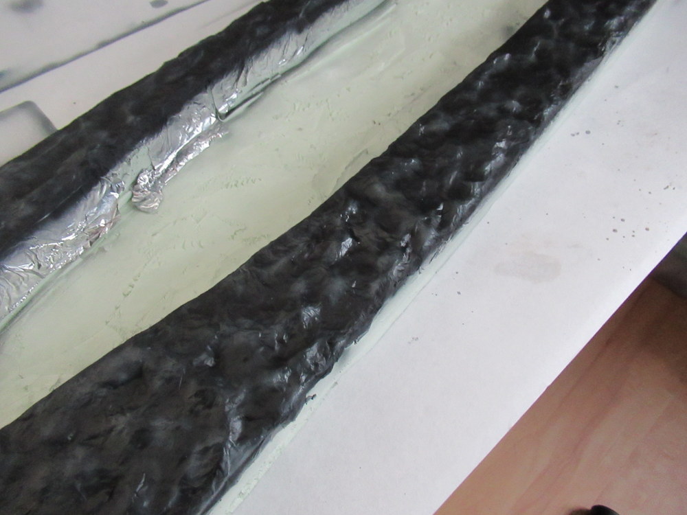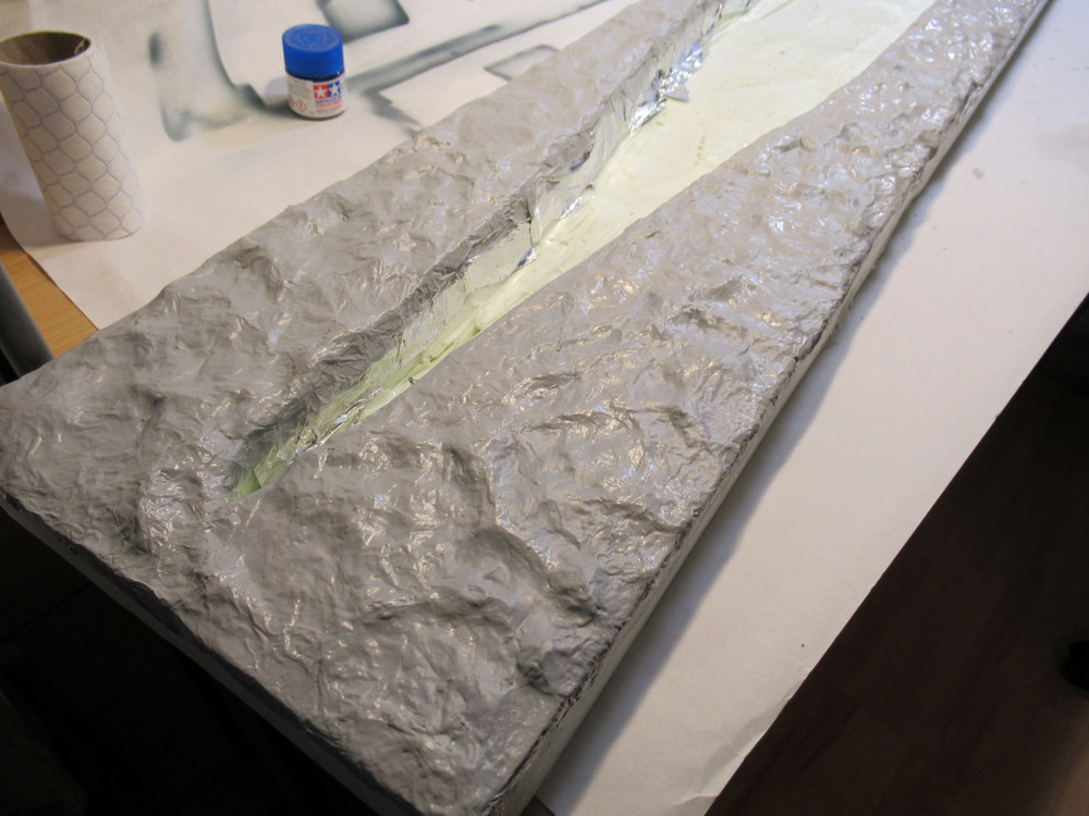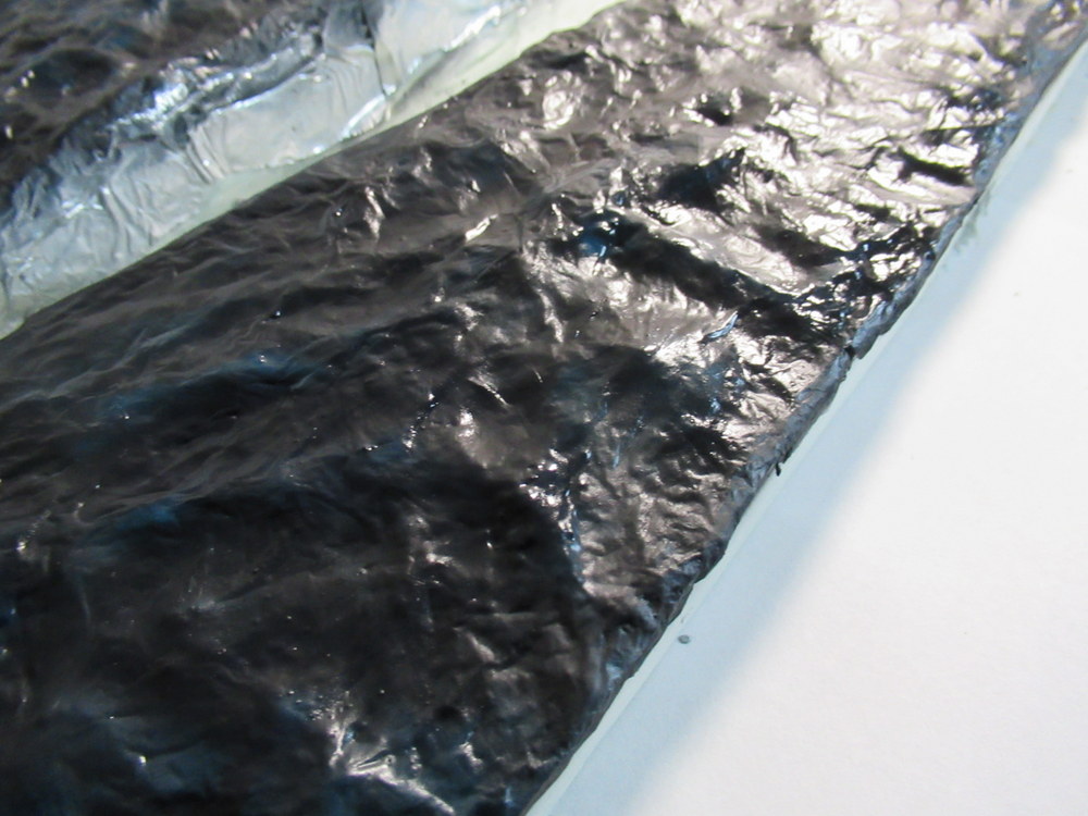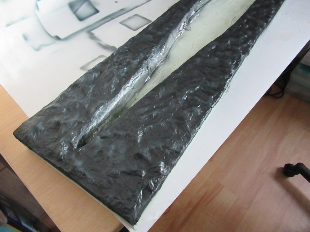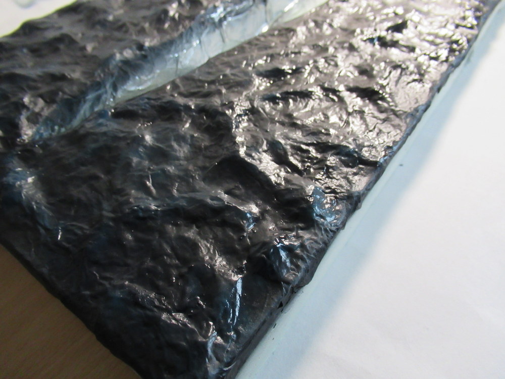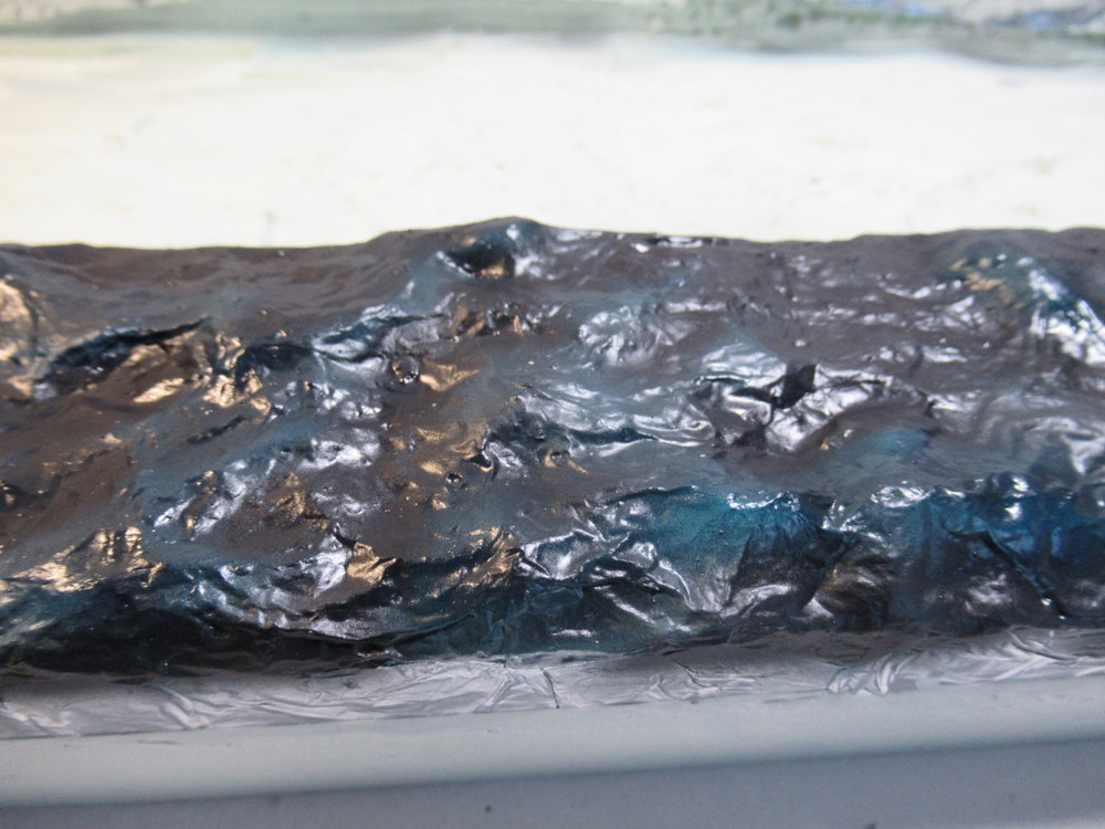 Als nächstes dann mit Alufolie die Wellen erstellt . Diese werden dann mit Holzleim aufgelkebt. Das Ganze dann wieder mit Holzleim eingepinselt um dann eine gesamte Bahn Alu aufzubringen. Dient dazu die harten Kanten zu reduzieren.