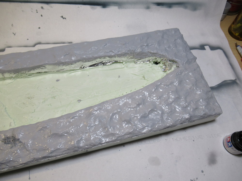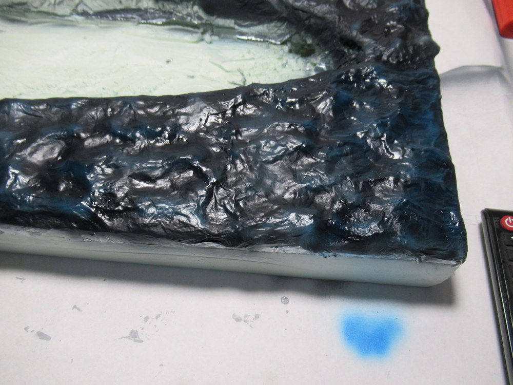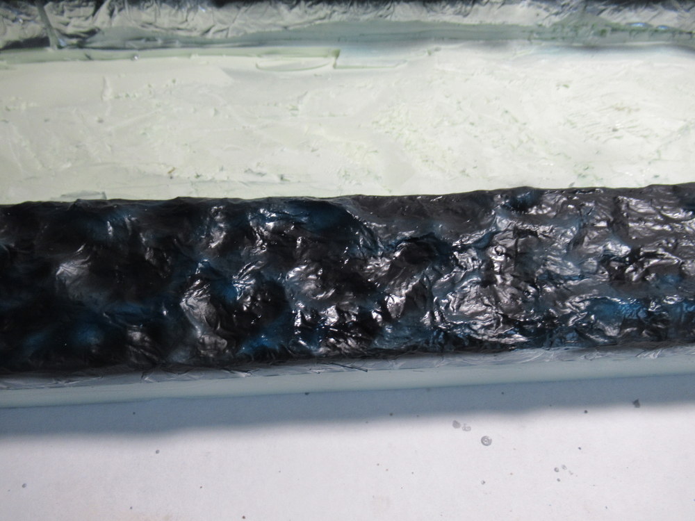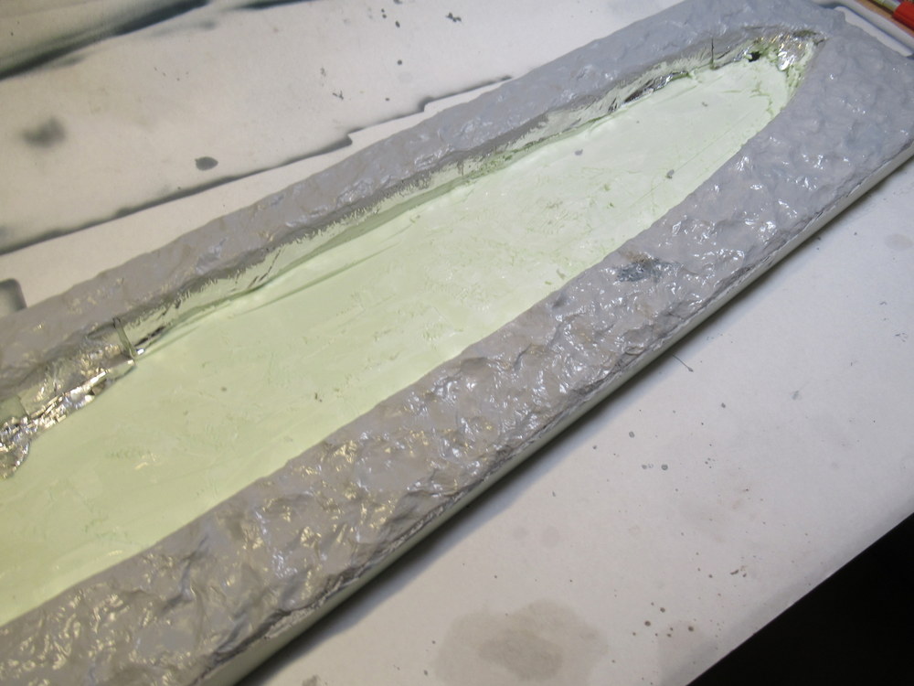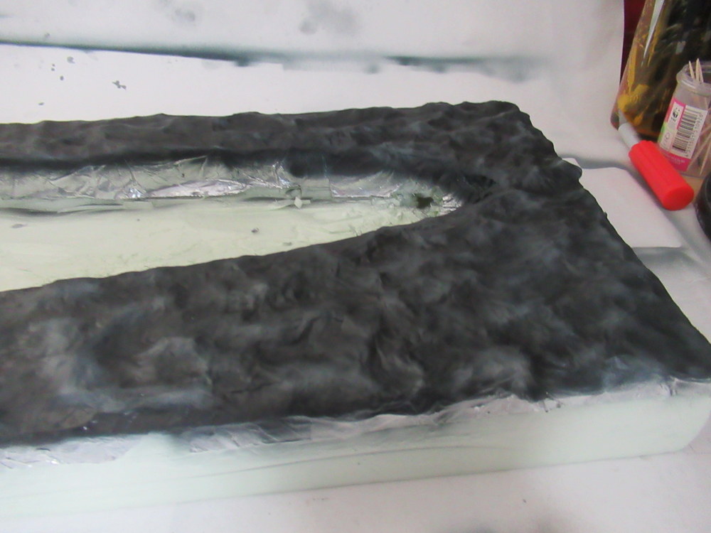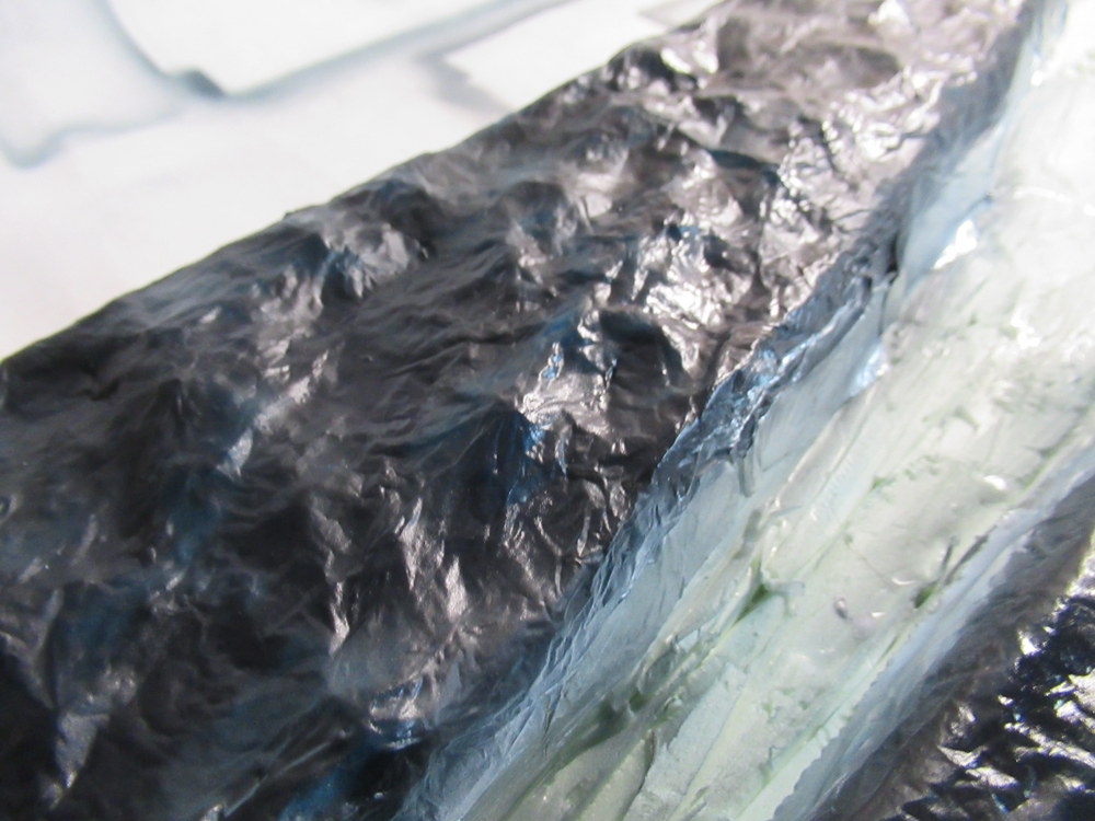 Als nächstes dann mit Alufolie die Wellen erstellt . Diese werden dann mit Holzleim aufgelkebt. Das Ganze dann wieder mit Holzleim eingepinselt um dann eine gesamte Bahn Alu aufzubringen. Dient dazu die harten Kanten zu reduzieren.