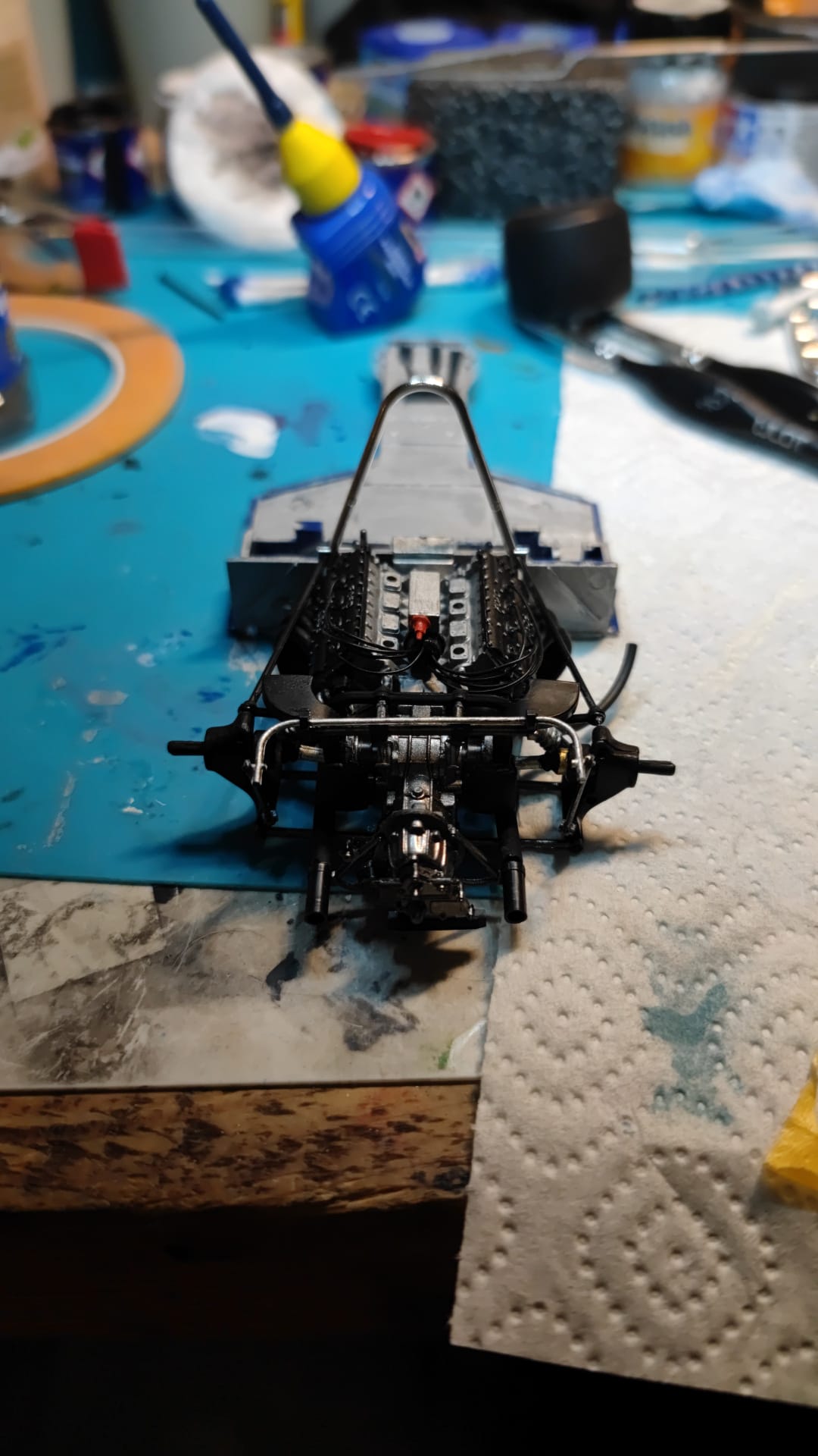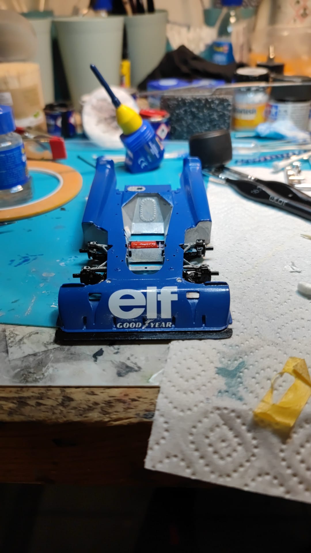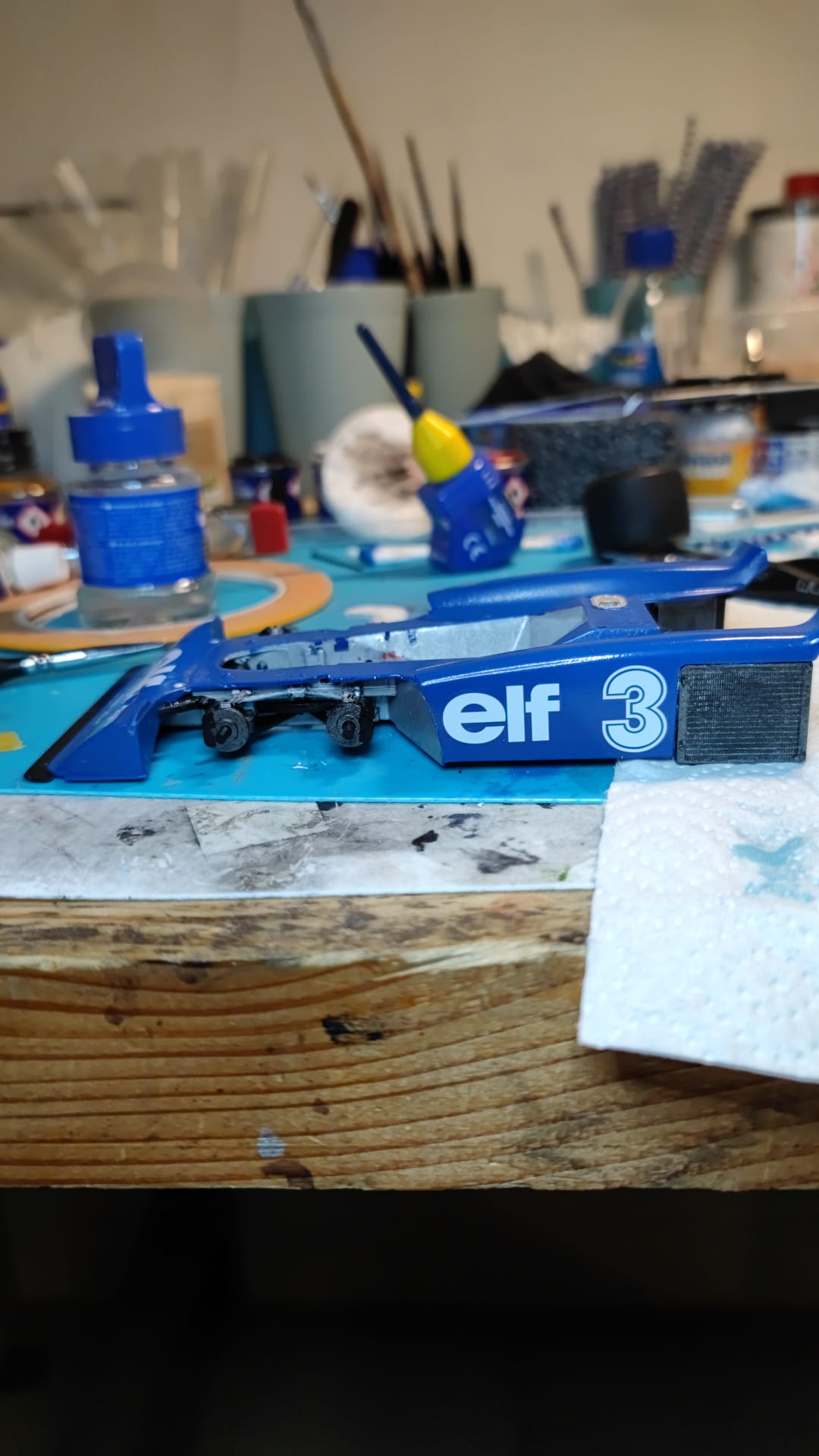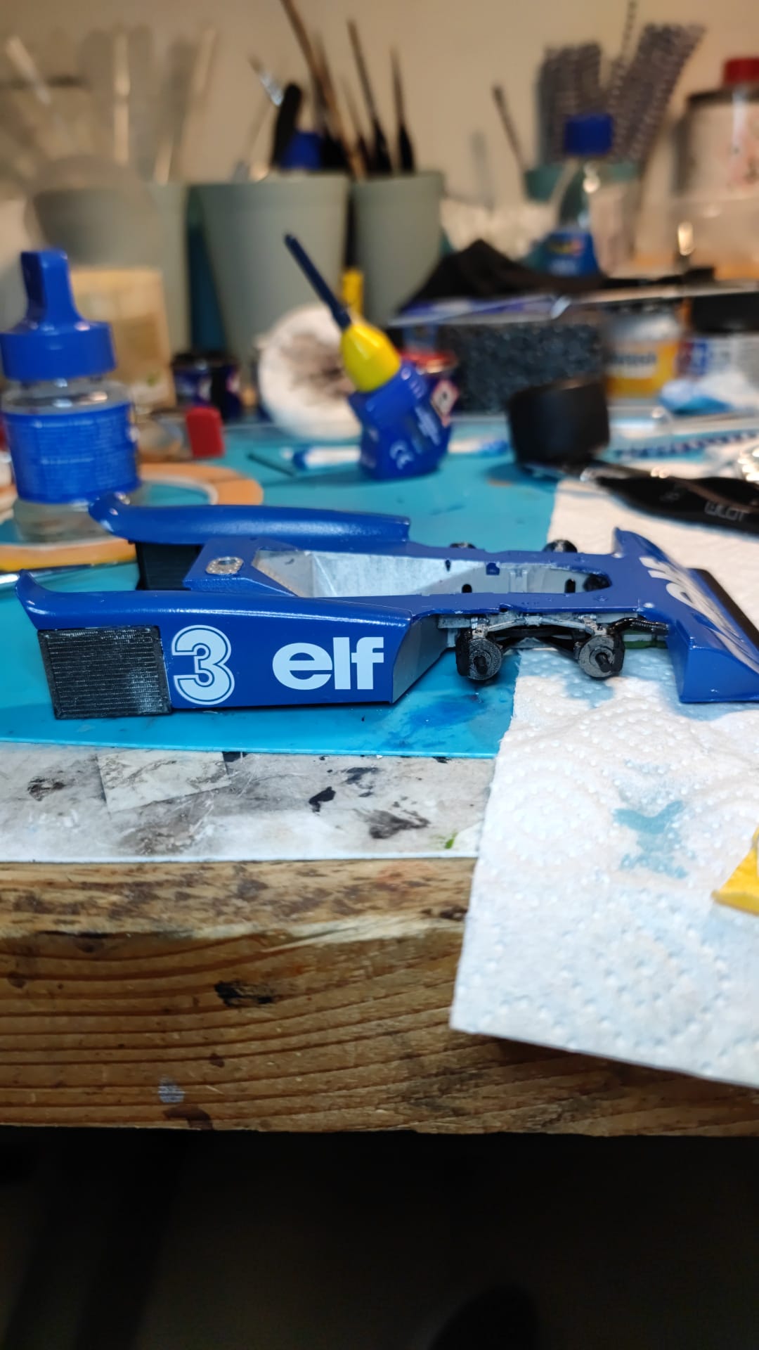 Schön, aber weil wohl zu alt, hat sich die "3" am Frontflügel beim aufbringen in zig Teile zerlegt. Die wird dann am Ende fehlen