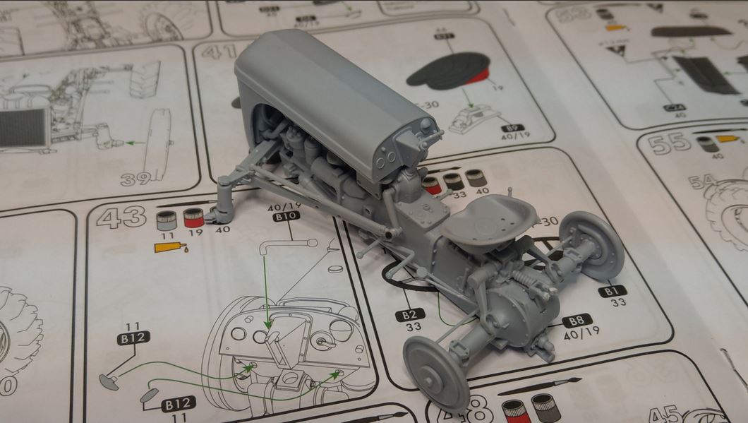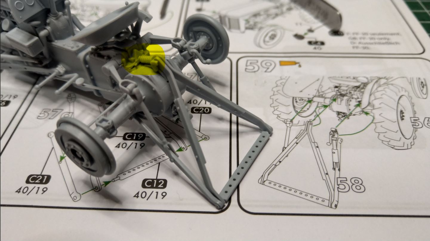 Dann habe ich den Heller "le petit gris" angefangen. Lenkung vorne komplett beweglich umgebaut, Motorhaube ebenfalls (muss man innen einiges weg nehmen, damit die am Kühler vorbei geht) und auch hinten das Geschirr beweglich gemacht. Wäre diese Feder nicht fest, würde das auch beweglich sein..... Die Hinterräder gehen mal überhaupt nicht zum Drehen. Da werde ich nicht schlau daraus, wie das gedacht war.....