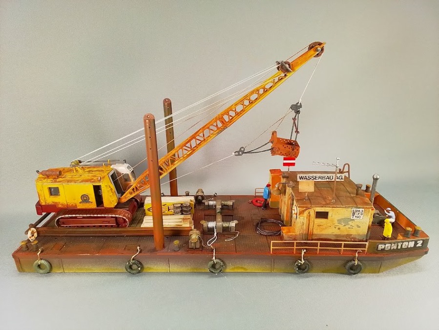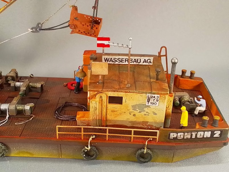 Ein Arbeitsponton mit Schürfbagger im Maßstab 1: 87. 1:87 ist ja eigentlich ein Maßstab aus dem Bereich der Modellbahn. Bei meinen Recherchen zu einem Ersatzteilträger für den Hafenschlepper fand ich auf einem Flohmarkt diese etwas ungewöhnliche Modell.
