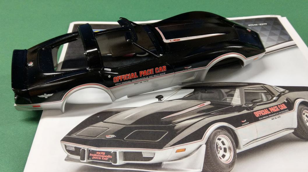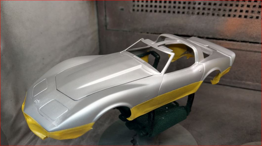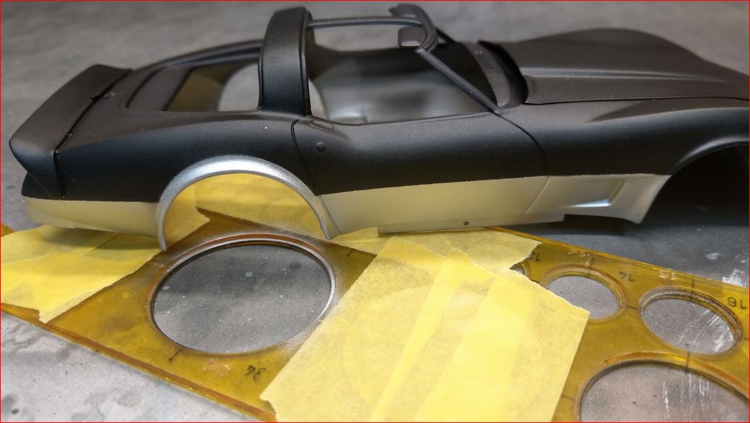 Das Silber geht bis zu dem Knick des Heckbumpert und vorne bis zu der kante, wo die Nase in die Haube übergeht. An den Seiten ist die Corvette zwar runder, aber man erkennt recht gut, wo die Trennung sein soll. Das ist im Grunde die breiteste Stelle. Die Radläufe habe ich einfach mit einer Kreisschablone beilackiert. Wenn man das ohne die Radläufe lackiert, muss man "nur" die Decals sauber aufbringen. Die sind mit Silber und schwarz erweitert. Nach der "weniger" guten Erfahrung auf der Fahrerseite, sind die auf der rechten Seite einfach mit dem silbernen Rand auf dem Radlauf bündig angesetzt. Dann passen die perfekt und lassen sich einfacher aufbringen. Auch hier: erst vorne und hinten, bevor die Seiten drauf kamen. Man möchte die ja hinten und vorne gerade haben.