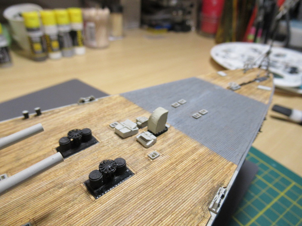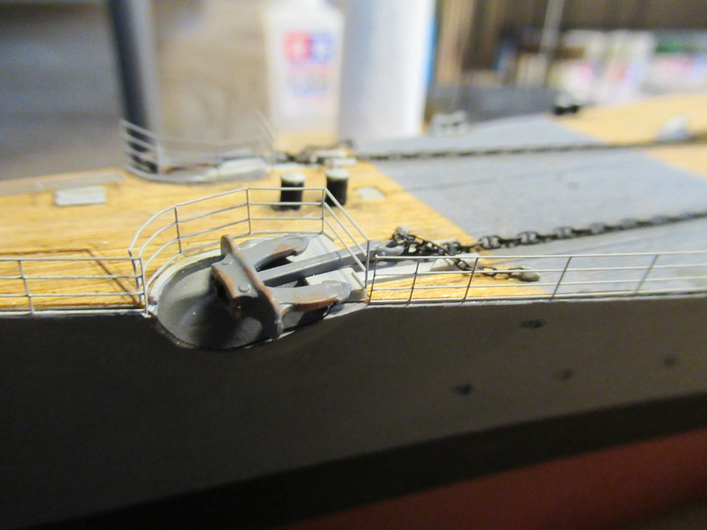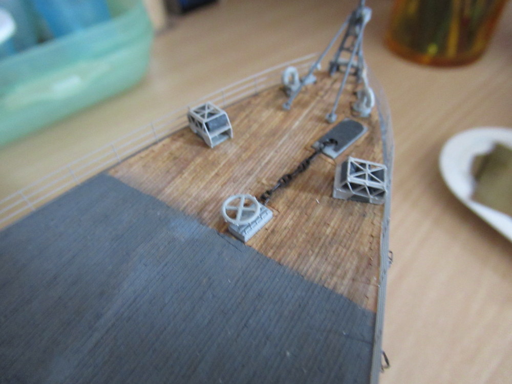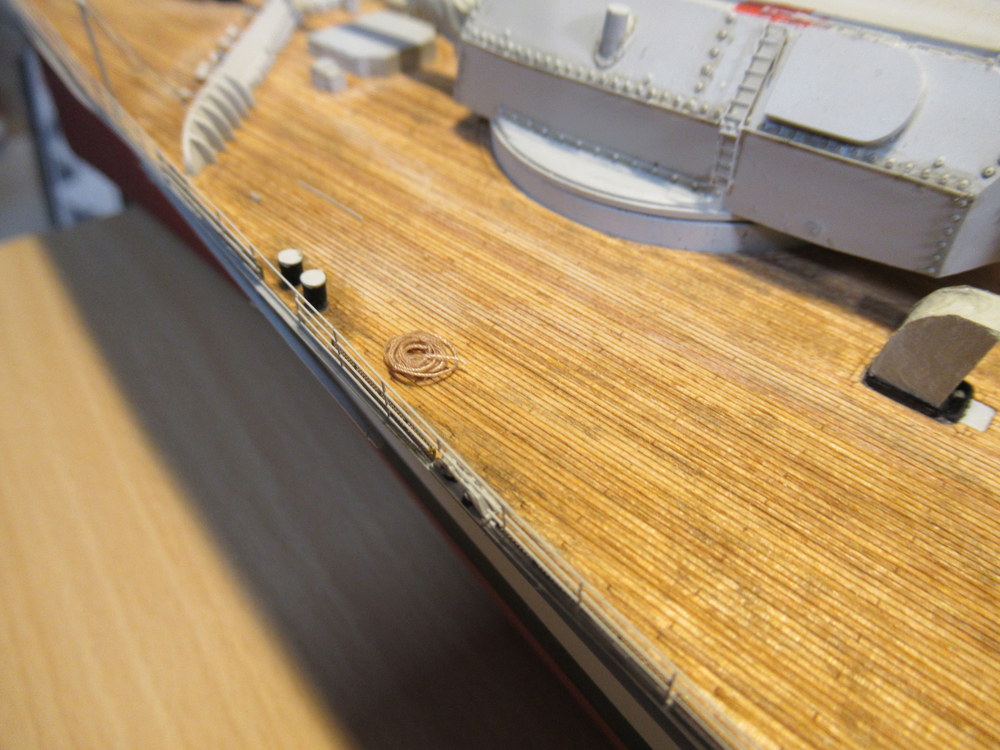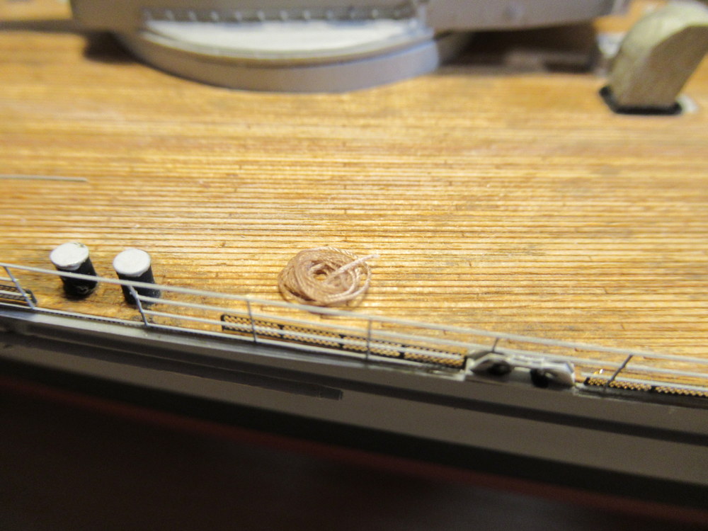 so ich melde mich auch mal wieder . Bei mir stand die äussere Reeling an . Die Reeling selber war recht schnell angeklebt . Es ist ja im Grunde auch nur ein gerades Stück . Als die linke Seite dran war , kam dann die Überlegung , was ich alles dran baue .