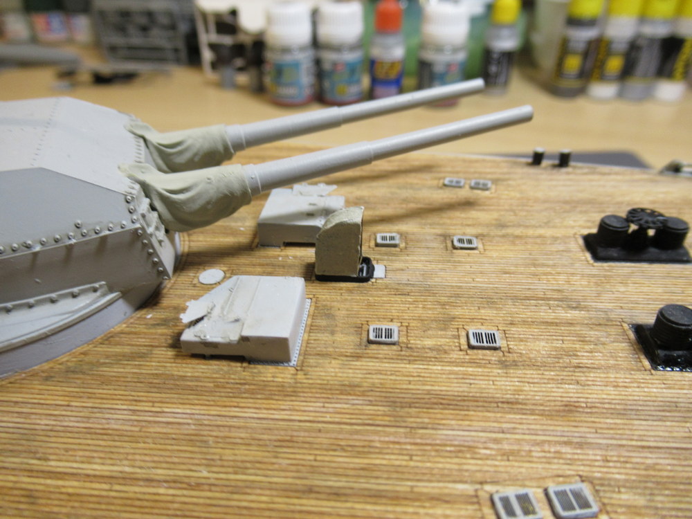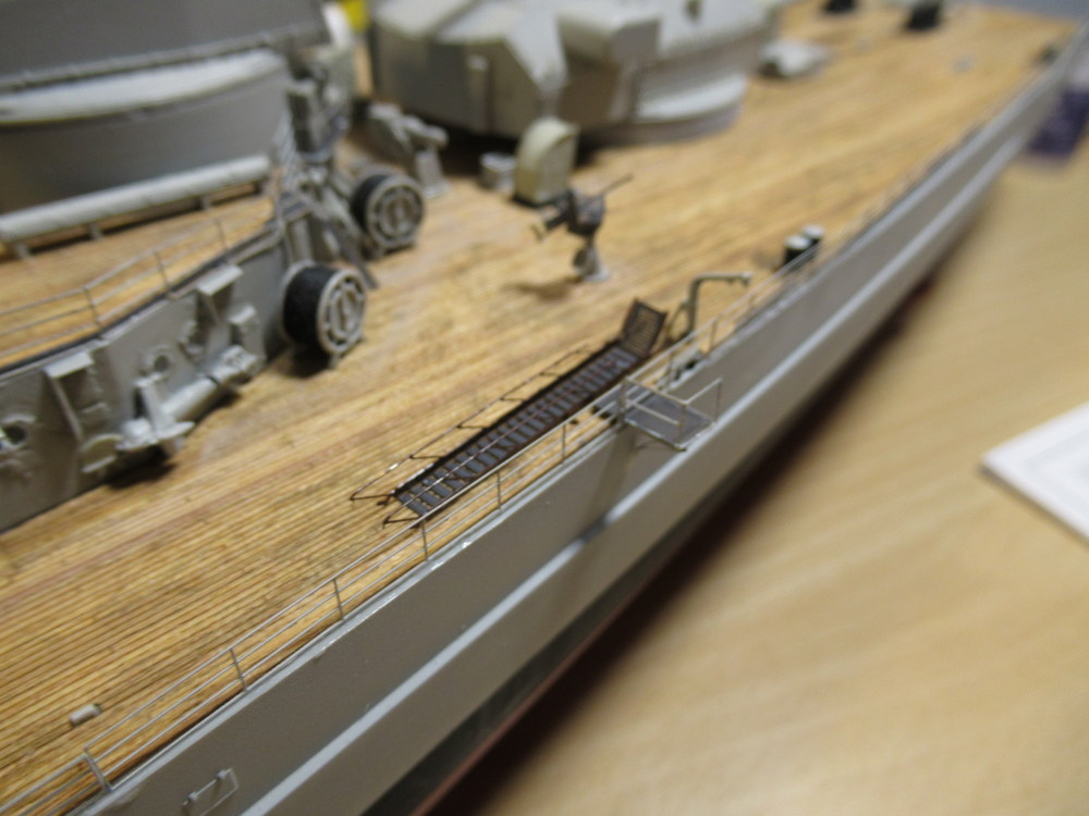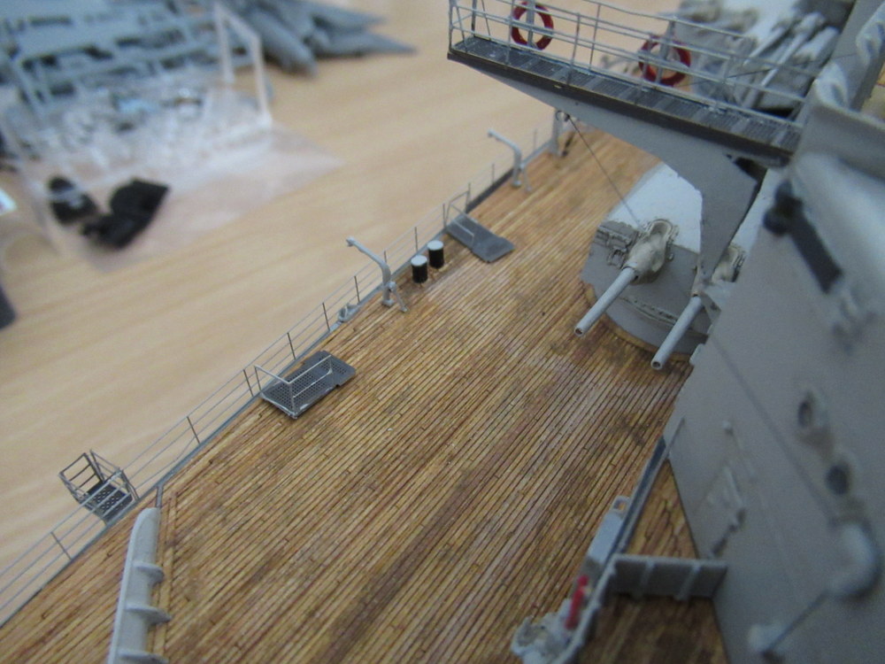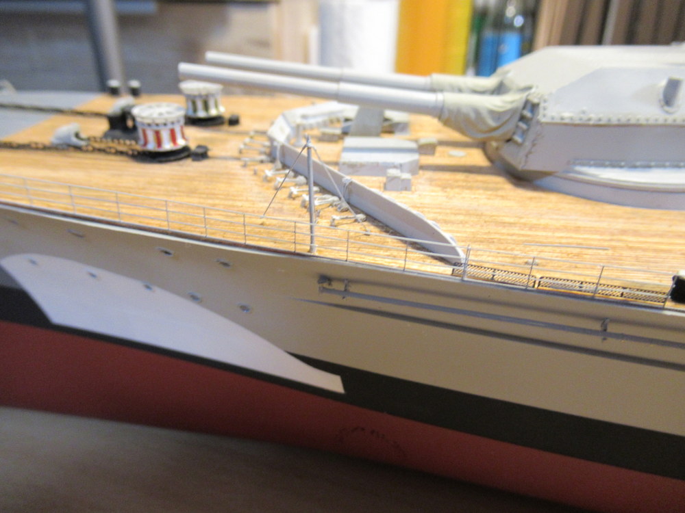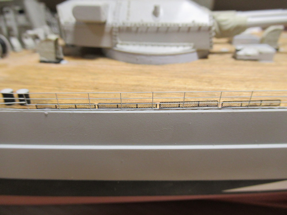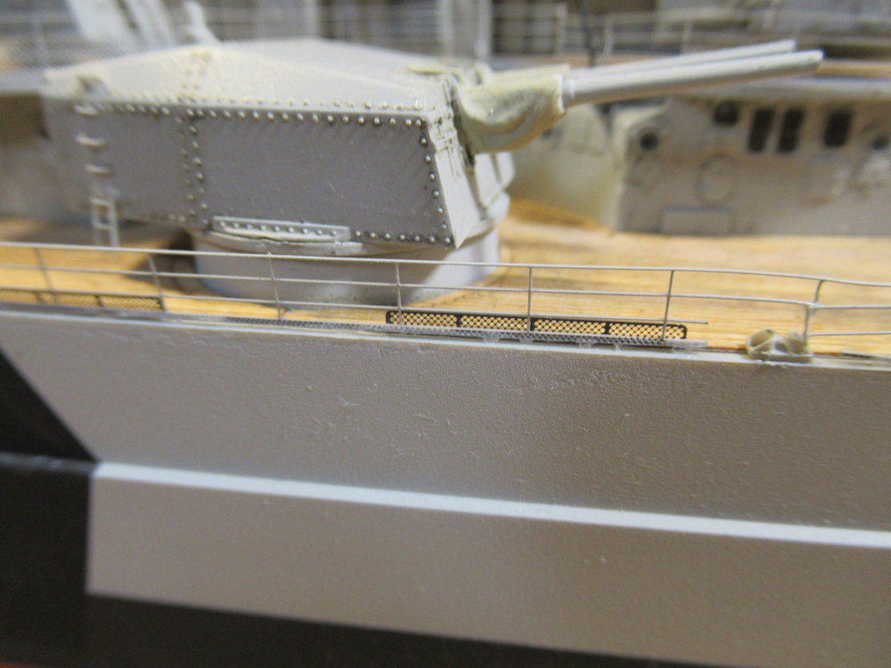 Auf den letzteren Fotos ist die Reeling zu sehen . Zusätzlich sind noch im Bereich der Geschütztürme weitere kleinere Gitter angebracht . Diese wurden verbaut um zu verhindern , das die Hülsen ( Messing ) der Geschosse , die ausgeworfen wurden von Board rollten . Man kann sagen , eine Art Umweltschutz
