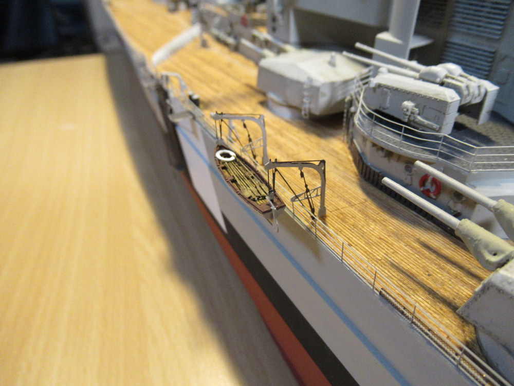 Bezüglich der Bismarck ist weiterhin ein wenig geschehen . Die Reeling auf der rechten Seite wurde fertig gestellt . Diverse Kleinigkeiten wie Ausleger etc verbaut . Auf der Sichtseite ( Links ) wurden auch noch weitere Kleinigkeiten hinzu gefügt .