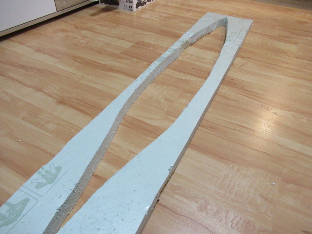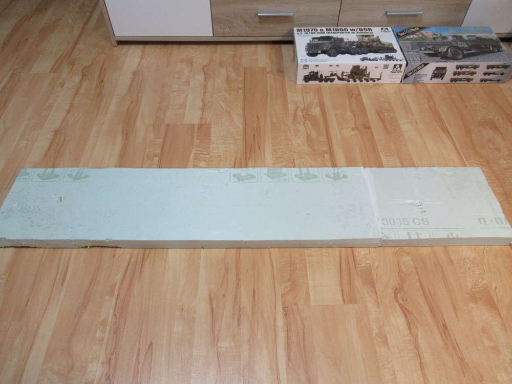Die Styrodurplatte war ja schon passend zugeschnitten . Da das so ein wenig unstabil ist , kam erst mal eine passende Bodenplatte ( 130 x 24 cm ) in 1 cm stärke .