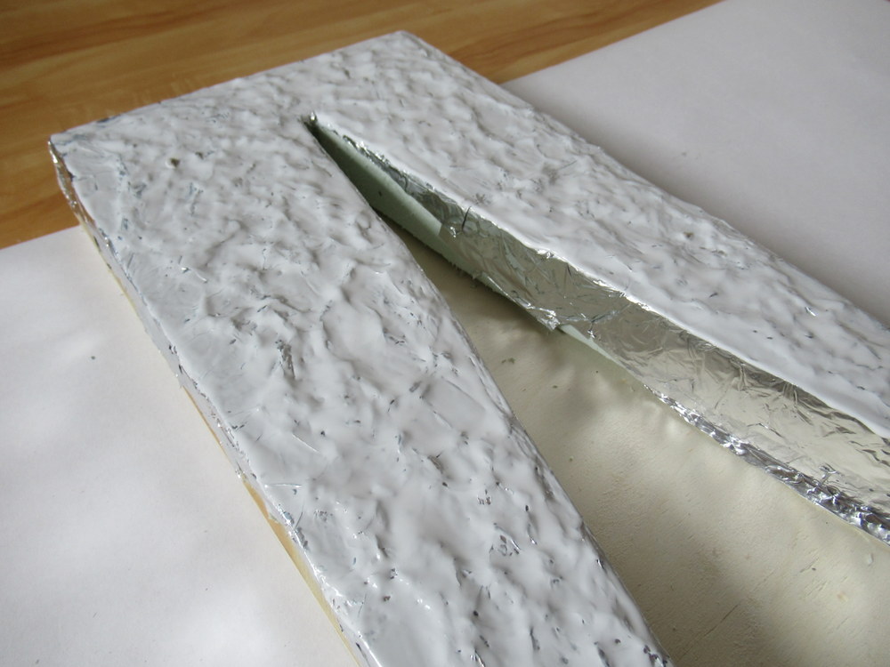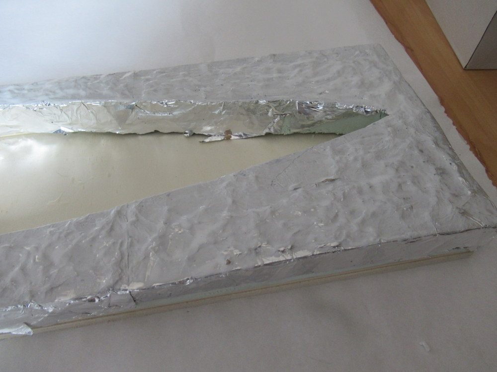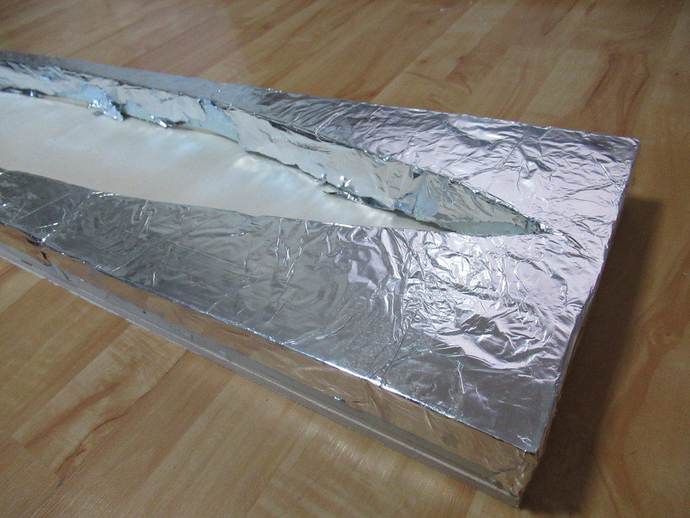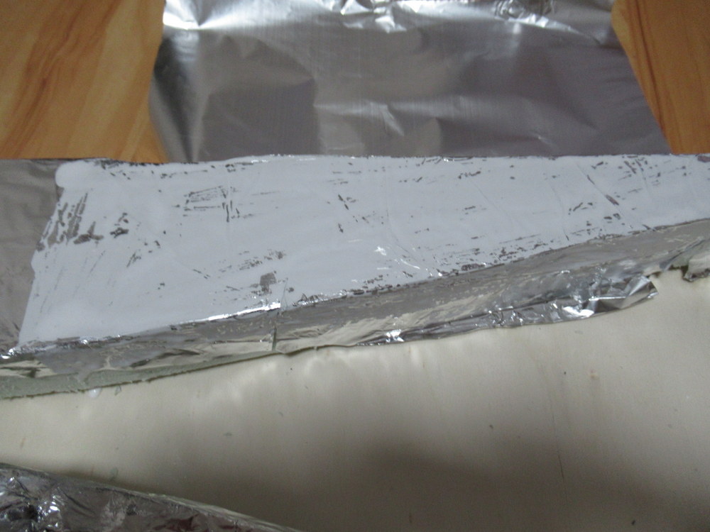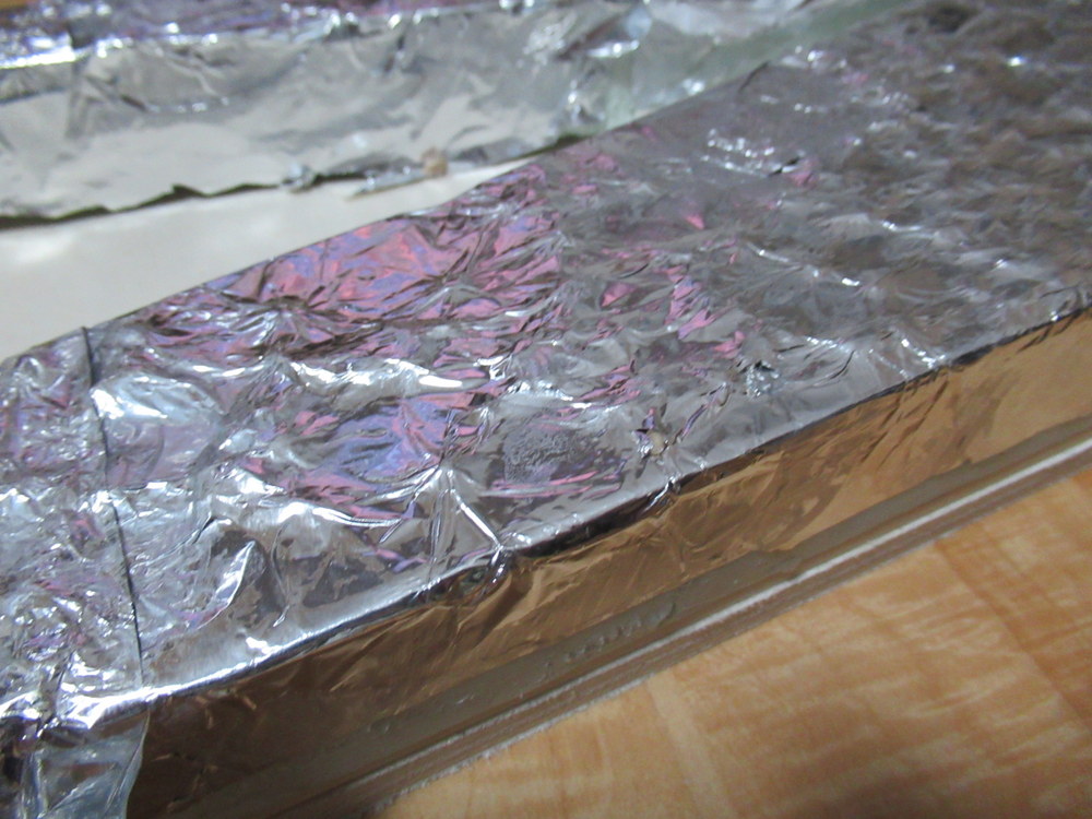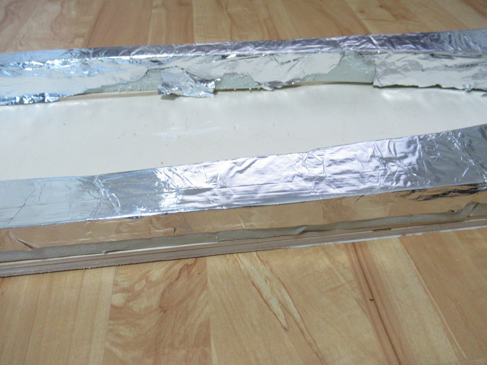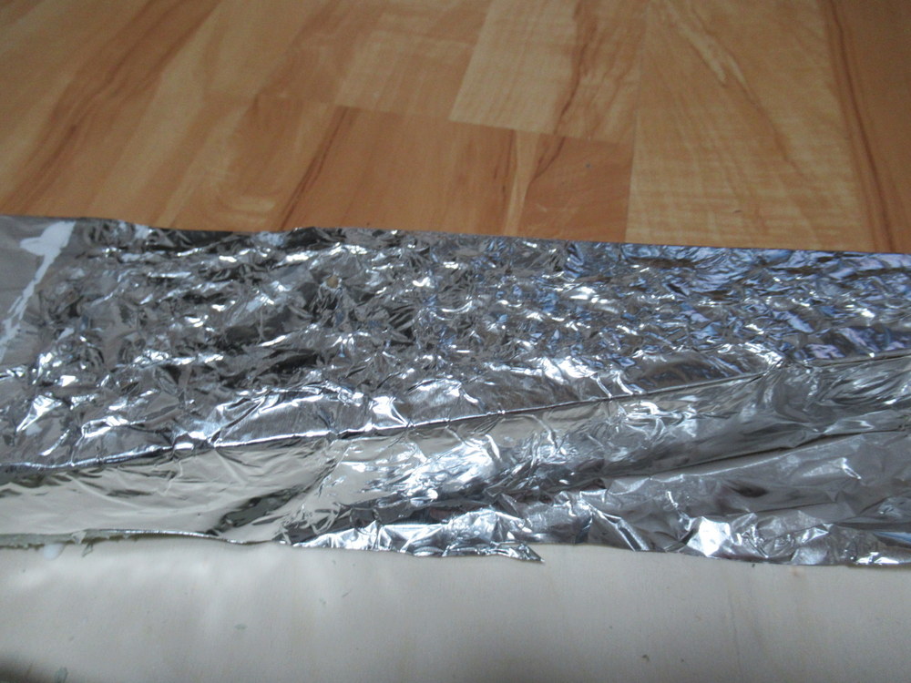 Auf das Styrodur kommt erst einmal eine Lage handelsübliches Alufolie . Das Styrodur wird mit verdünntem Holzleim